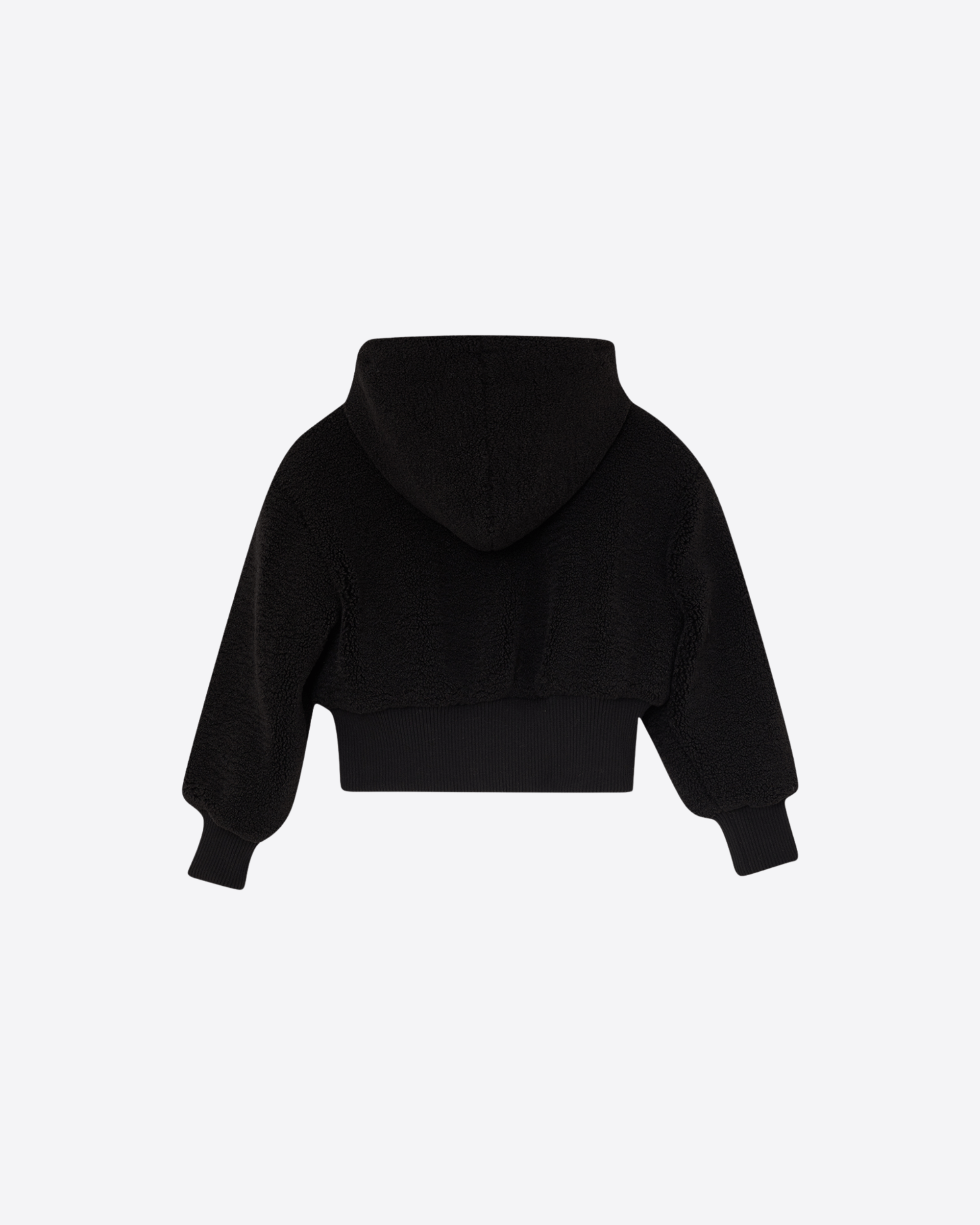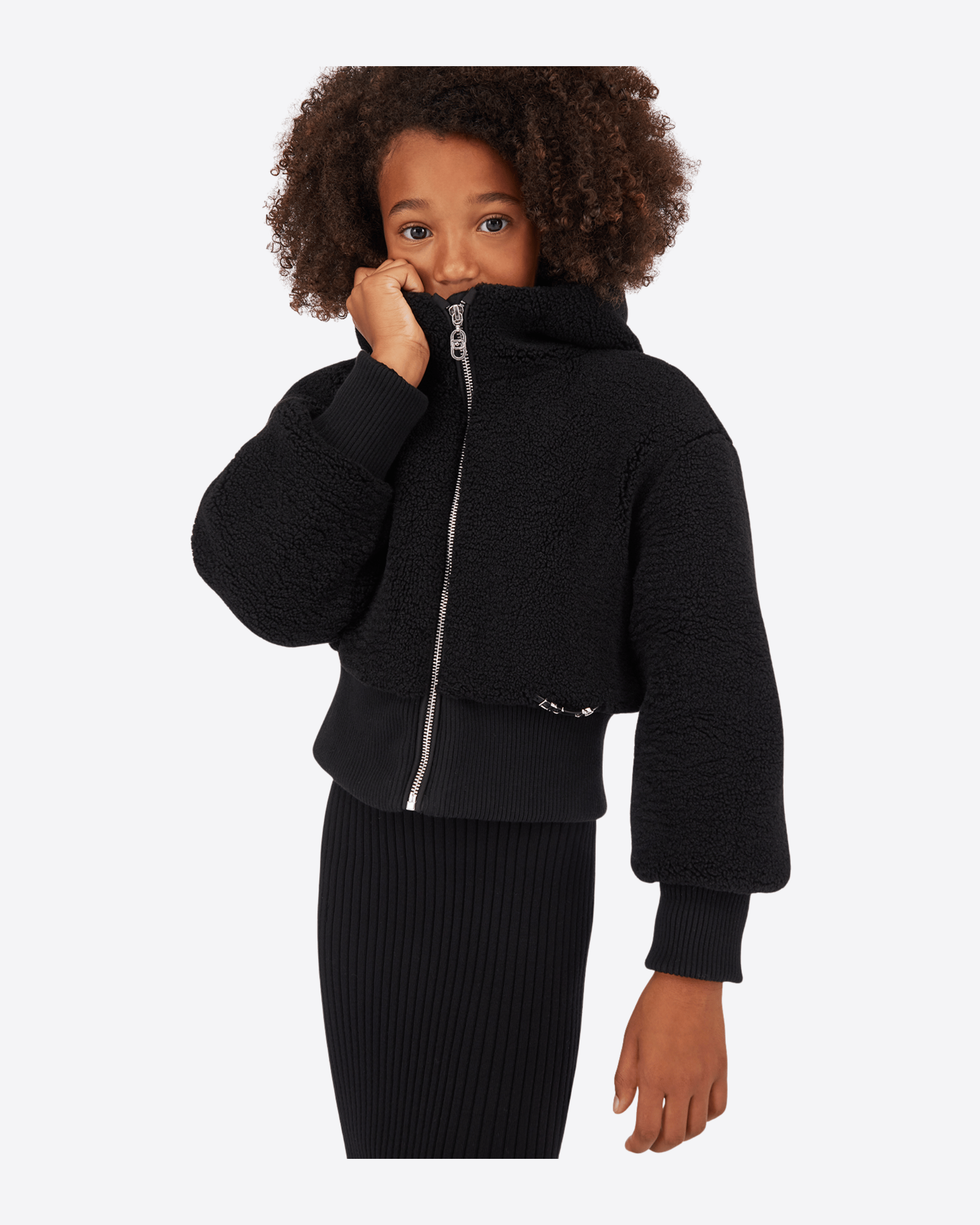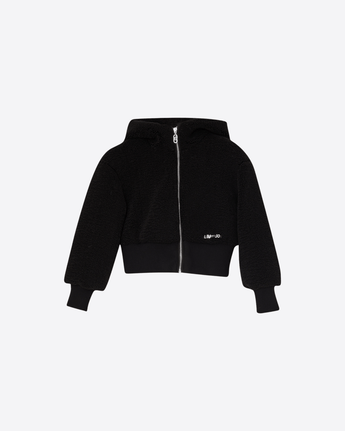 Giacca Liu Jo Bambina in tessuto teddy, con collo alto e cappuccio. Rifinita con polsi e fondo in maglia a costine, logo in metallo e chiusura con zip frontale.