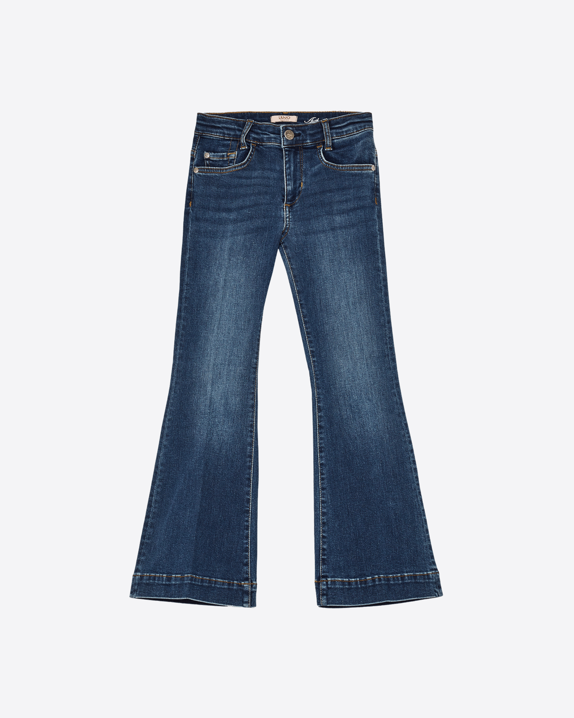 Jeans blu realizzati in denim di cotone stretch, caratterizzati da un lavaggio used che dona un aspetto autentico e vissuto. Presentano una vita alta e una gamba flare che valorizza la silhouette, ispirandosi allo stile anni ’70 in chiave moderna.