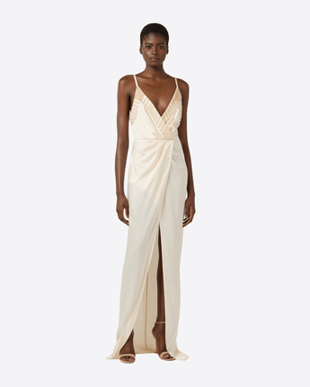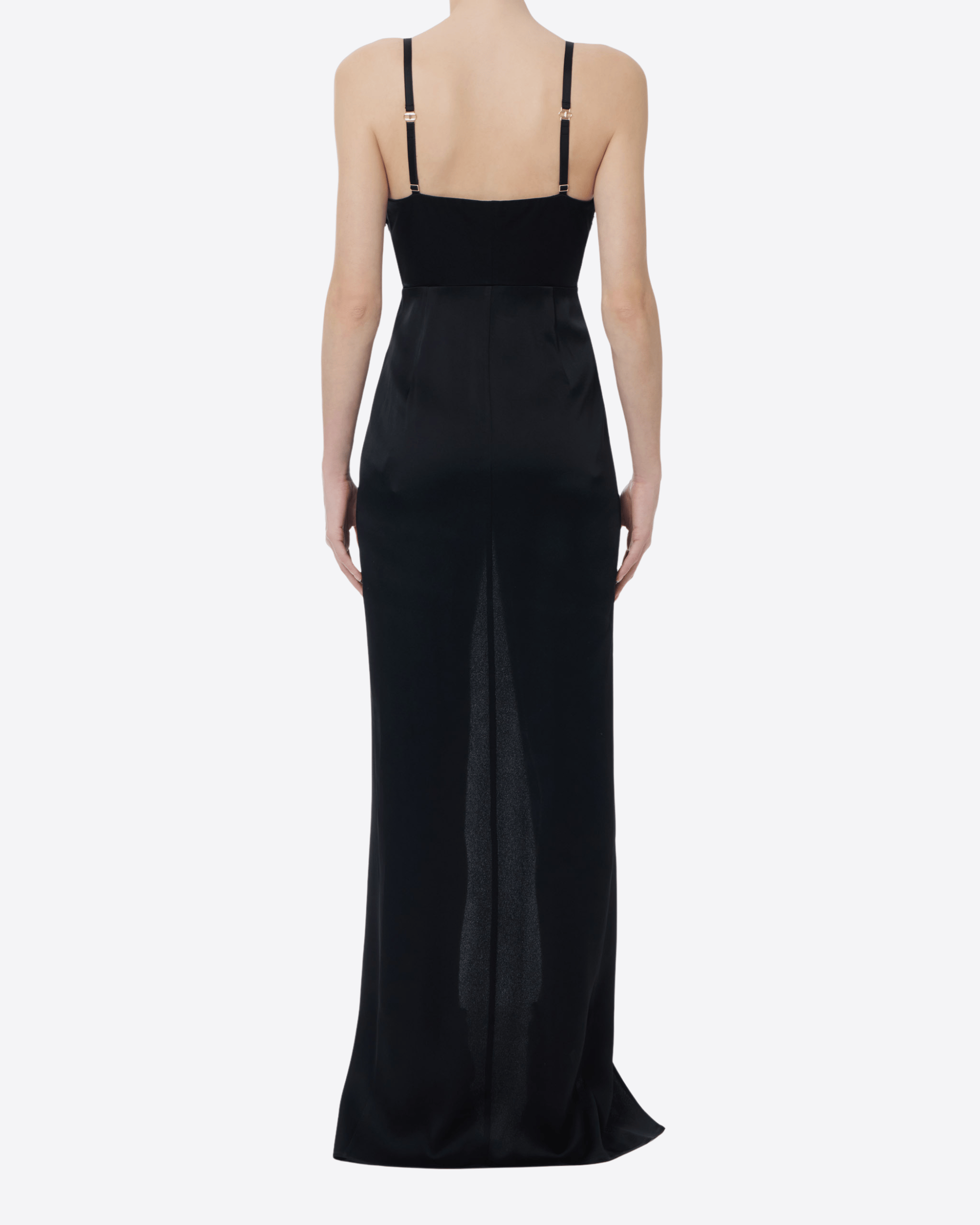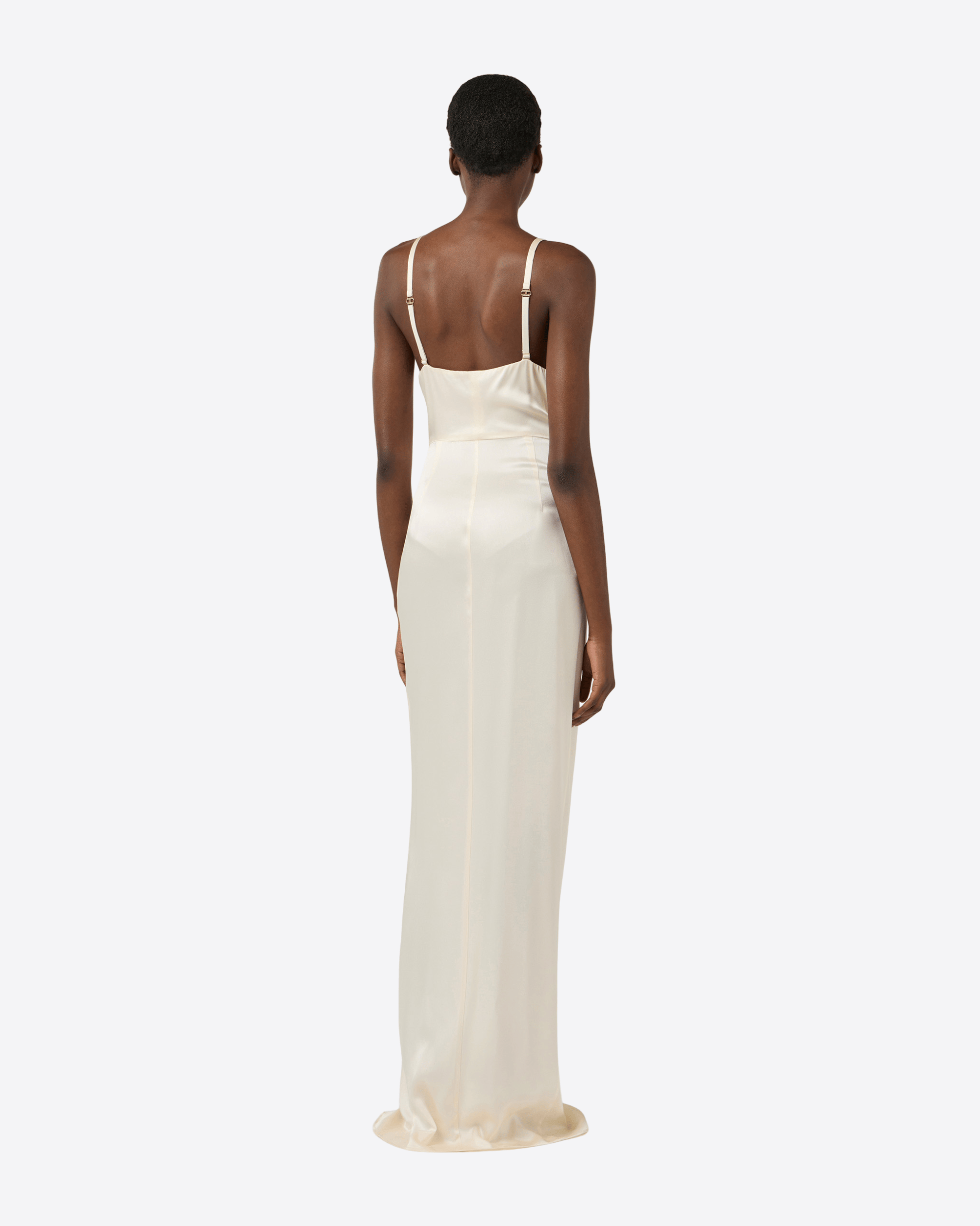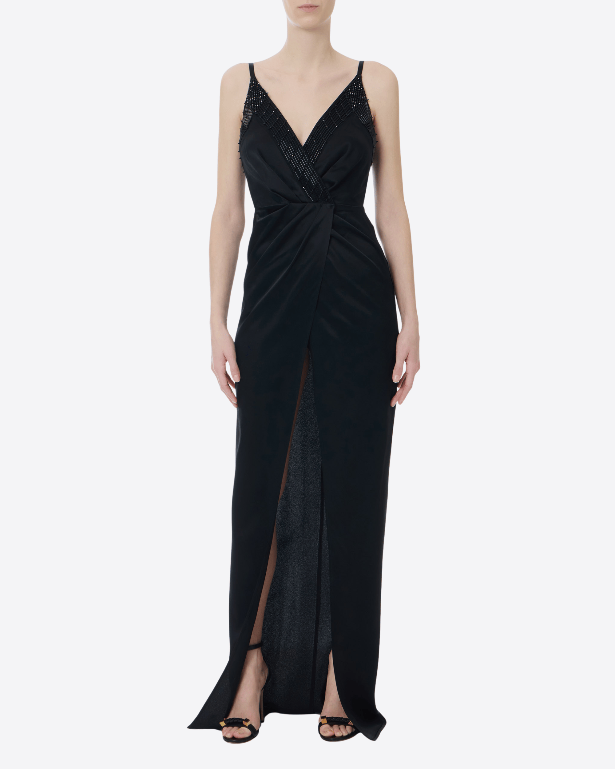 La gonna, con struttura a portafoglio, si apre in uno spacco centrale, aggiungendo movimento e sensualità alla silhouette. Un abito elegante e sofisticato, ideale per serate di gala e occasioni speciali.