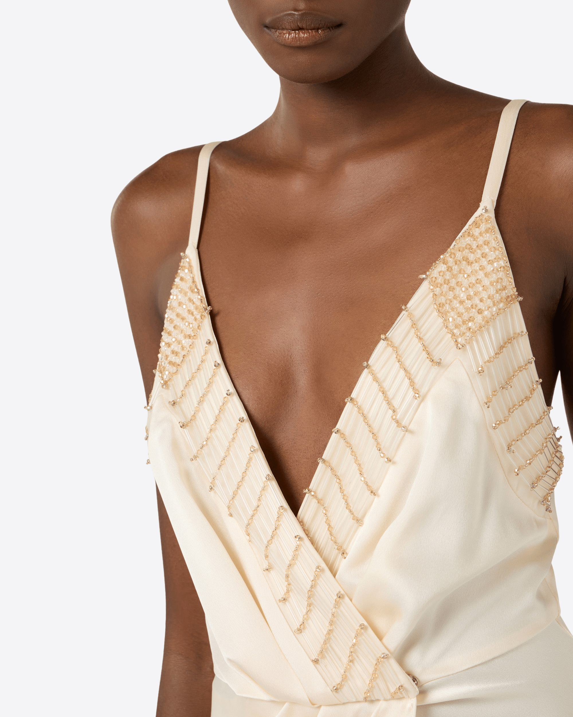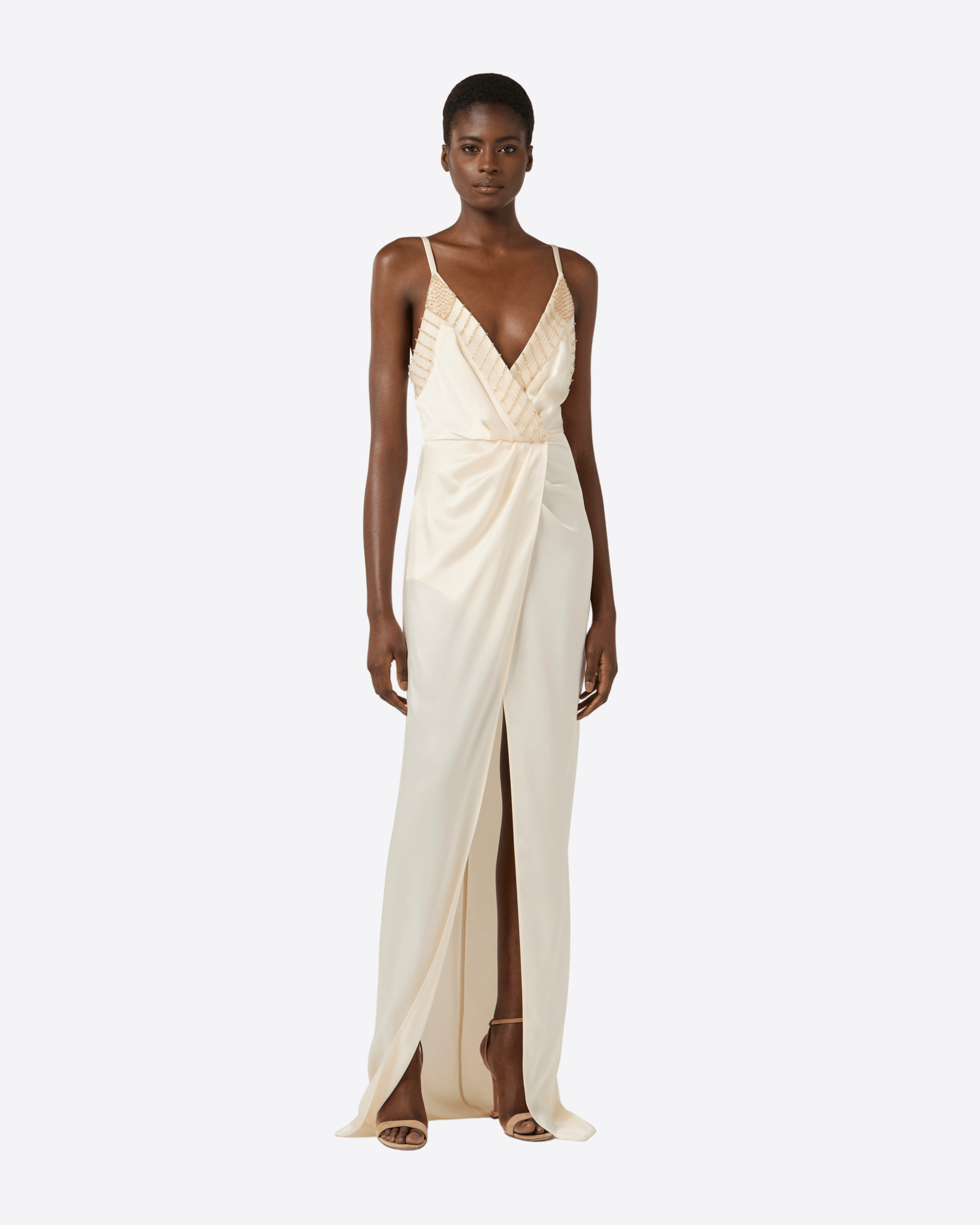 Abito da sera da donna Elisabetta Franchi in satin, dalla vestibilità slim. Il modello presenta spalline sottili e uno scollo decorato con cristalli ricamati a motivi geometrici, che conferiscono luce e armonia al design.