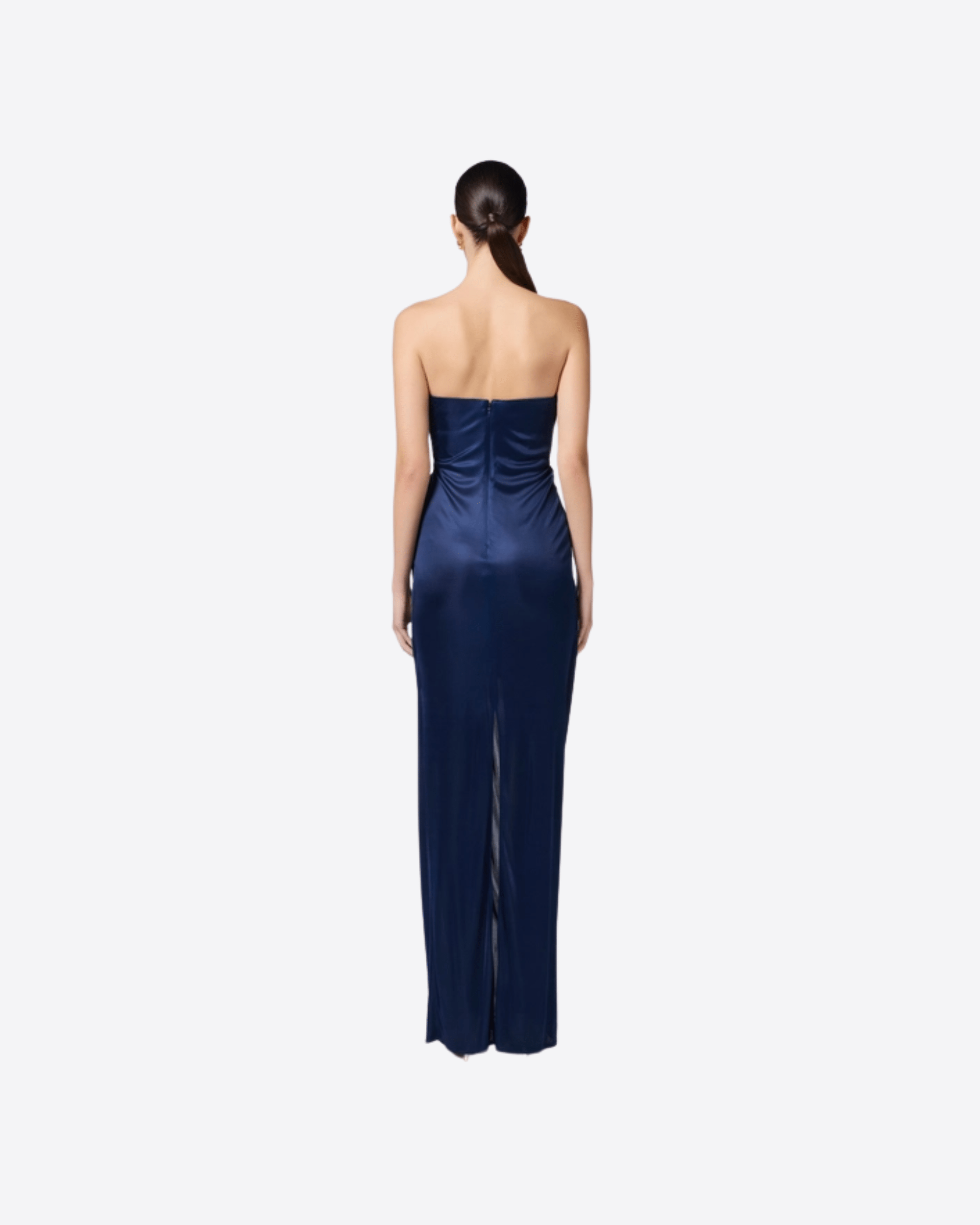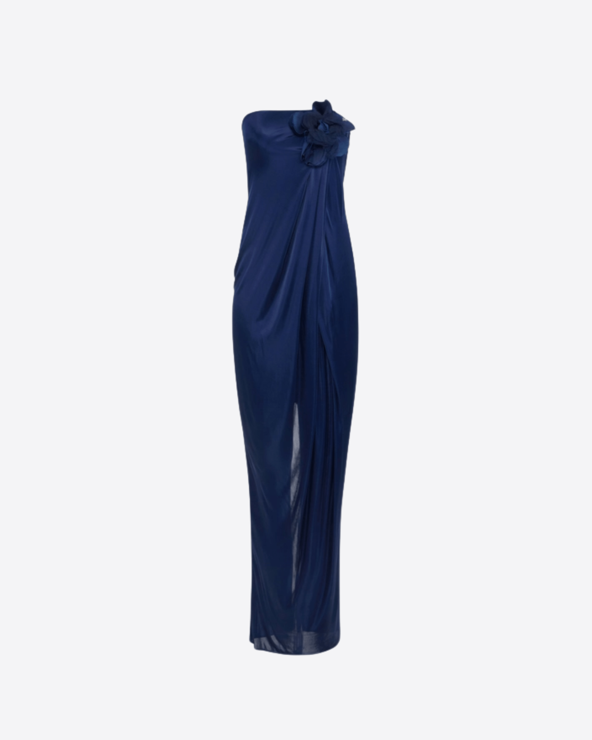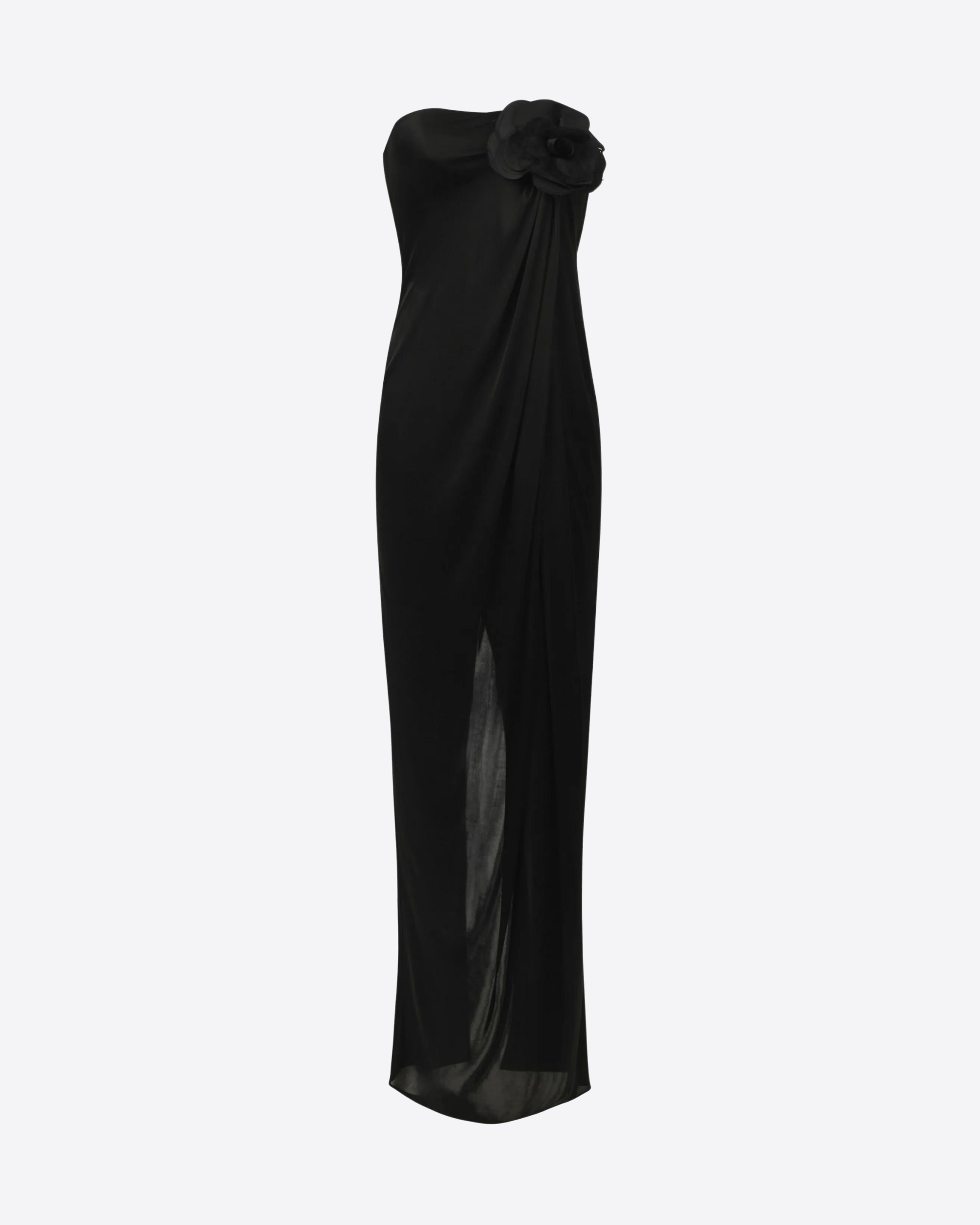 Abito da sera in jersey lucido. Il vestito ha spalle scoperte e si distingue per l'elegante applicazione floreale sul top, impreziosita dal dettaglio logo. I drappeggi che cadono morbidi sulla silhouette regalano un fascino rilassato e disinvolto. Spacco sul retro. Vestibilità slim.