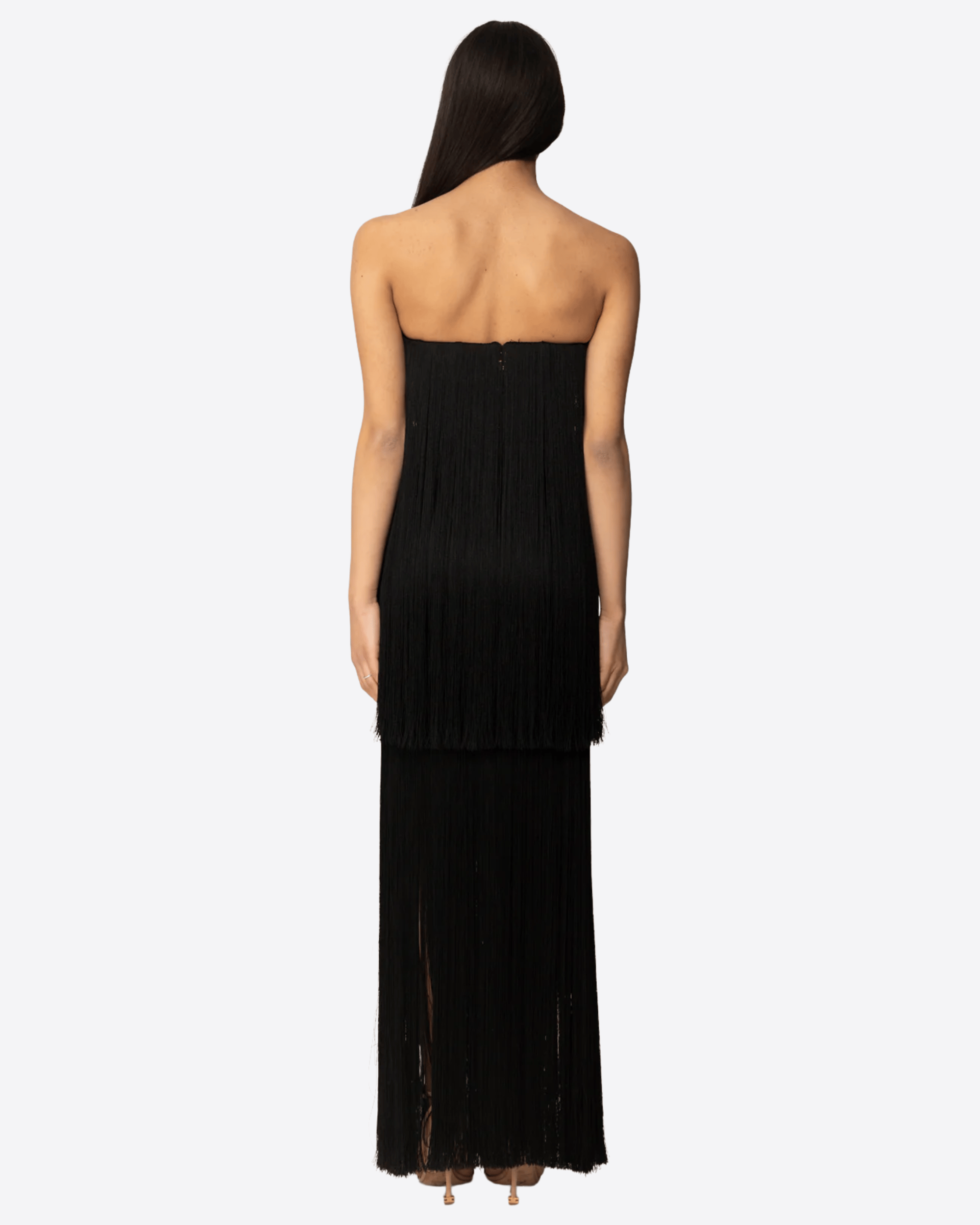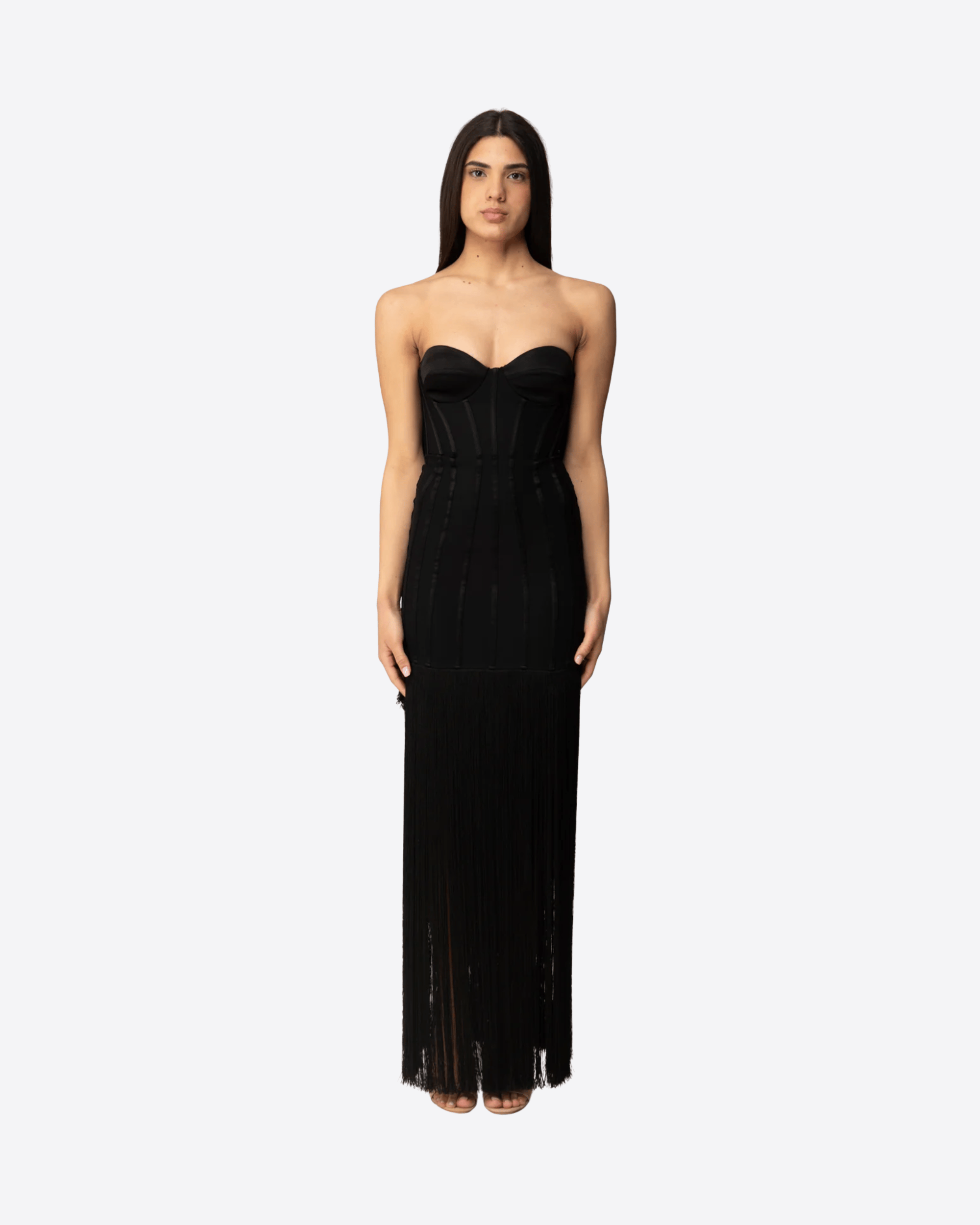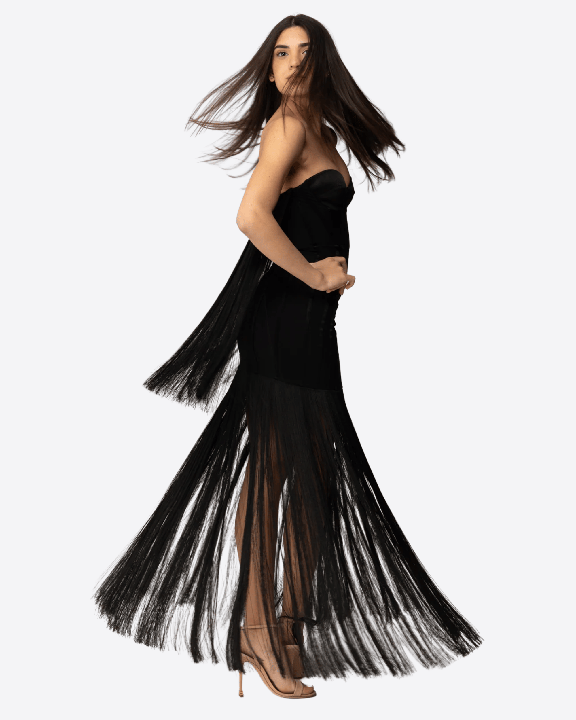 Il modello è arricchito da frange applicate sul fondo e sul retro, che creano movimento e un effetto scenografico ipnotico. Perfetto per serate di gala e occasioni speciali, combina eleganza, femminilità e grande impatto visivo.