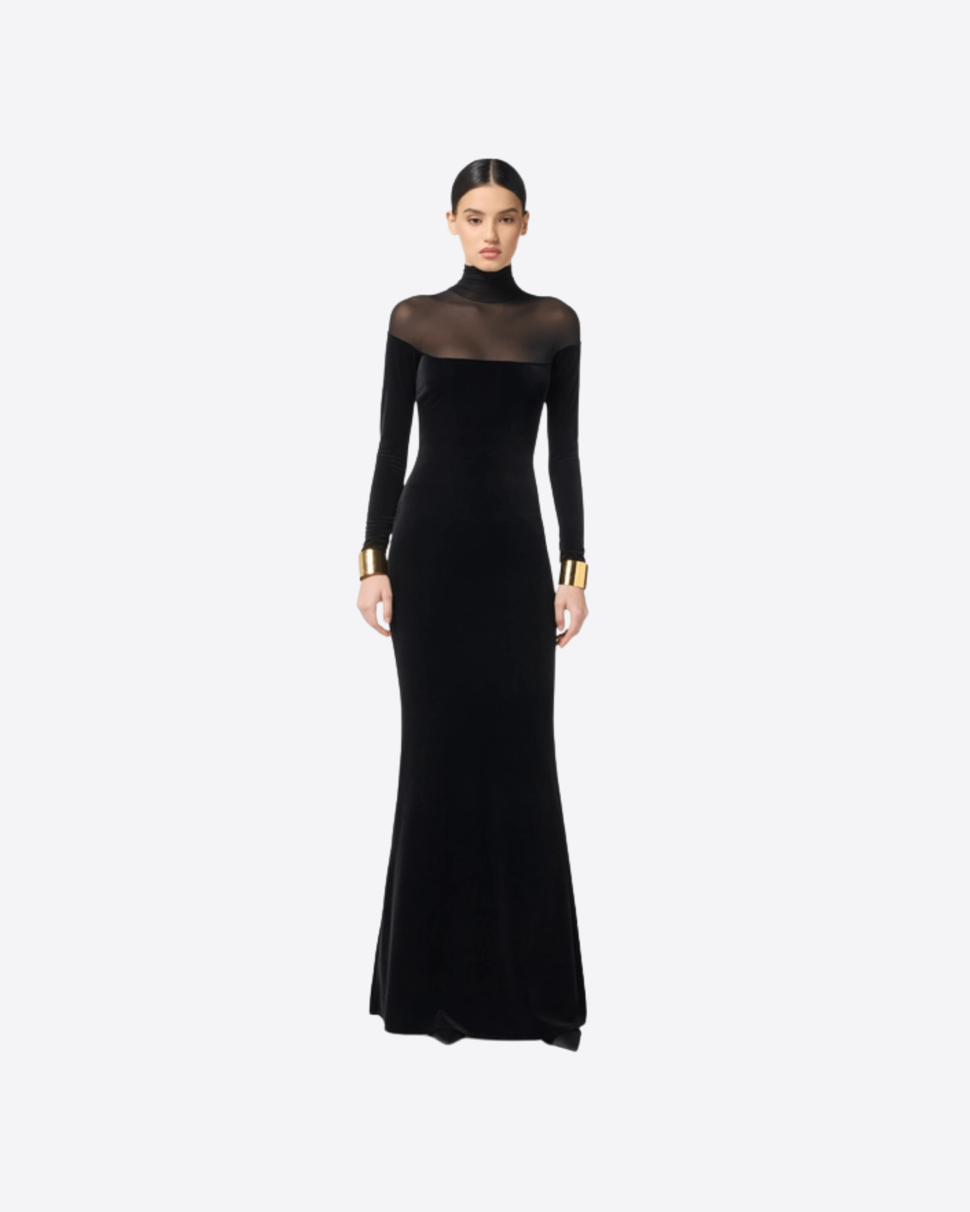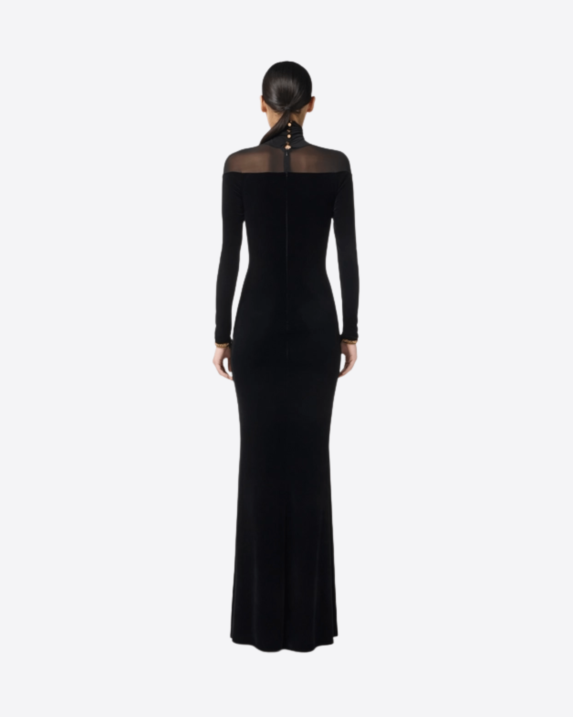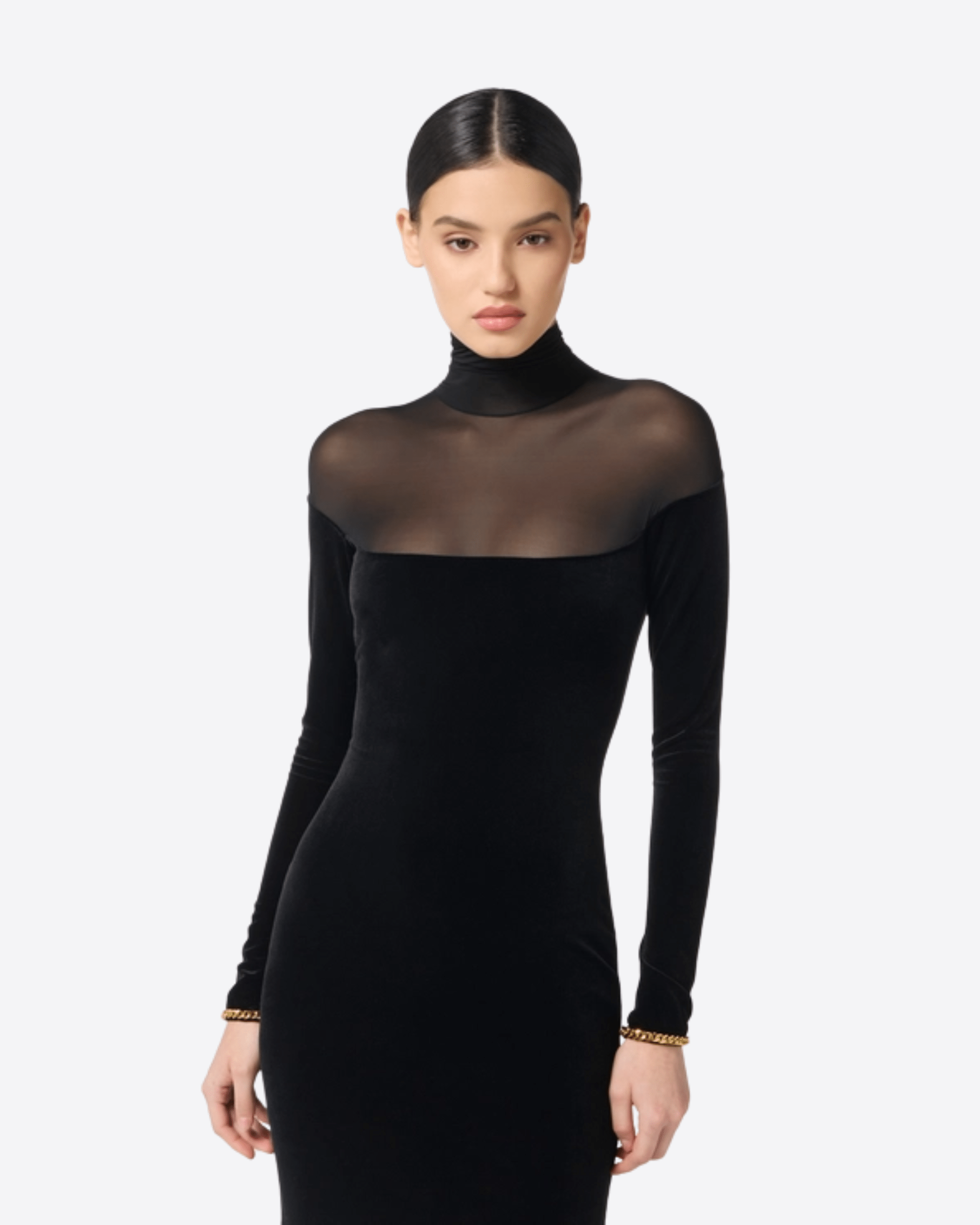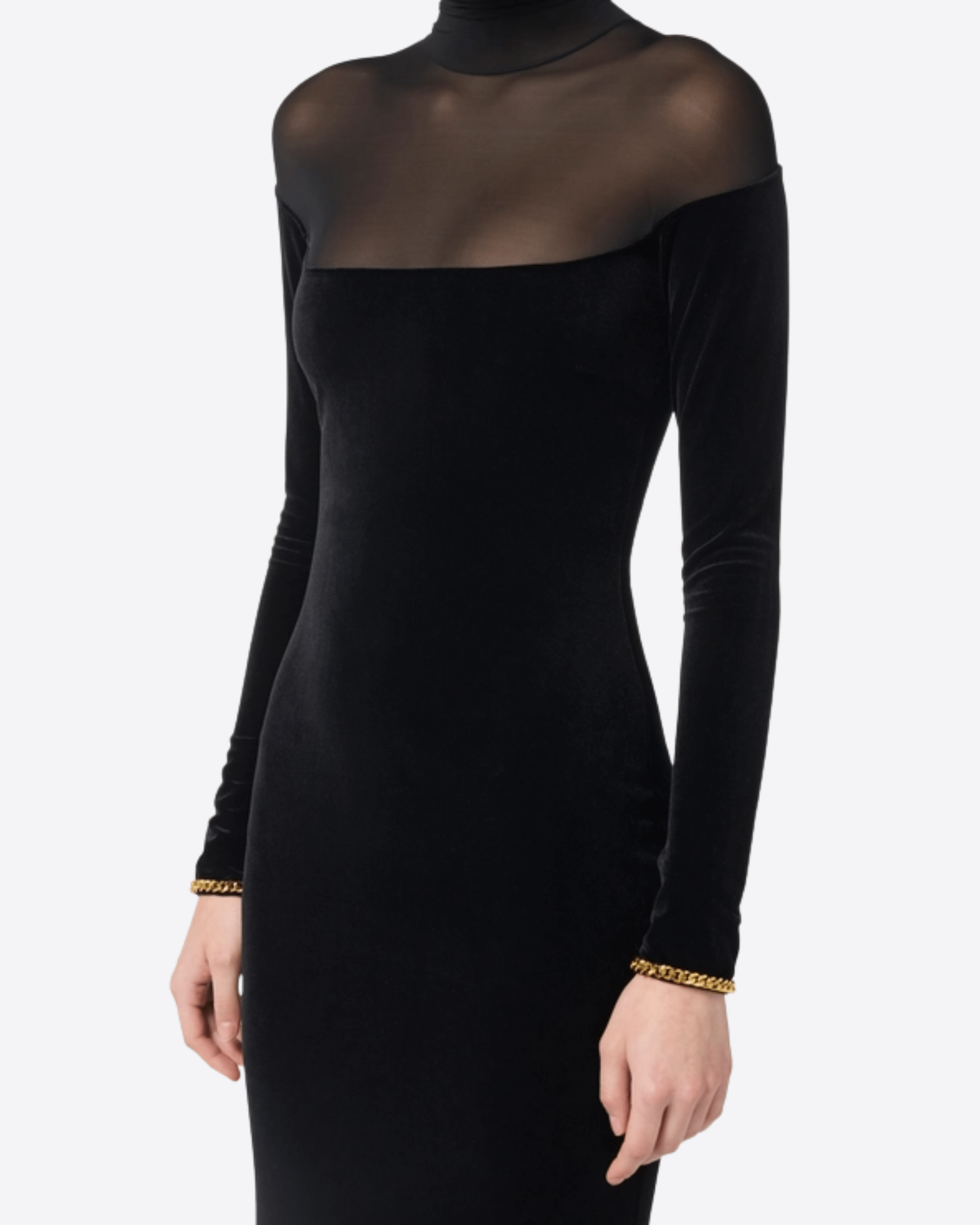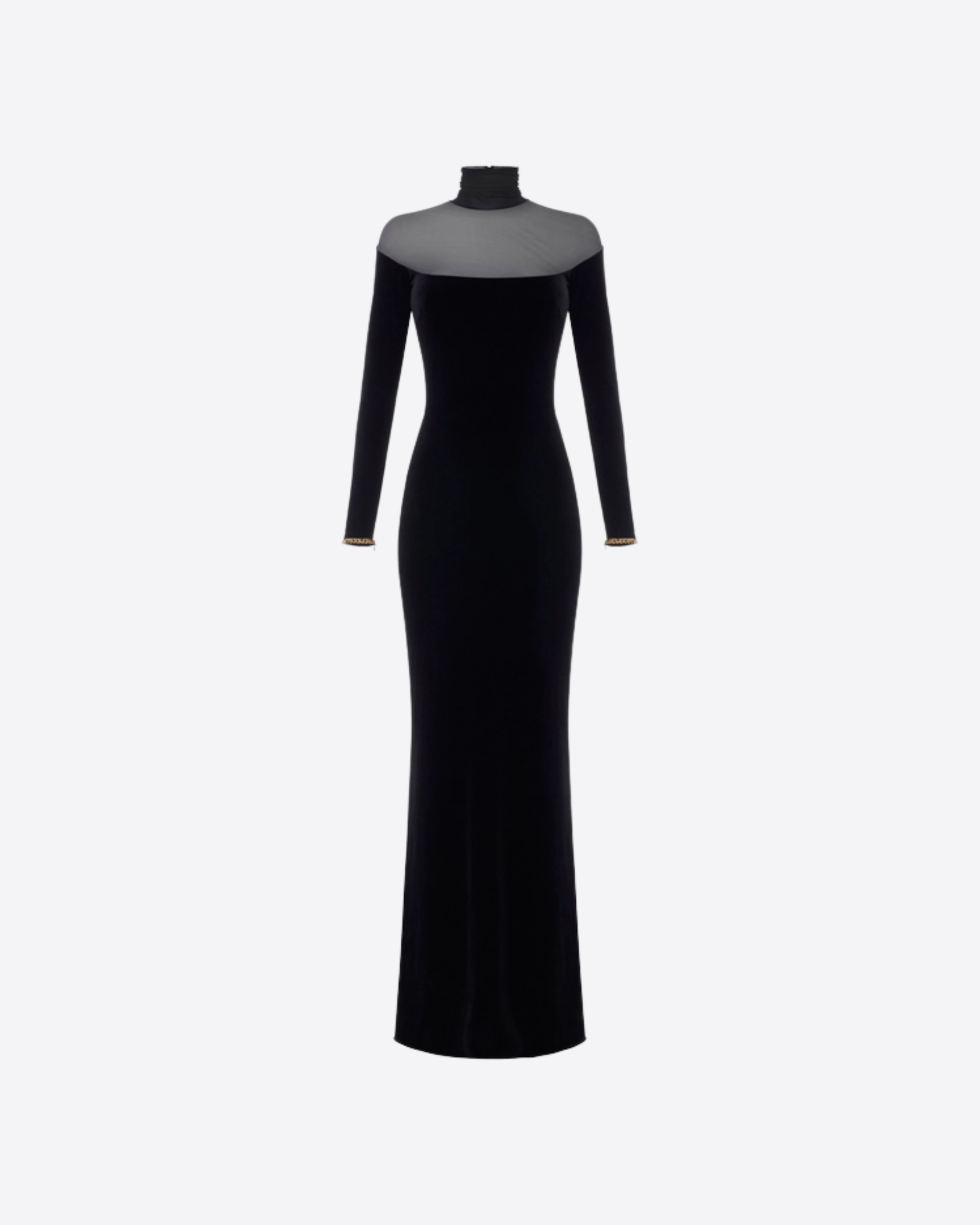 Abito da sera in velluto dalla vestibilità aderente. Il vestito si distingue per il collo alto e le spalle realizzate in jersey semi-trasparente. Impreziosito dai dettagli gioiello in catena che illuminano i polsi. Dalla linea avvolgente, ha gonna leggermente a sirena che regala un andamento sensuale.