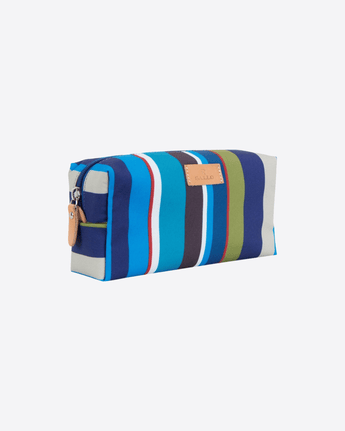 Pratica ed originale pochette bauletto unisex in fibra sintetica, realizzata in Italia con grande cura per i dettagli. Iconica trama a righe multicolor Gallo, che la contraddistingue già dal primo sguardo. Fantasia sui toni del blu, può essere utilizzata come porta oggetti o beauty-case, per avere tutto il necessario sempre con se.