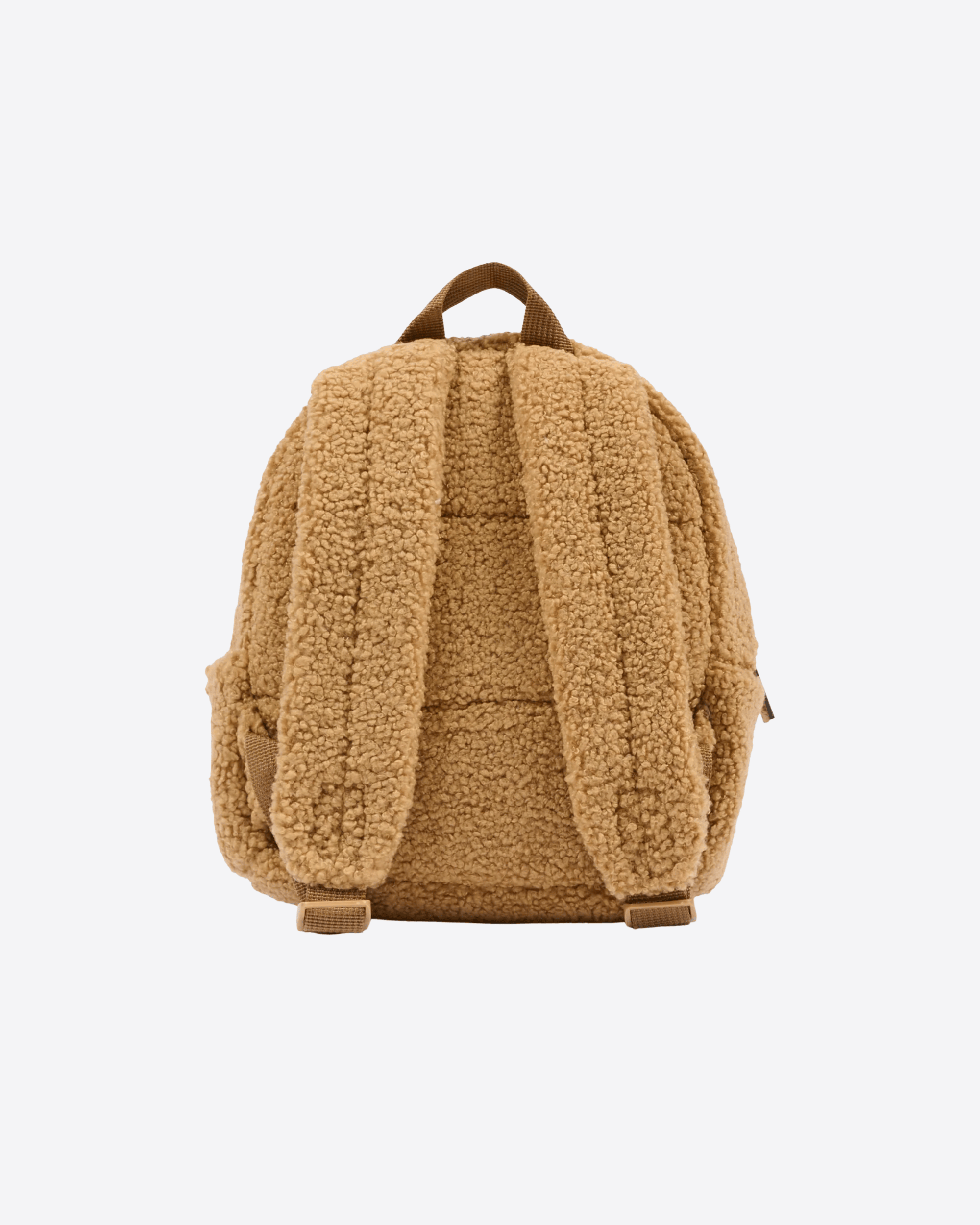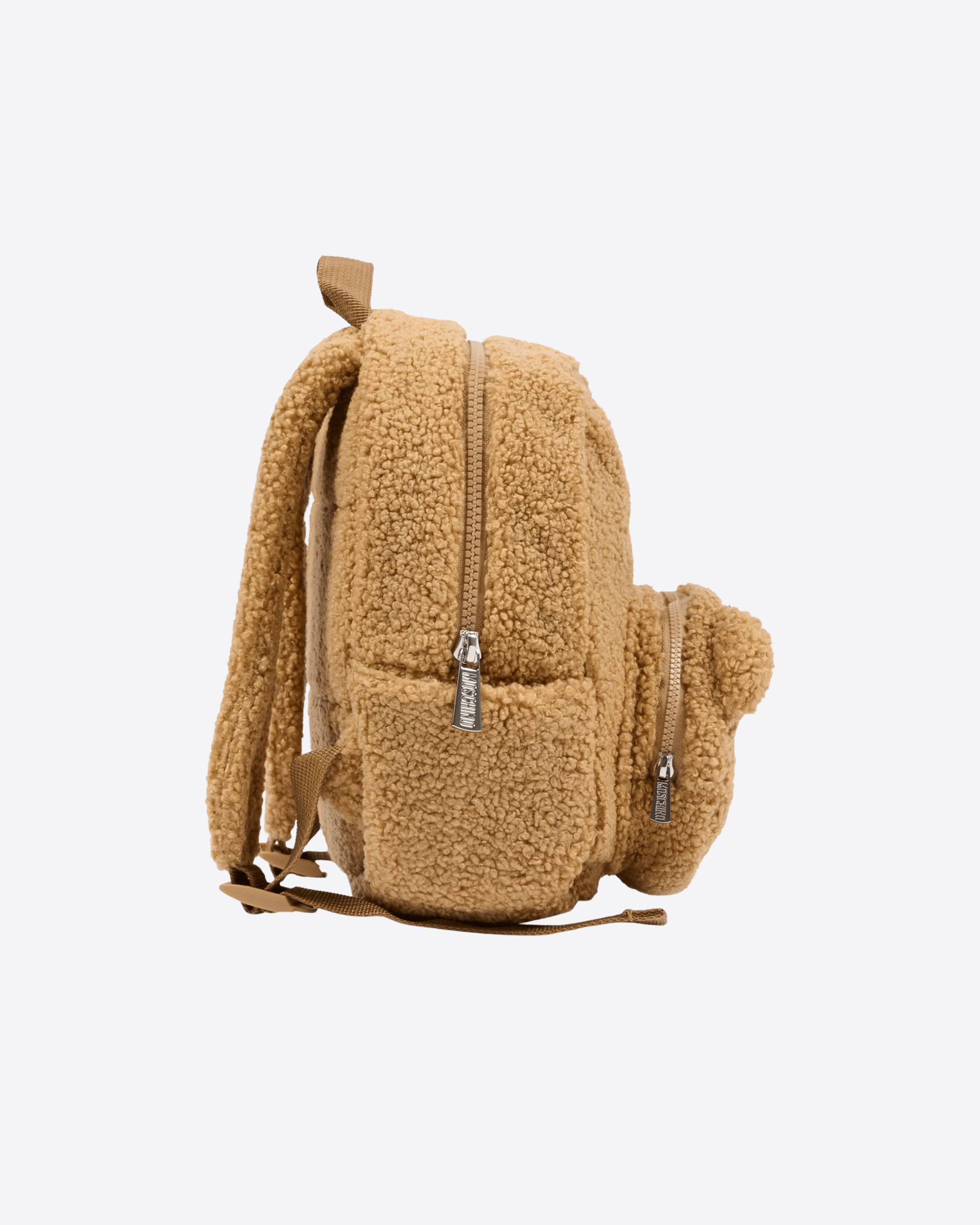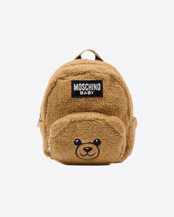 Zaino marrone del brand Moschino Kids, in tessuto teddy, con manico, chiusura superiore con zip, tasca frontale con zip e orecchie applicate sulla parte anteriore, tasche laterali e spallacci regolabili leggermente imbottiti. È decorato con Teddy Bear ricamato e patch logato, sulla parte nateriore.