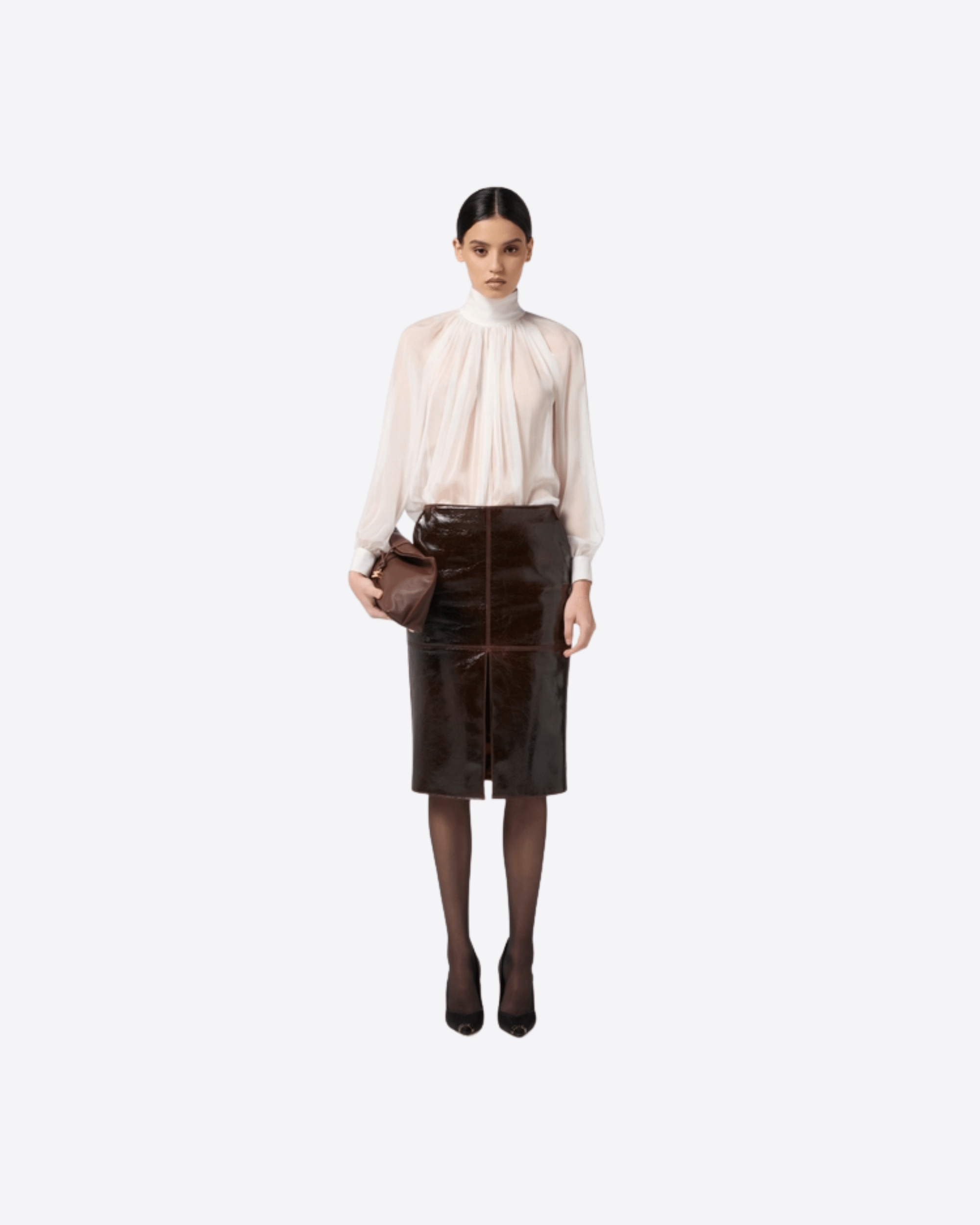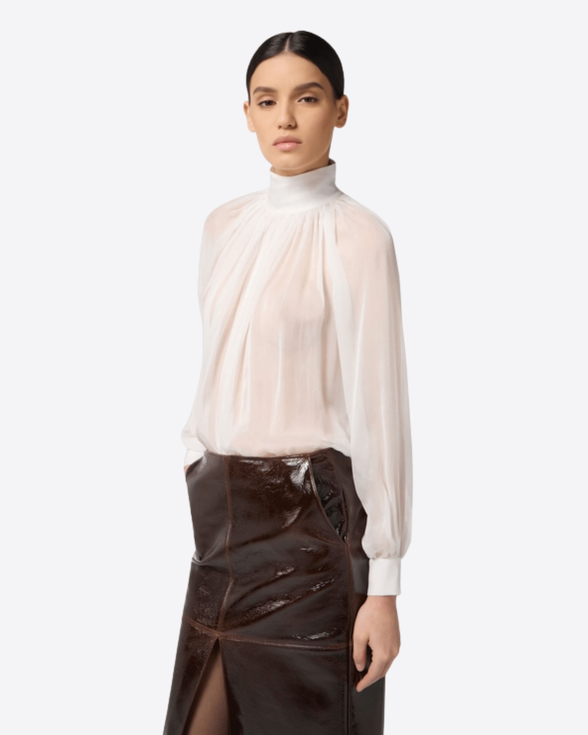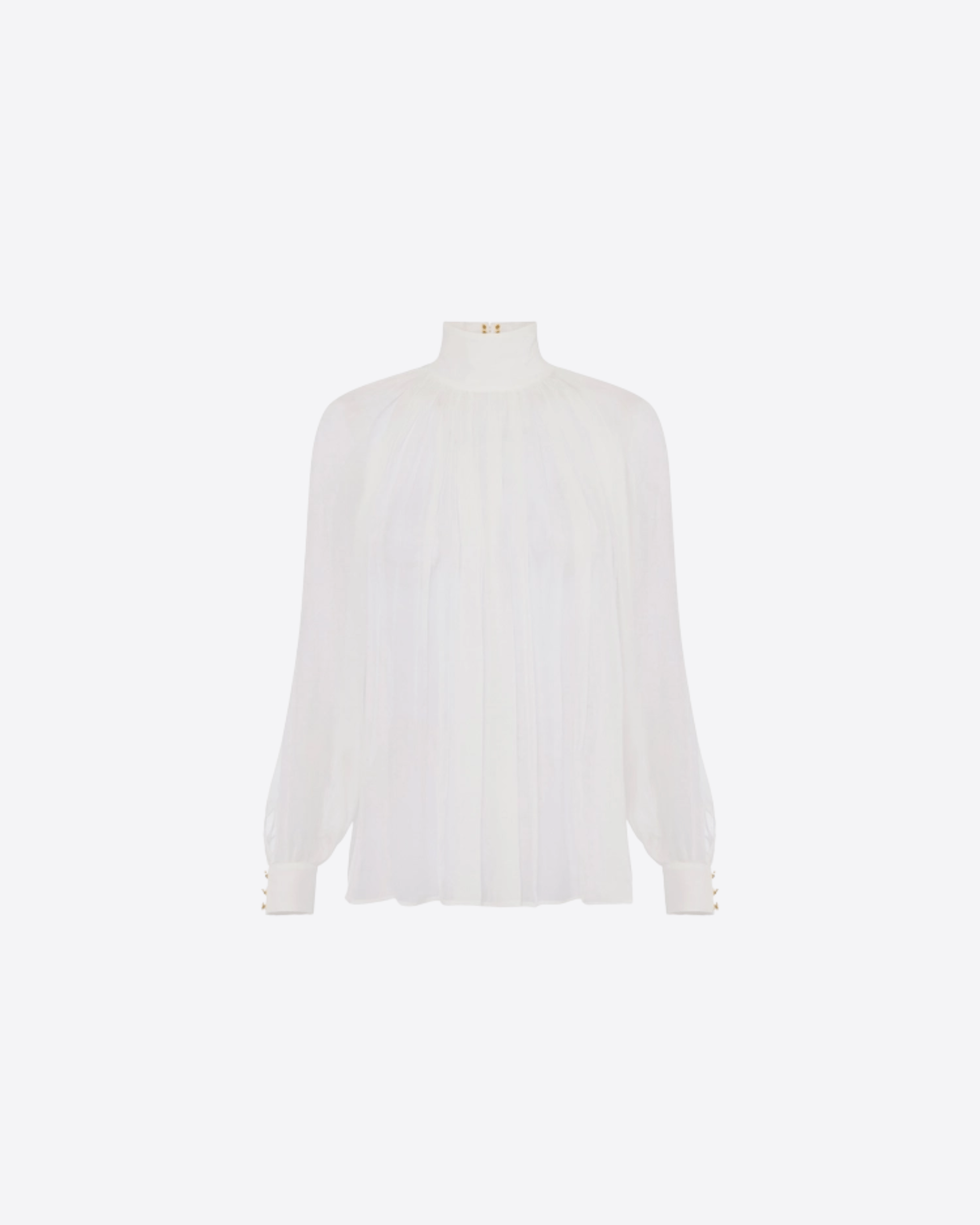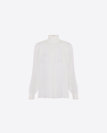 Blusa in voile dalla vestibilità slim. Ha collo alto con ganci in metallo dorato sul retro, maniche lunghe con polsi al fondo. La lavorazione a pieghe dona un raffinato movimento al capo.