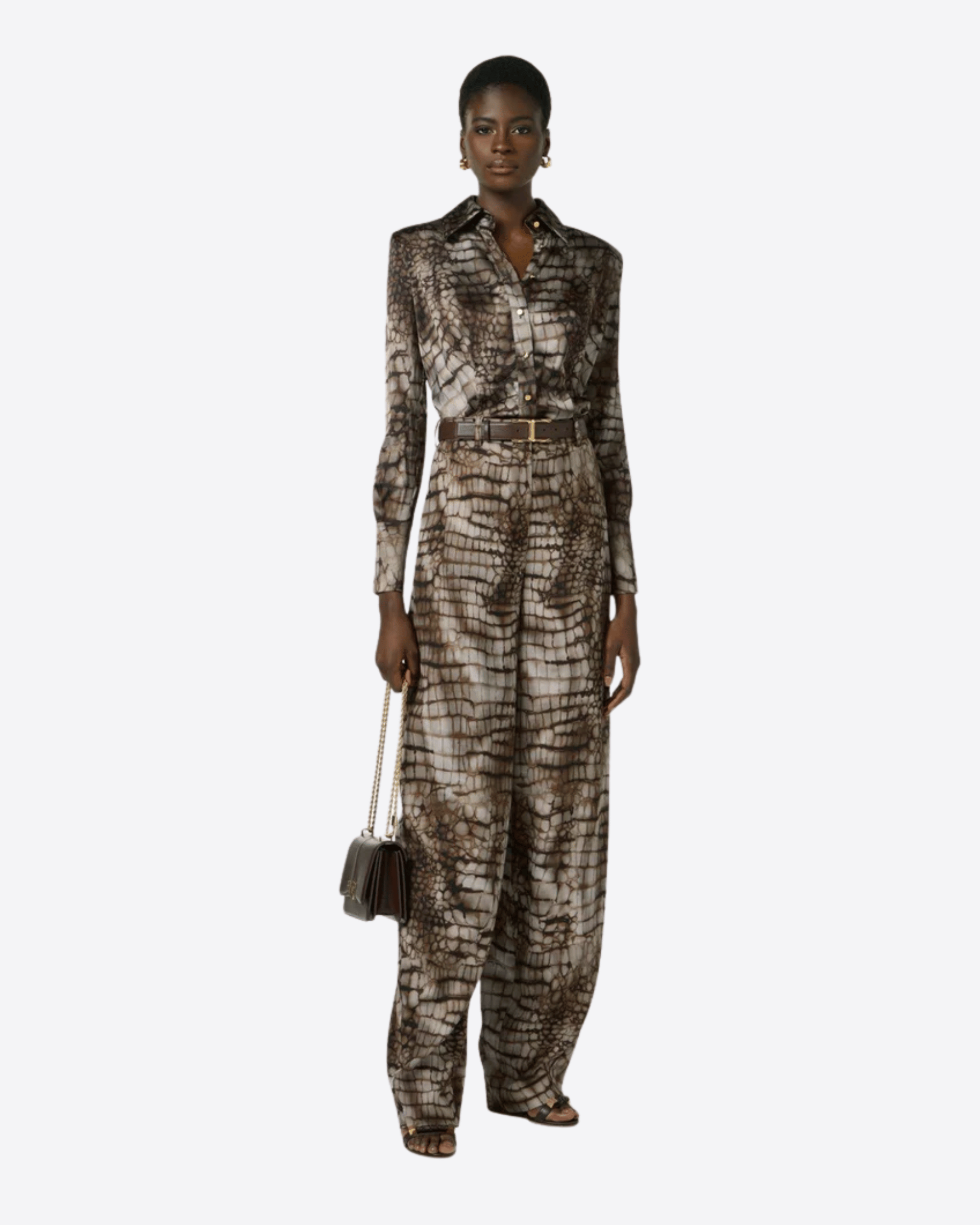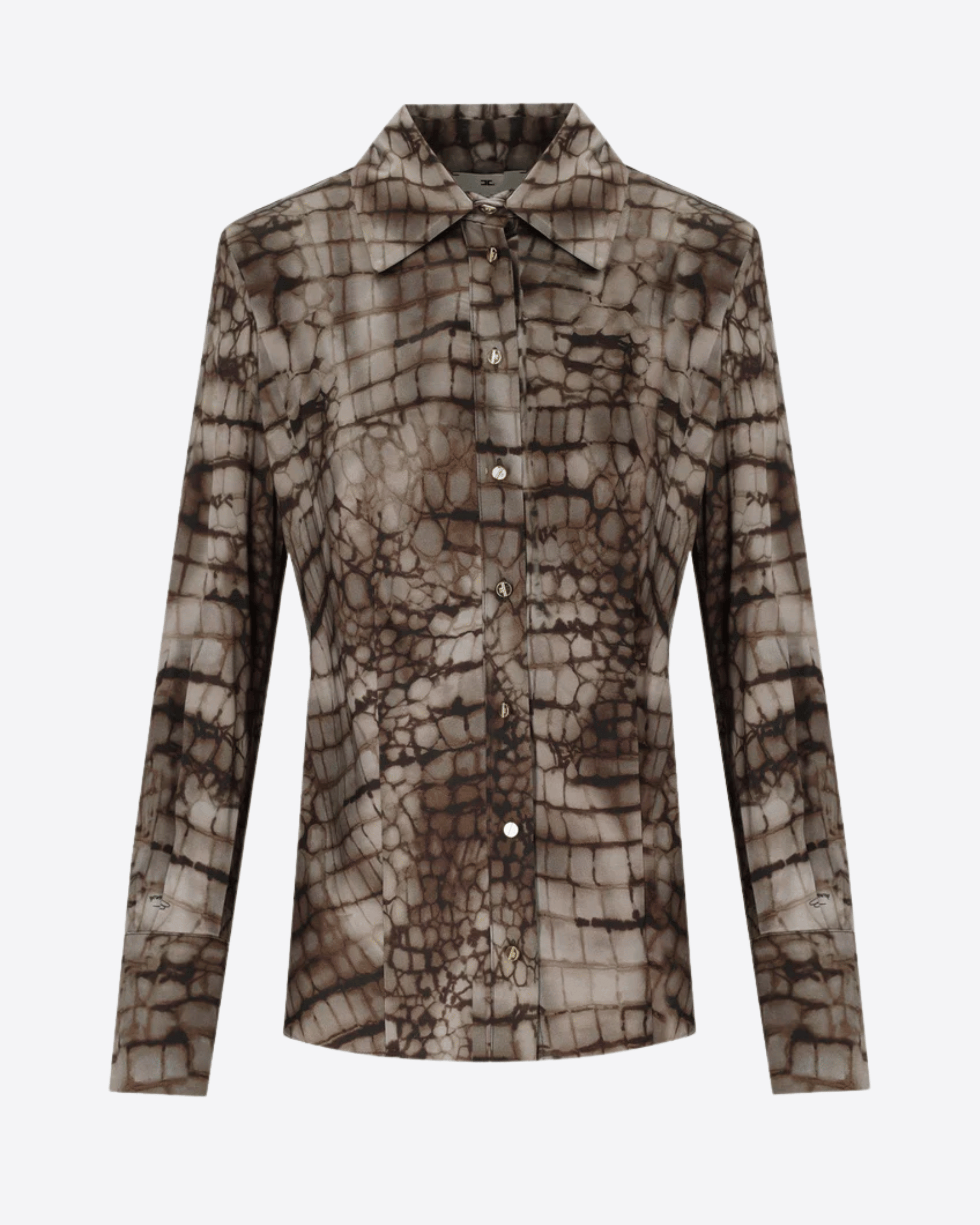 Camicia in raso caratterizzata da spalle strutturate che definiscono una silhouette elegante. Il modello presenta colletto, maniche lunghe con polsini e vestibilità slim. La protagonista del capo è la stampa all-over a tema alligatore, ispirata a forme e geometrie naturali, che conferisce carattere e stile contemporaneo.
