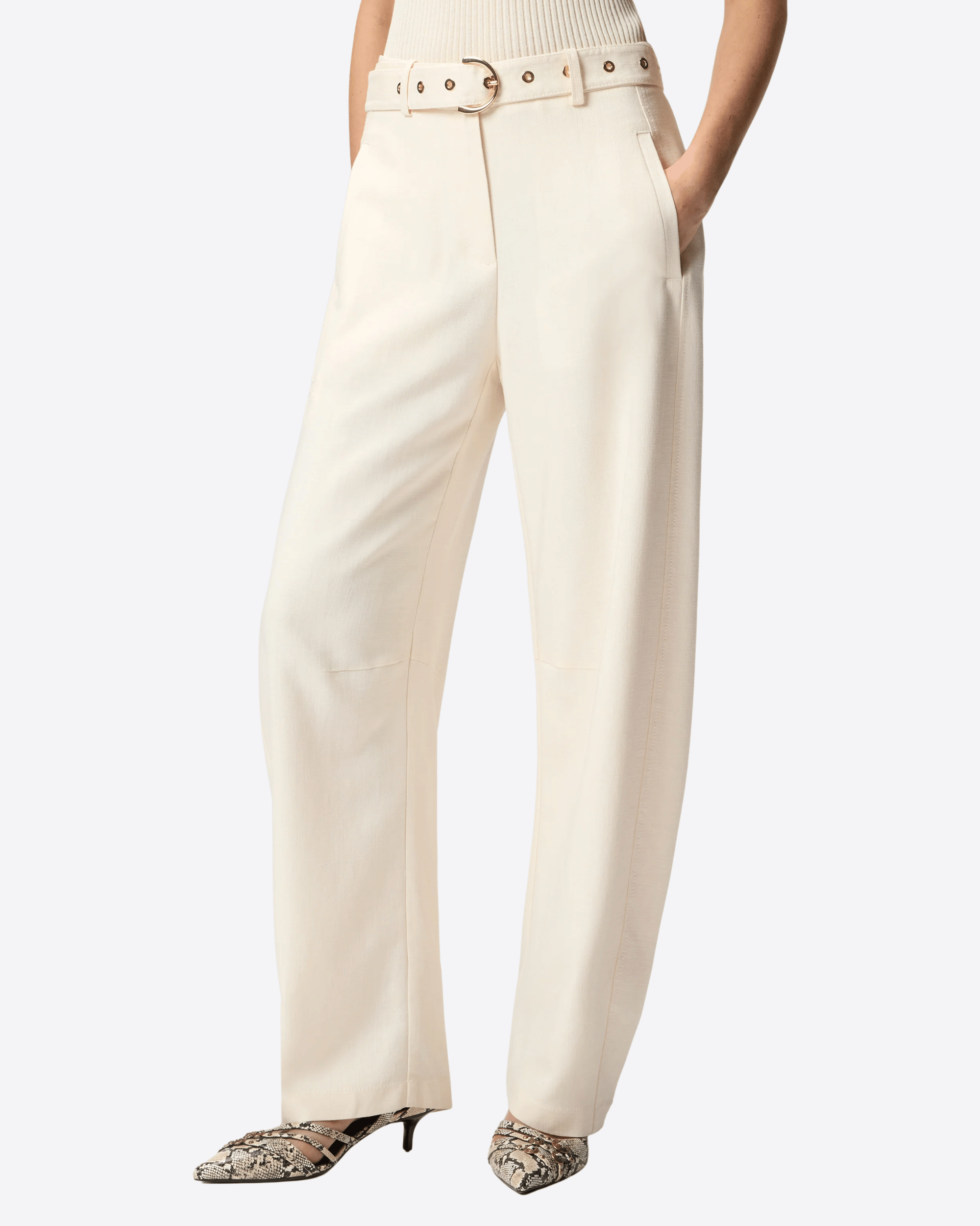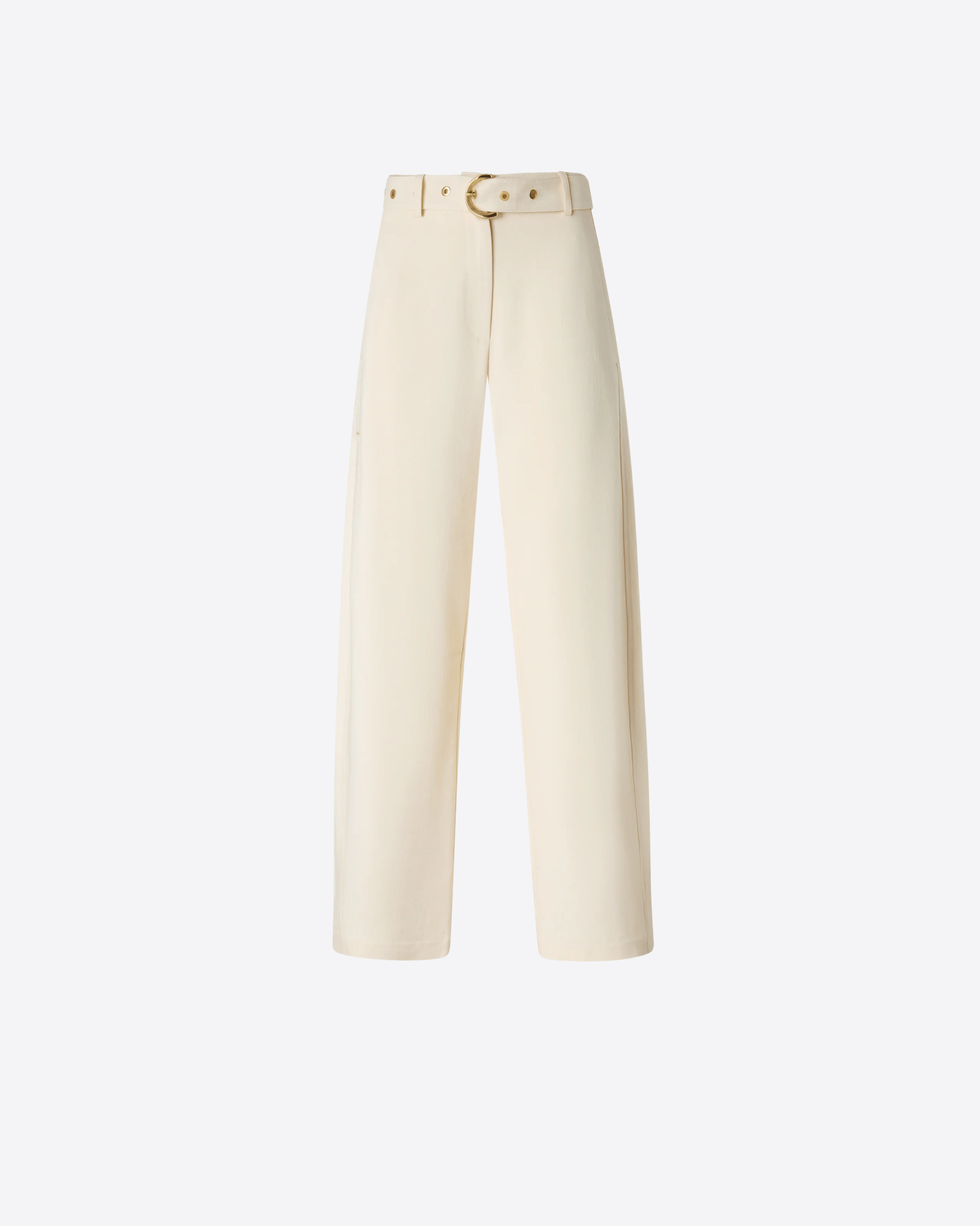 Pantaloni a gamba dritta in tessuto stretch panama dall’effetto fluido, ispirato all’aspetto naturale del lino. Dotati di tasche posteriori a filetto e chiusura con zip e bottone, sono completati da una cintura abbinata rimovibile con fibbia e occhielli dorati. Un modello essenziale e contemporaneo, pensato per diventare un passe-partout del guardaroba quotidiano.