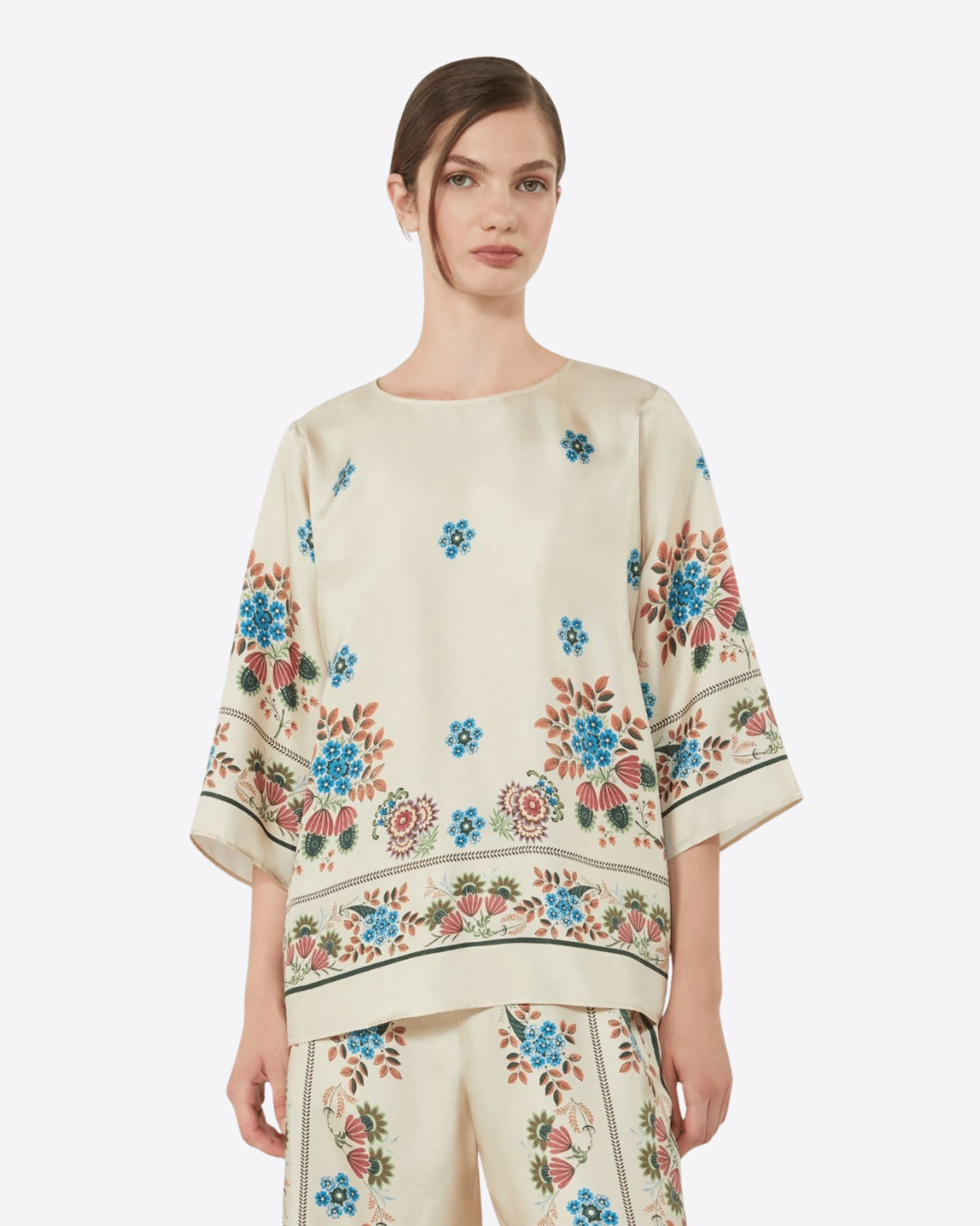 Blusa in twill di pura seta impreziosita dal motivo di collezione stampato all over, che dona al capo un carattere raffinato e distintivo. La vestibilità morbida, leggermente svasata, accompagna la silhouette con naturalezza, garantendo comfort e leggerezza. Il modello presenta un essenziale girocollo e ampie maniche 3/4 che valorizzano la linea fluida della blusa. Sul retro, la chiusura a goccia con bottone sul collo aggiunge un dettaglio delicato e funzionale, mentre la contropiega centrale contribuisce a creare movimento e volume, completando il design con un tocco di eleganza.