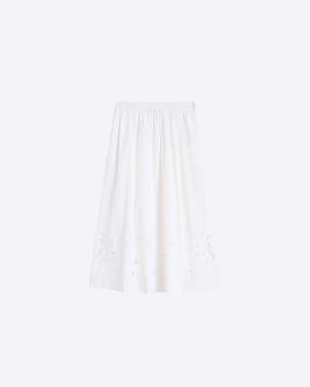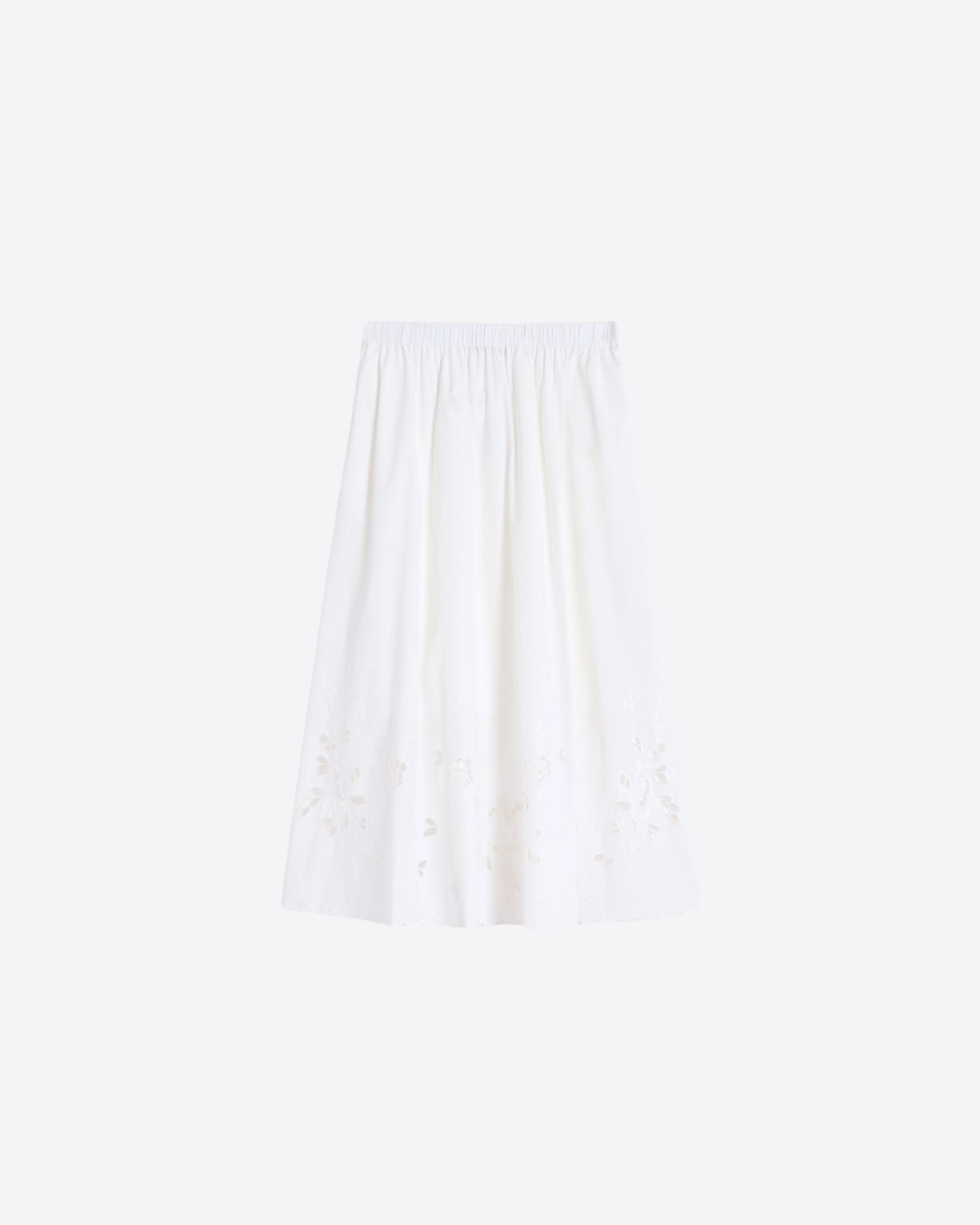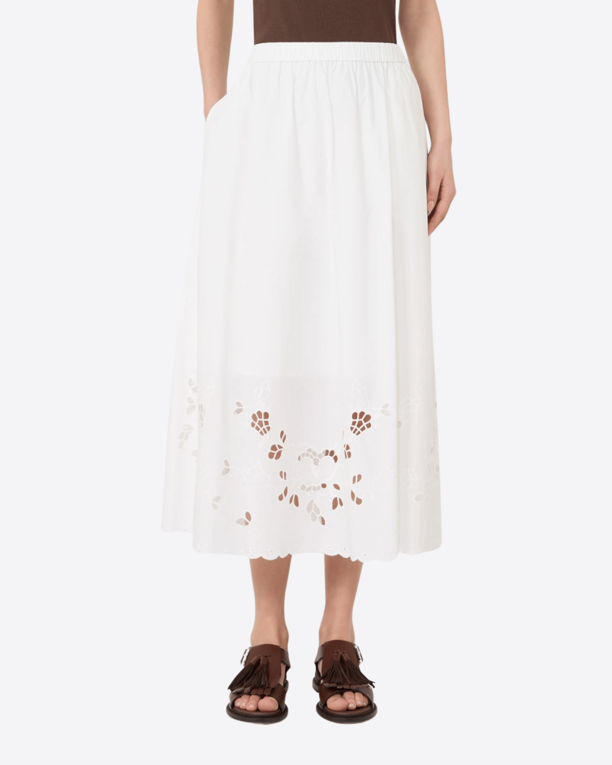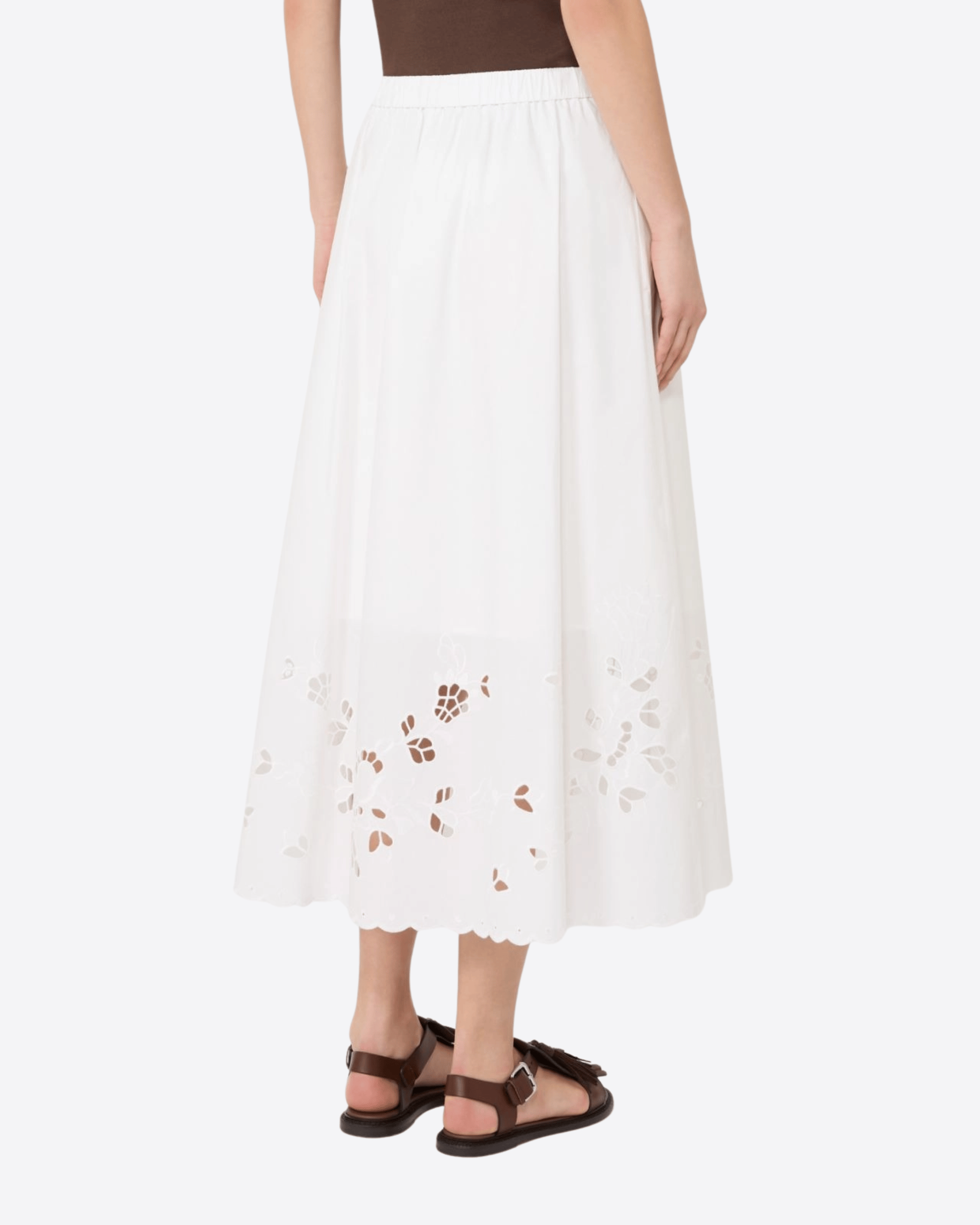 Gonna midi in popeline di puro cotone, caratterizzata da una silhouette ampia e leggermente svasata che dona movimento e leggerezza al capo. I dettagli ricamati à jour aggiungono un tocco raffinato e femminile, esaltando il design con eleganza.