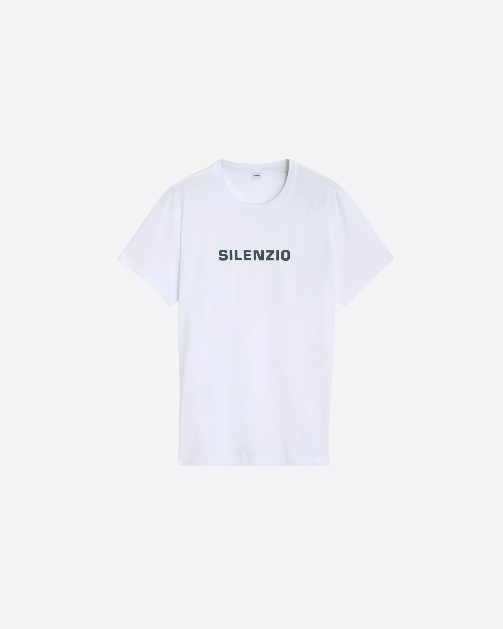 Il modello è caratterizzato dalla stampa “SILENZIO” sul davanti, che conferisce un tocco distintivo e contemporaneo, mentre l’etichetta a bandierina Aspesi sul fianco rifinisce il design con un dettaglio discreto. La vestibilità è regolare, adatta a ogni occasione.