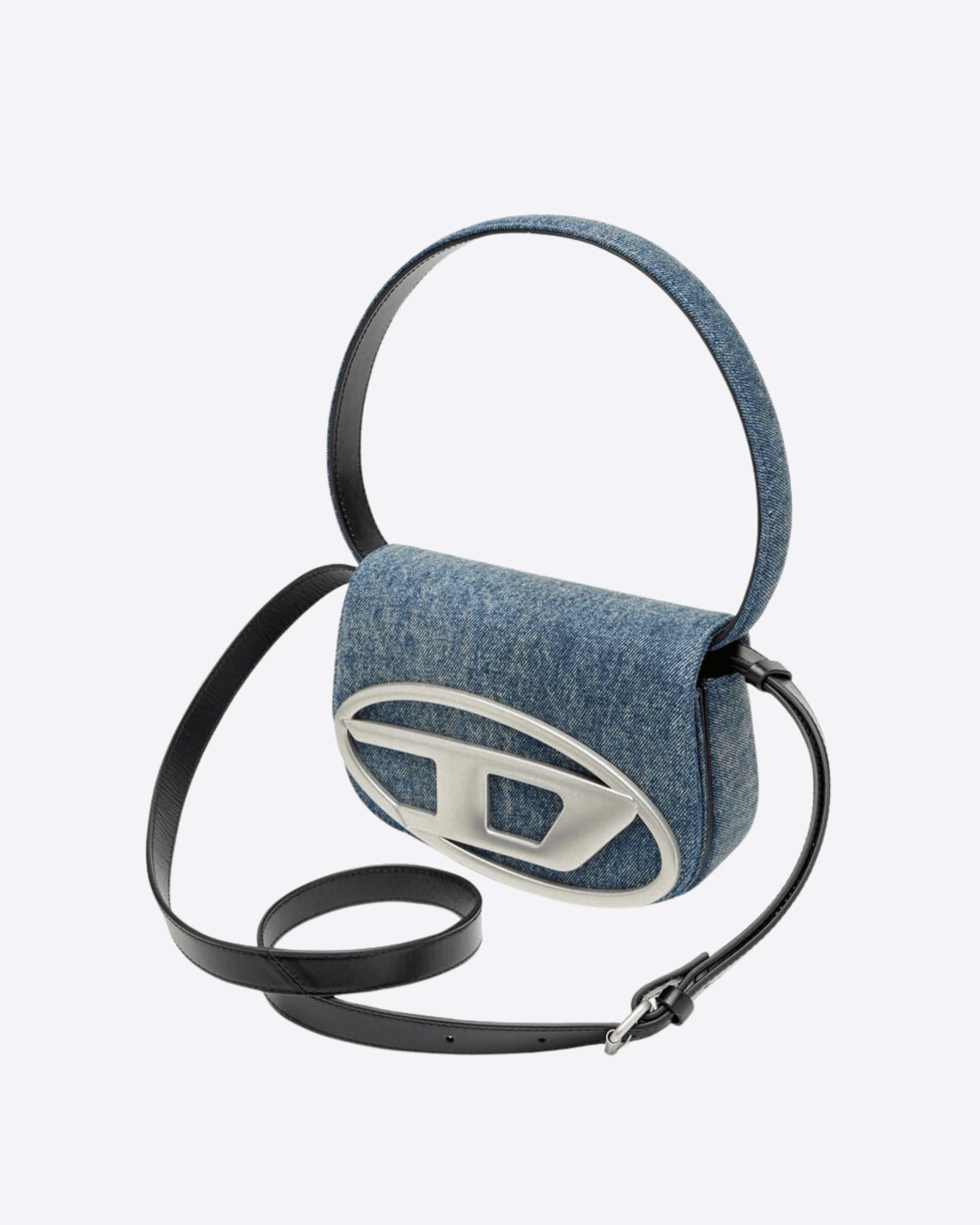 La borsa a tracolla 1DR è uno degli accessori Diesel più iconici e desiderati. Realizzata in denim blu con effetto schiarito dal sole, ottenuto tramite un trattamento solarizzato, è arricchita dalla distintiva placca Oval D con finitura opaca che conferisce raffinatezza al design. Può essere portata a spalla grazie alla maniglia ripiegabile ed è dotata di una tracolla crossbody rimovibile per una versatilità totale.