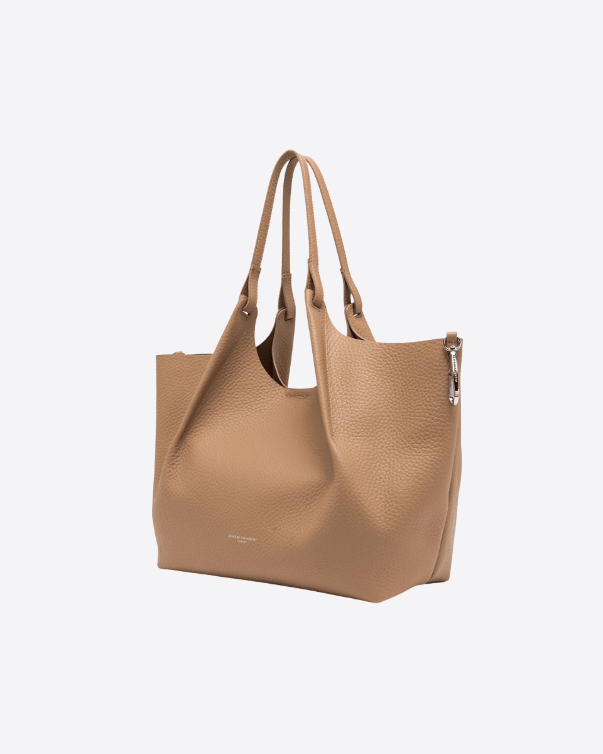 L’icona del brand, la borsa DUA, è realizzata in pelle bubble double dalla grana maxi, caratterizzata da una texture unica e distintiva. Il design essenziale include un monoscomparto sfoderato, profili superiori in pelle martellata e doppi manici in tono. Pratica e versatile, è perfetta per completare ogni look con stile e può essere indossata sia a mano sia a spalla. Dimensioni: 34 × 38 × 16 cm.