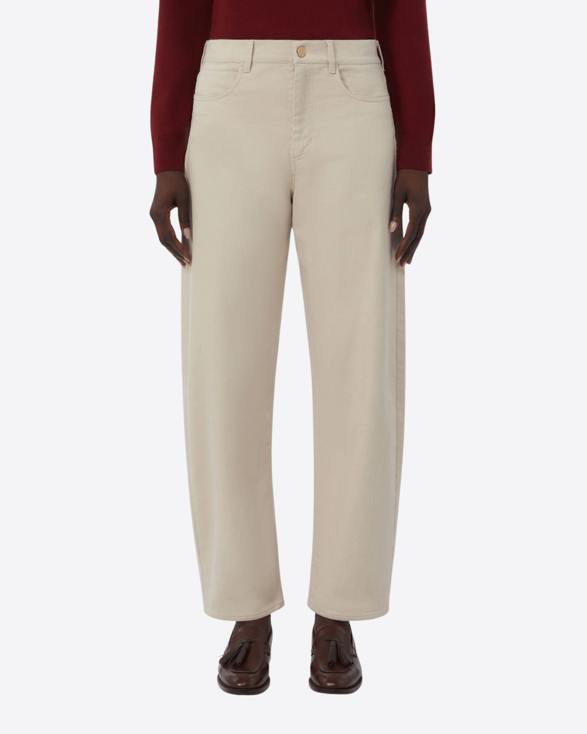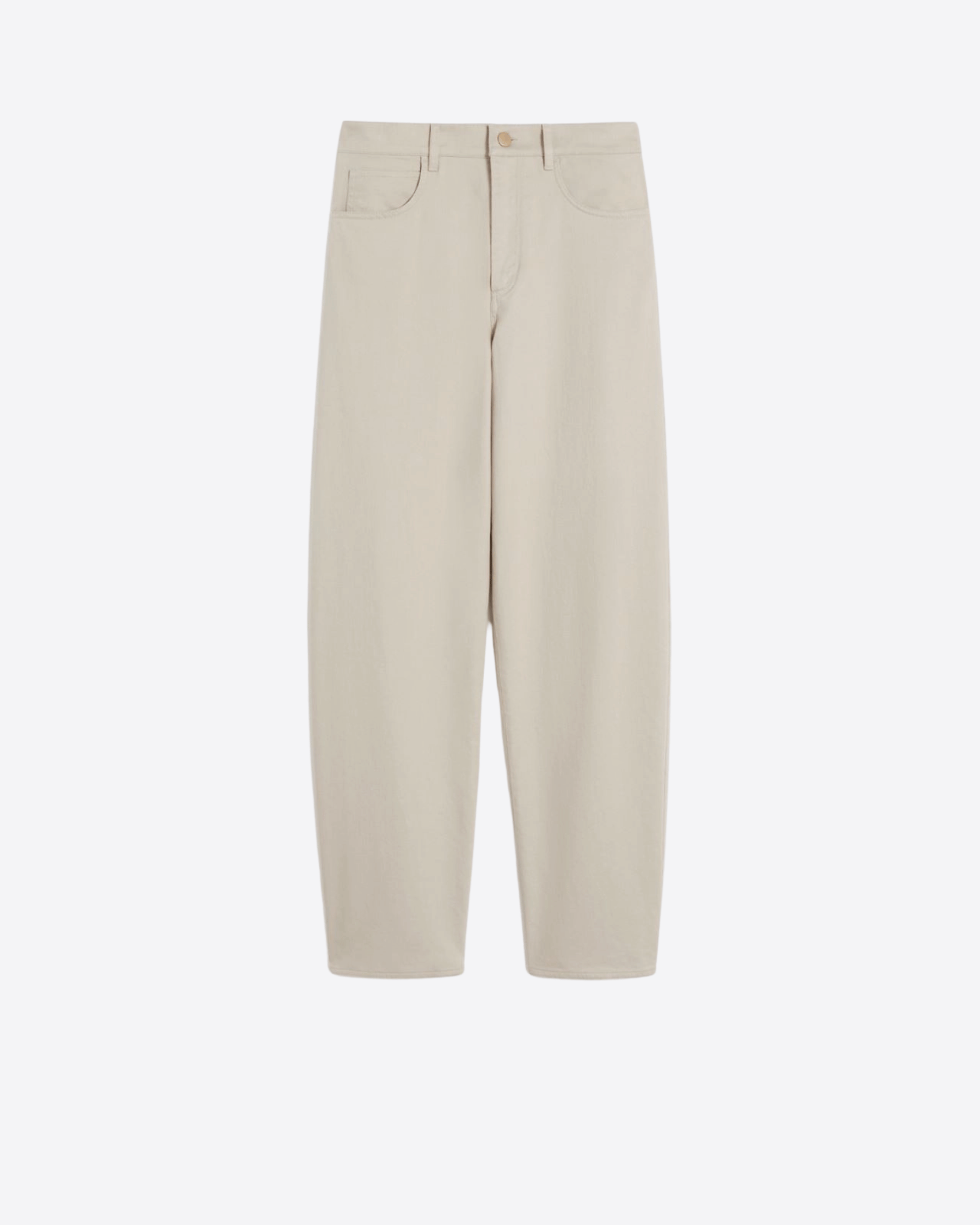 Pantalone cinque tasche caratterizzato da una silhouette barrel leg, realizzato in bull di cotone stretch lavato in capo per un effetto morbido e confortevole. Chiusura con zip coperta e bottone a chiodo color oro. Tasche a toppa sul retro e passanti per cintura in vita completano il design con dettagli funzionali. Rivetti in metallo e impunture tono su tono aggiungono un tocco raffinato e curato.
