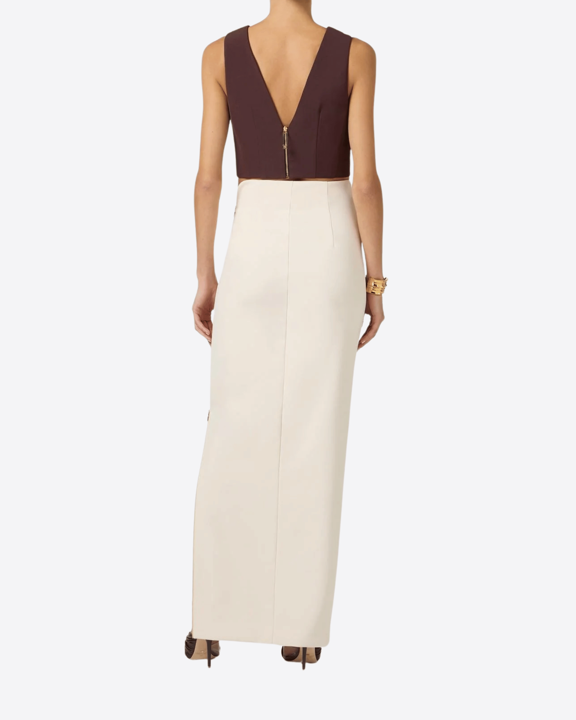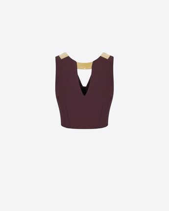 Top smanicato in doppio crêpe stretch, caratterizzato da scollo a V e placche gioiello posizionate sulle spalle e sullo scollo, che aggiungono un tocco luminoso. La texture martellata conferisce un effetto organico al capo, valorizzando una silhouette decisa. Vestibilità regular.