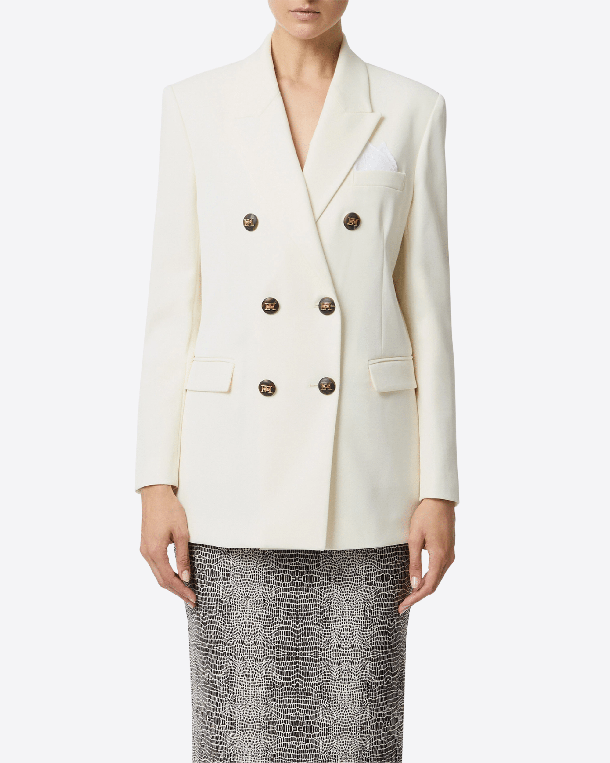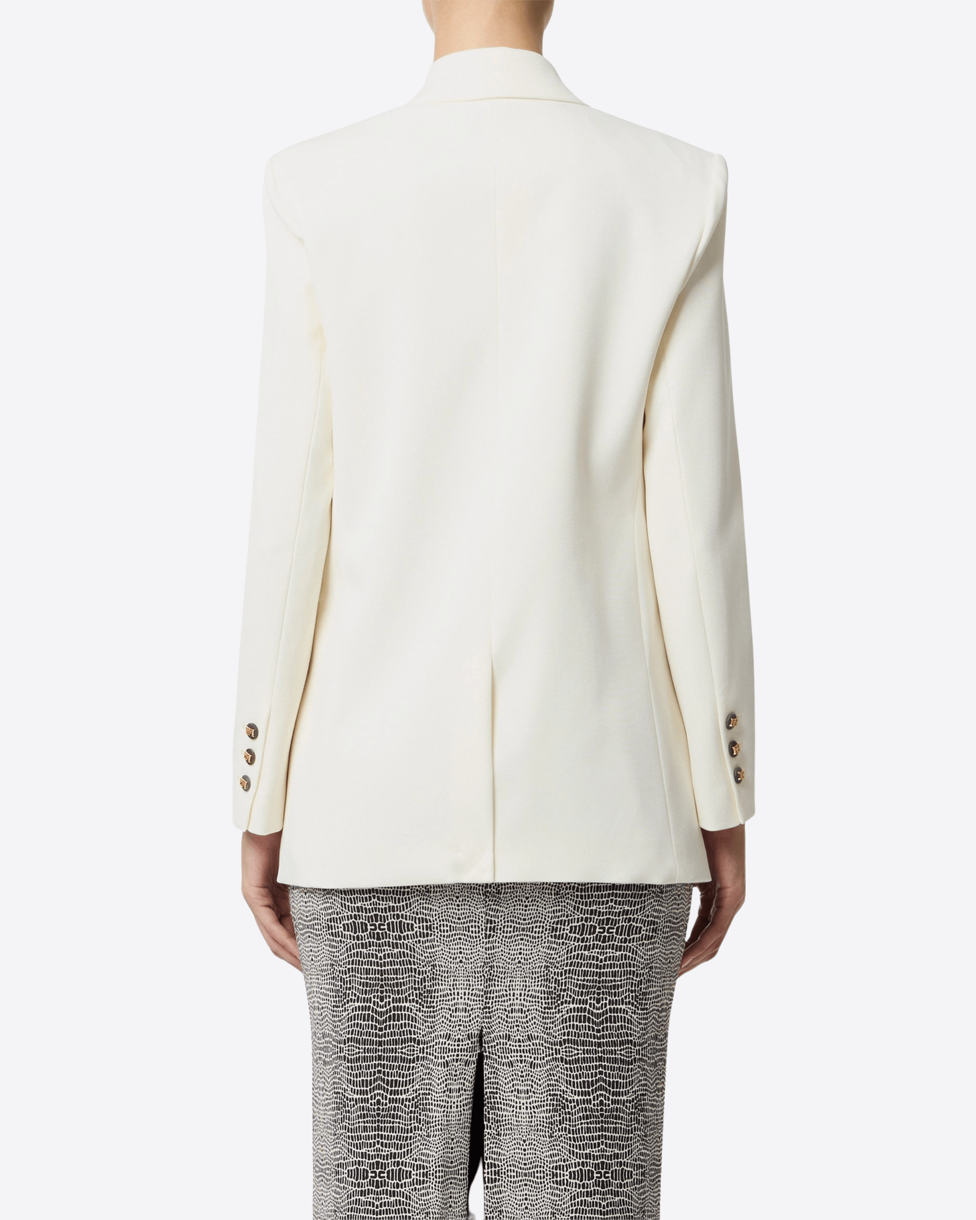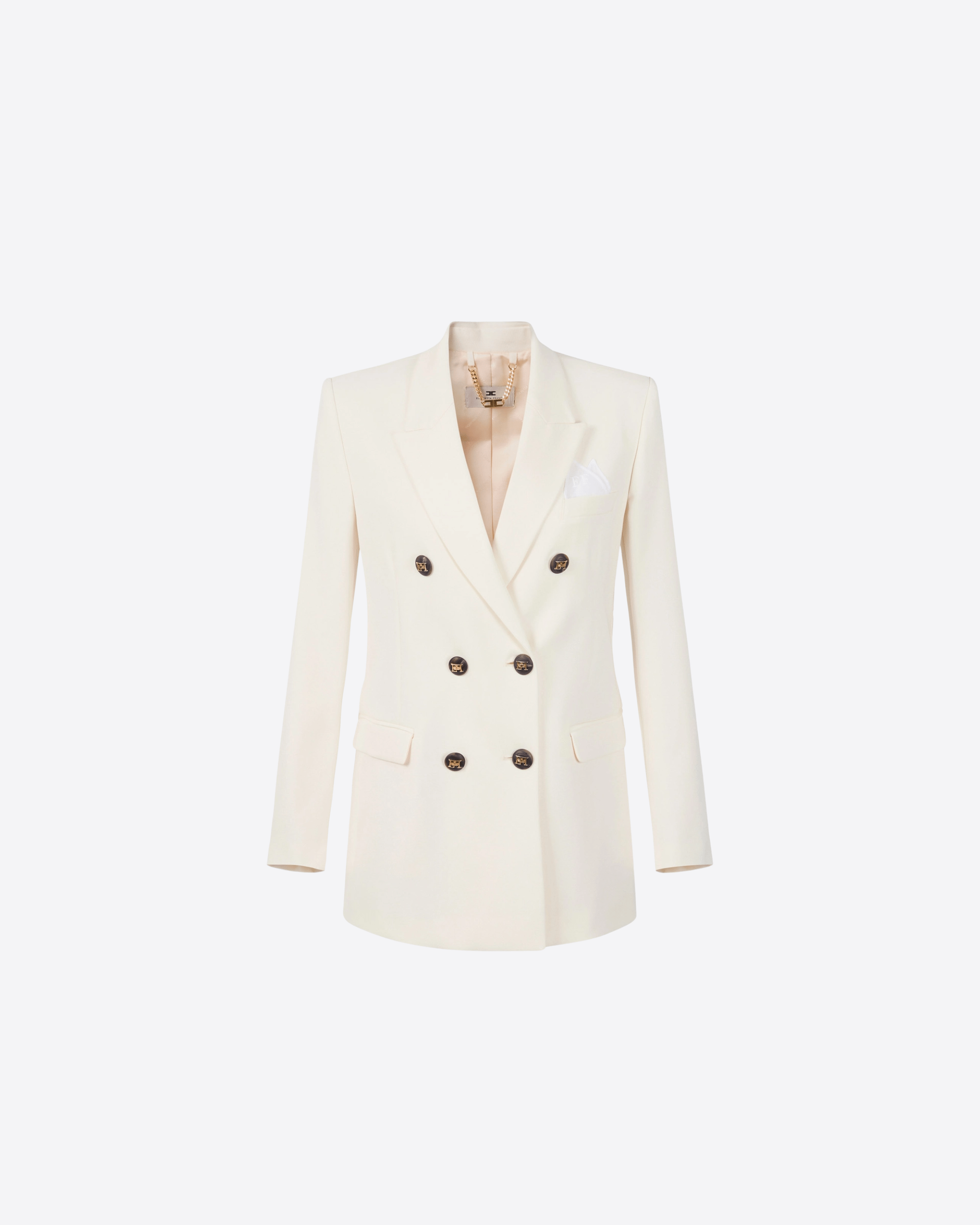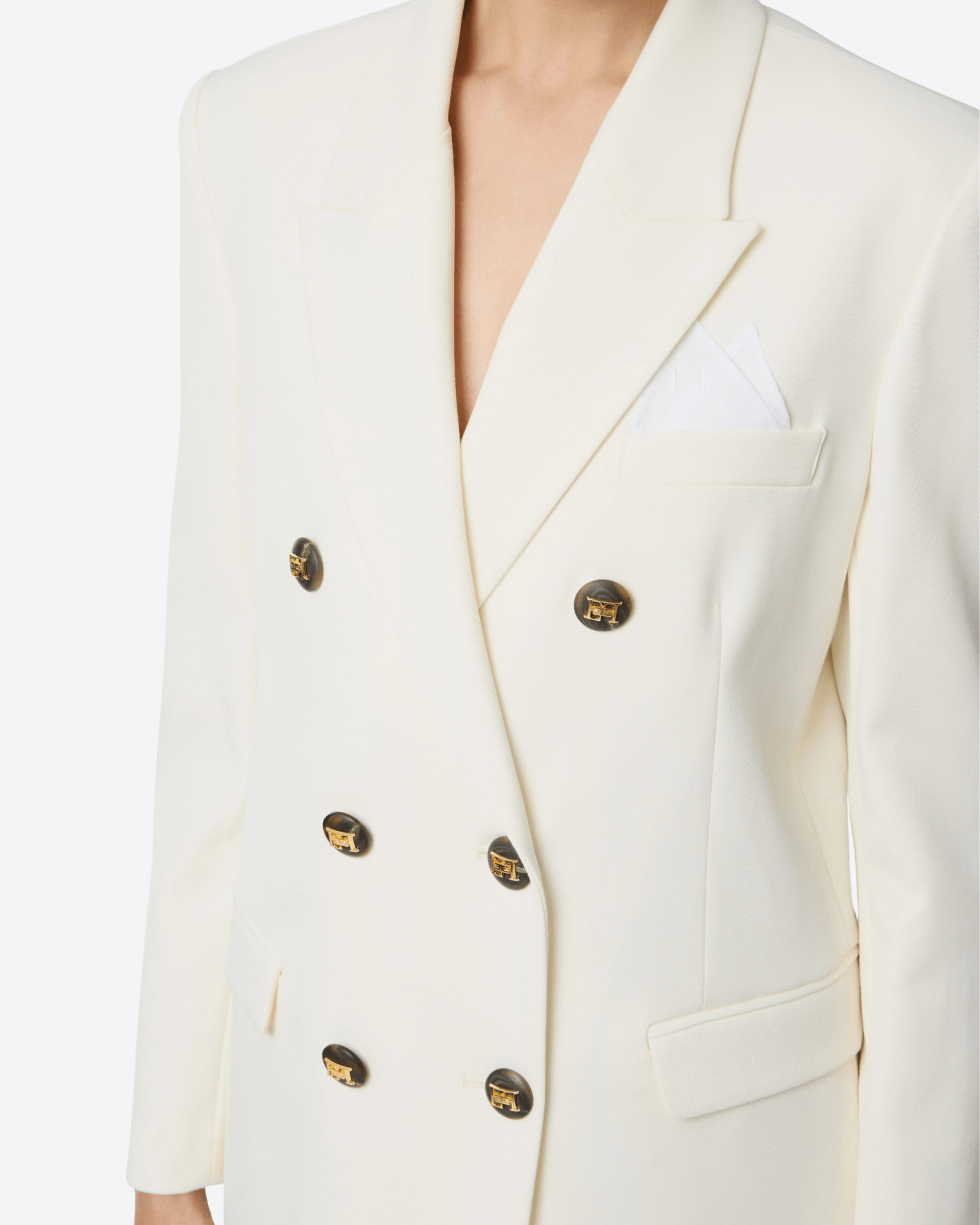 Giacca doppiopetto in gabardina di cotone dalla vestibilità regular. Di ispirazione maschile, il blazer ha spalle strutturate, rever a lancia e taschino con pochette in mussola di cotone ricamata con logo. Dettagli di carattere con la trama diagonale e i bottoni con logo a rilievo.