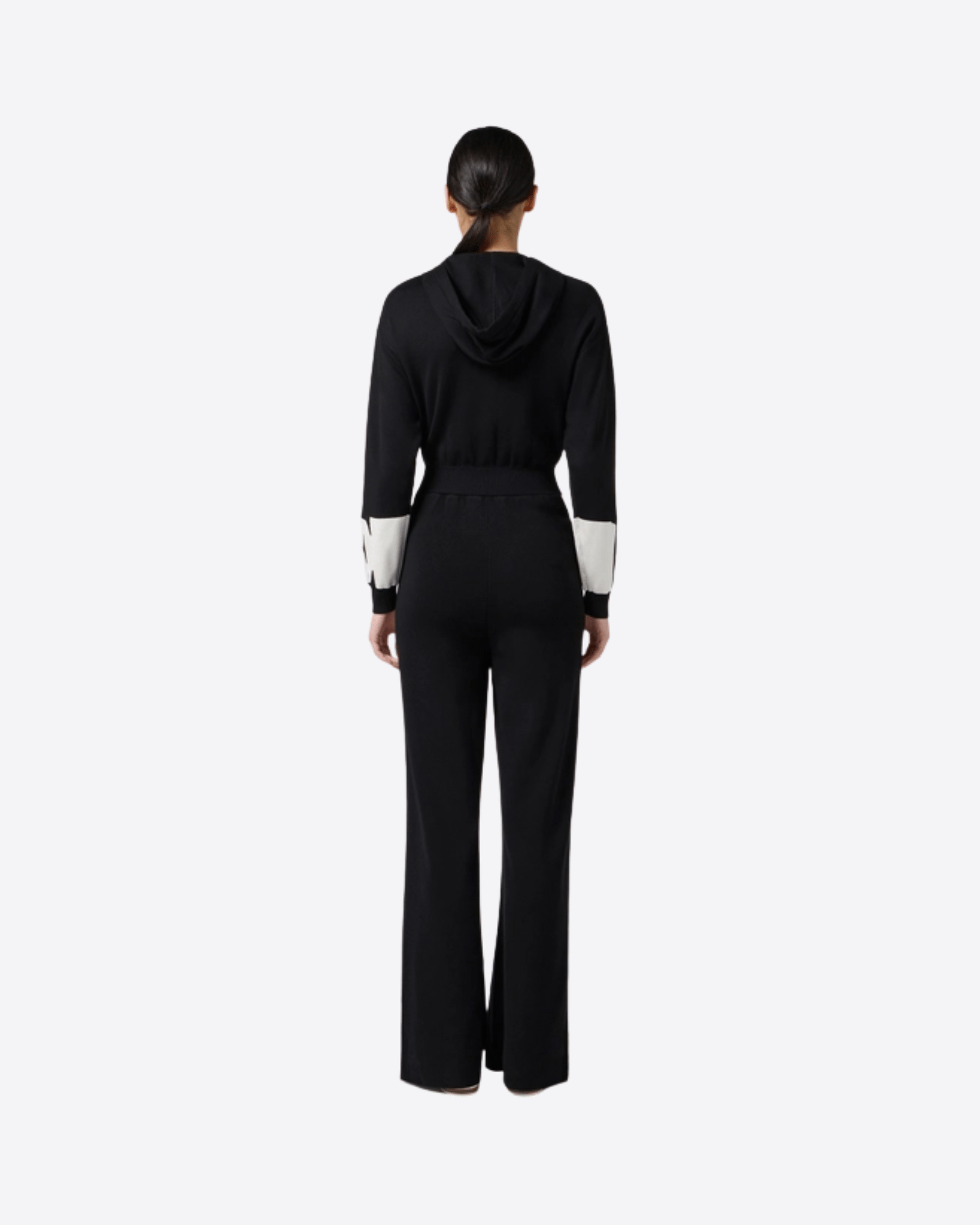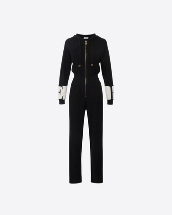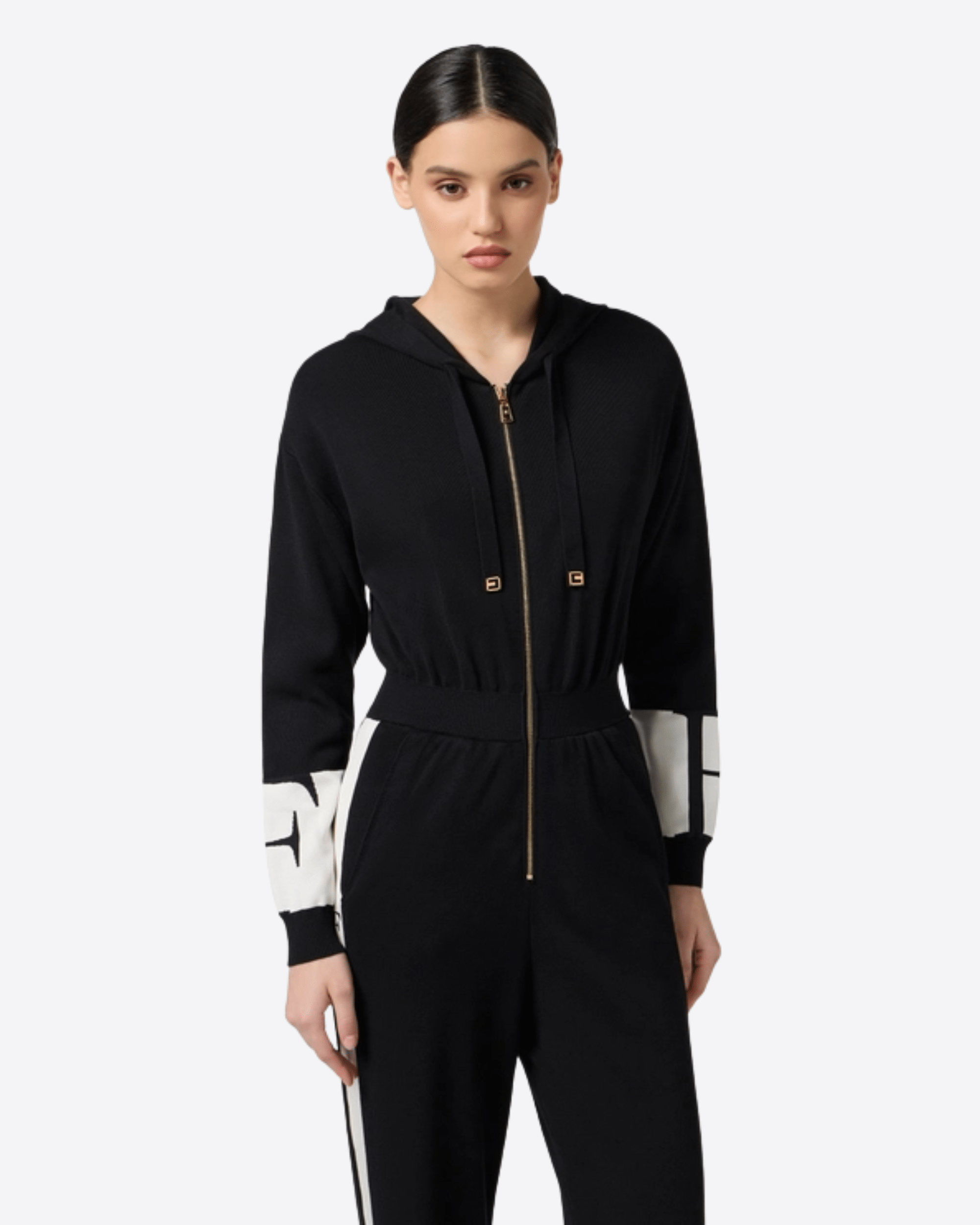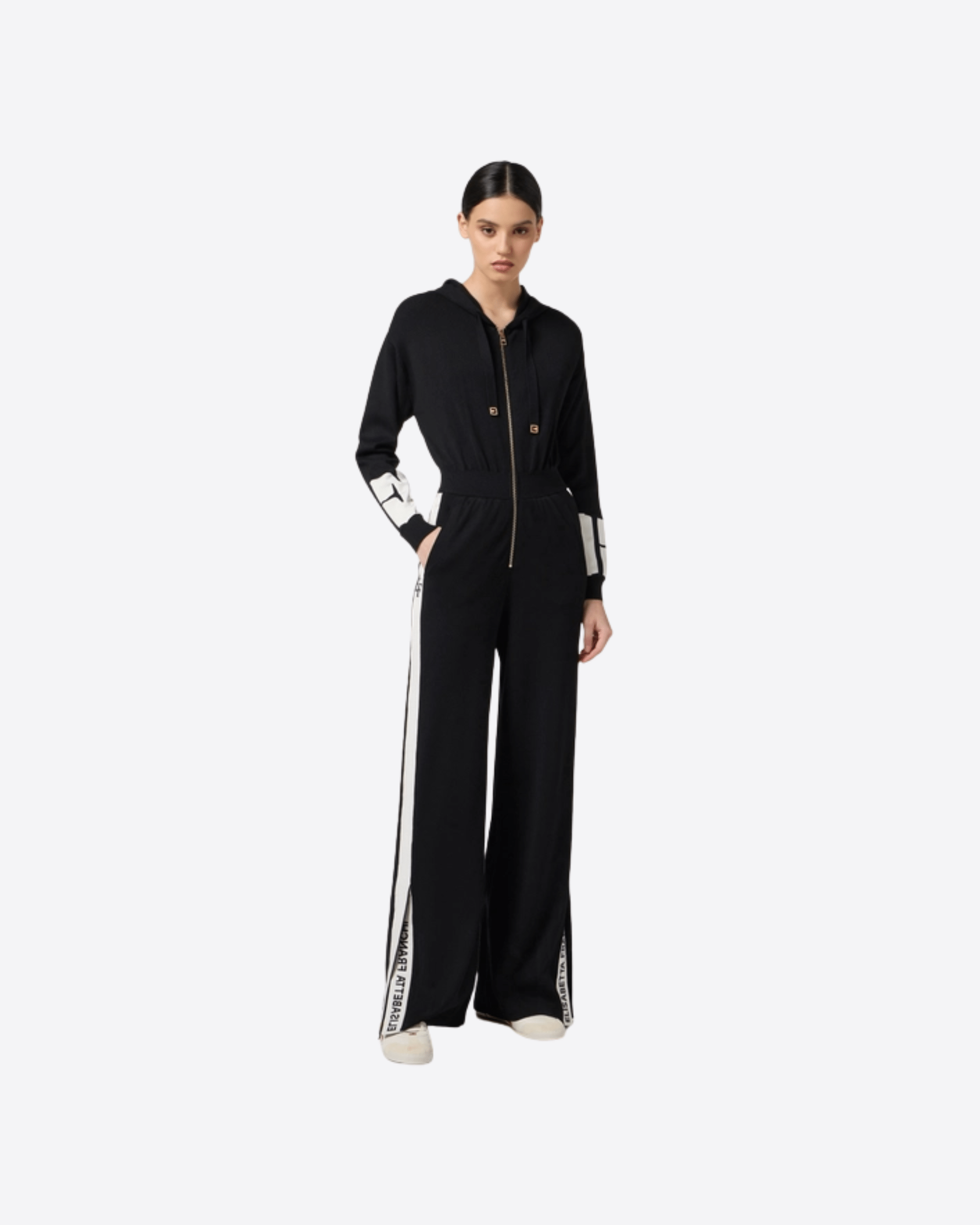 Tuta in viscosa dalla vestibilità regular. Completa di cappuccio con coulisse, ha loghi intarsiati sulle maniche e sulle bande laterali rifinite in viscosa lucida che creano eleganti contrasti di texture. I pantaloni hanno spacchi al fondo gamba che rivelano un ultimo dettaglio logo. Tasche nei fianchi.