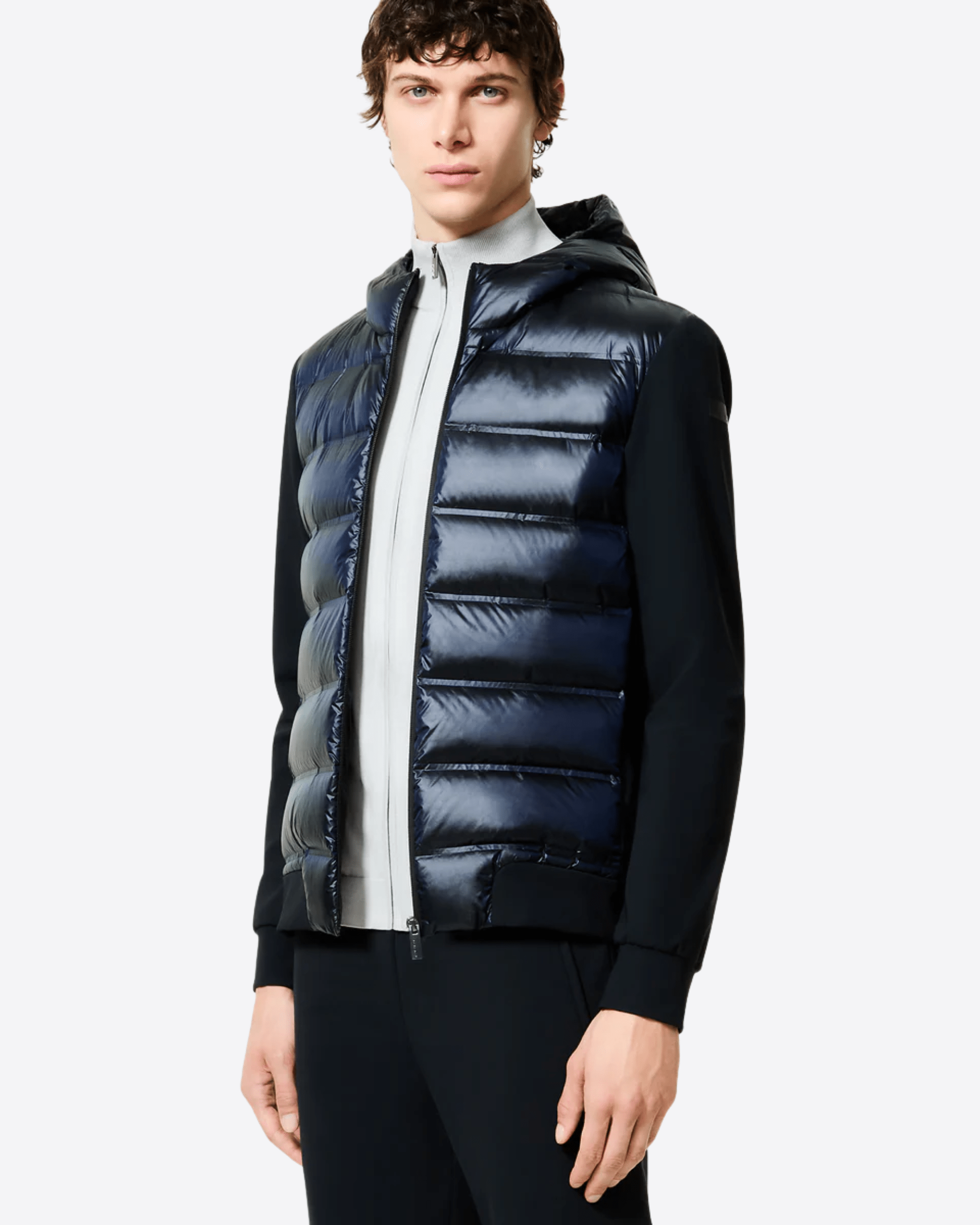 Questa soft jacket con cappuccio imbottito interpreta con stile originale il concetto di versatilità contemporanea attraverso una costruzione ibrida e funzionale. Il davanti presenta la texture priva di impunture dei canali tubici, resistenti a vento e pioggia, che contengono la calda e leggera imbottitura in piuma d'anatra 90/10. Il dorso, le maniche, i polsi e il fondo sono realizzati in esclusivo SURFLEX® elasticizzato, dal look super opaco e antipiega. La silhouette è slanciata dalla zip, affiancata dalle tasche laterali con chiusura invisibile, che completano il design dinamico ed essenziale. All'interno, il taschino con zip invisibile è impreziosito dai dettagli distintivi della doppia nastratura arancio fluo e la tag a cuore "Made with love, designed in Tuscany". Il filetto arancione sul retro e il logo a microiniezione nero sulla manica sinistra completano con una nota emblematica la creazione, ideale per vivere la città e il tempo libero con attitudine sportiva e sofisticata.