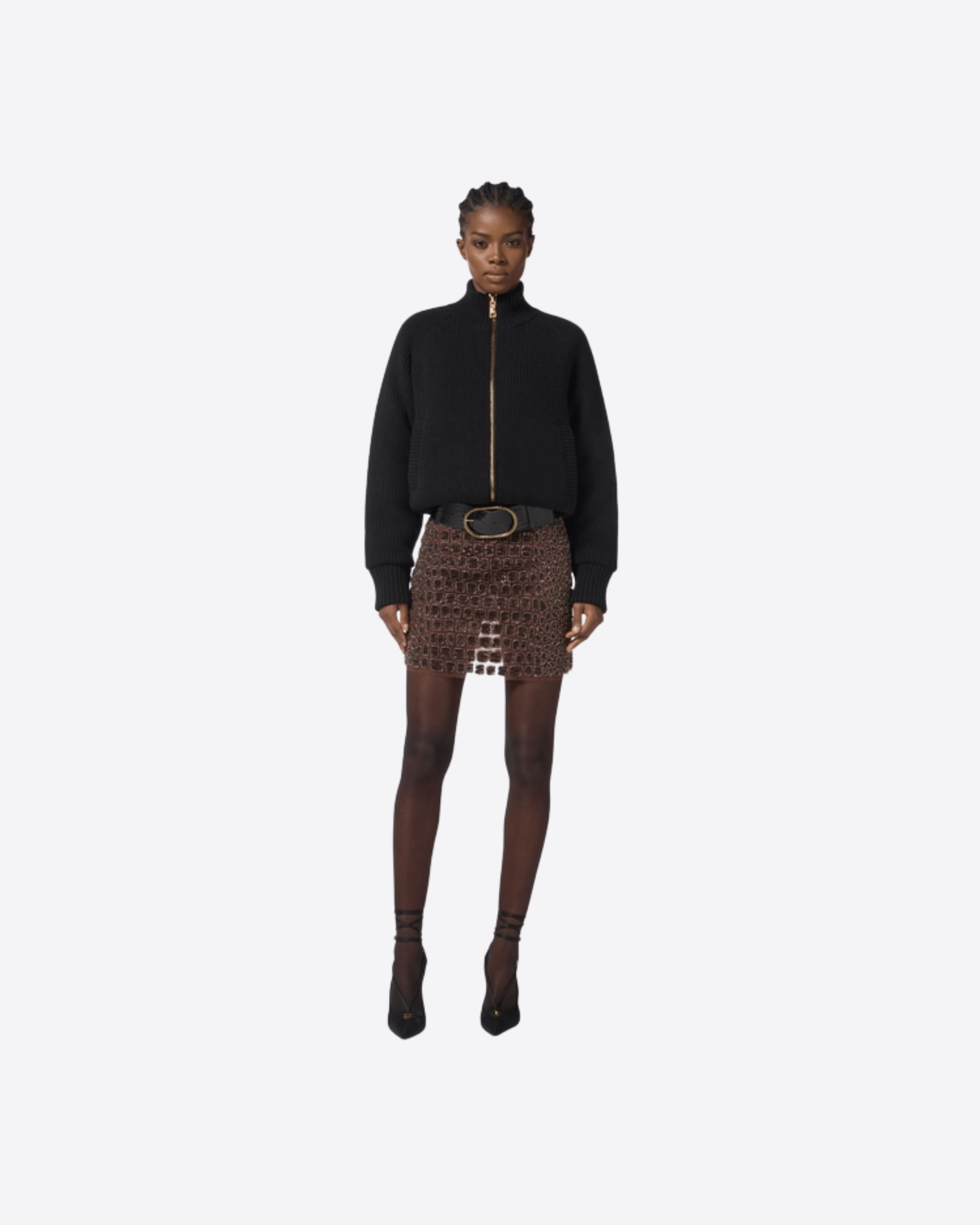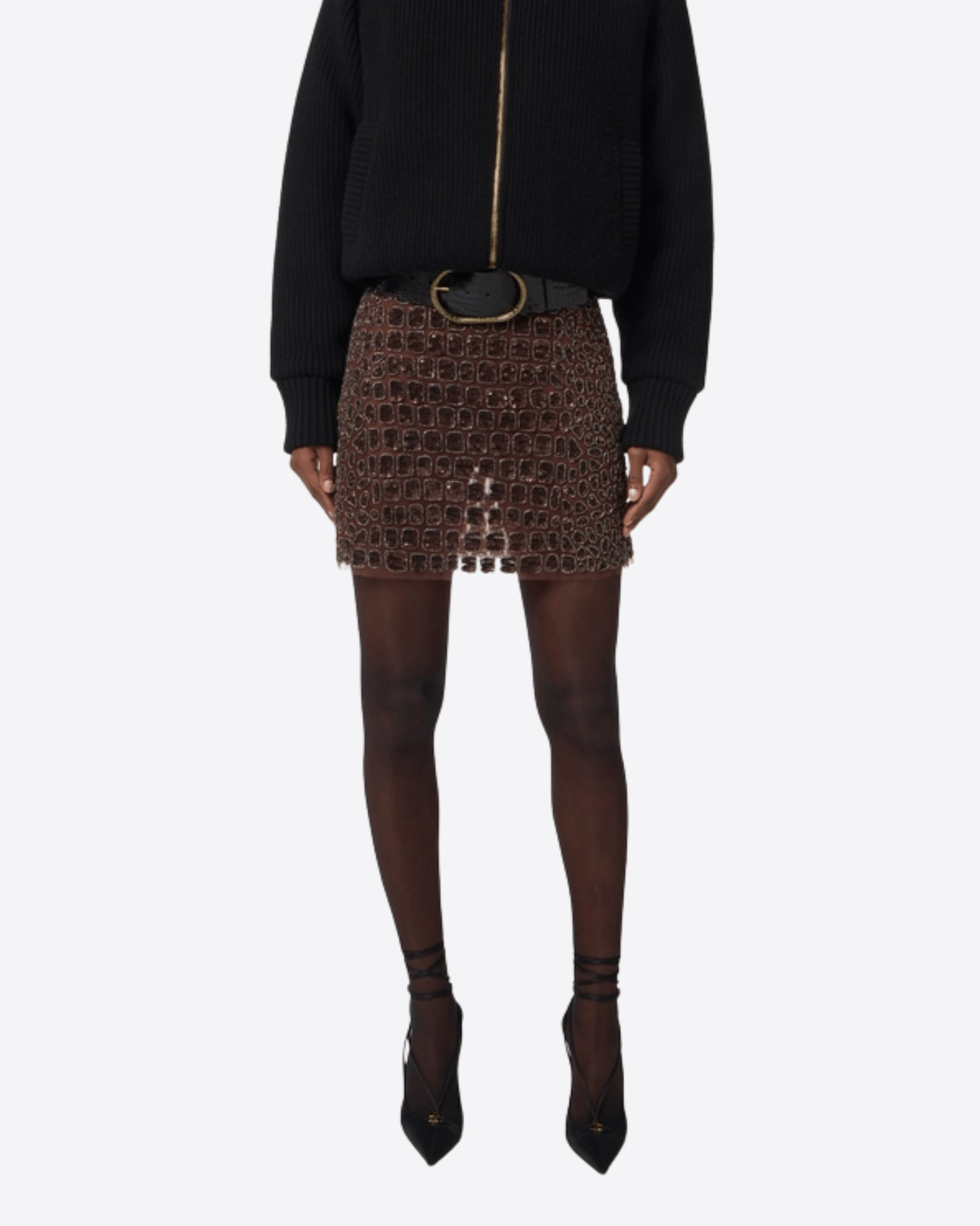 Gonna in tulle dalla vestibilità slim. È impreziosita da brillanti ricami con disegno cocco, a donare luce e tridimensionalità alla texture.