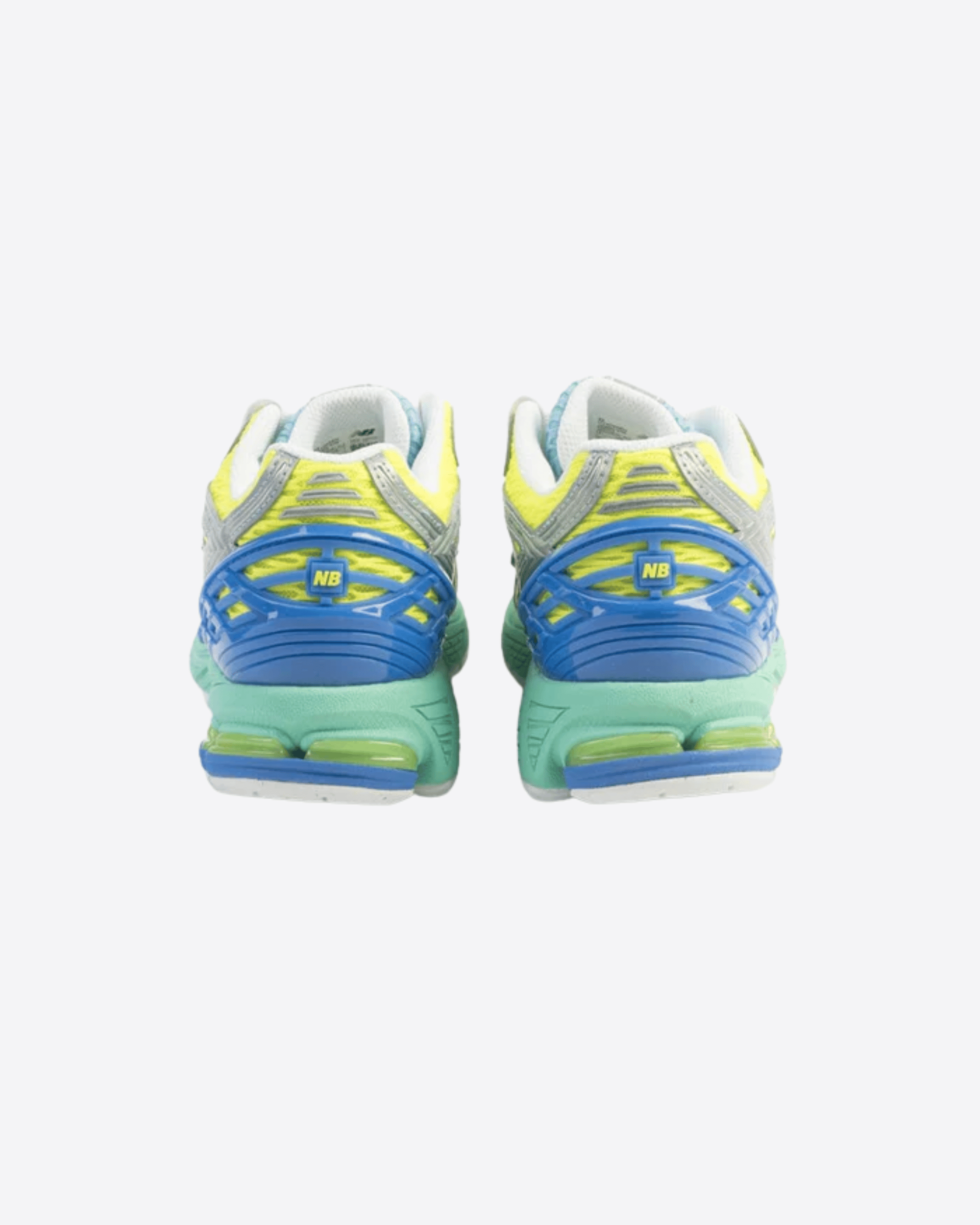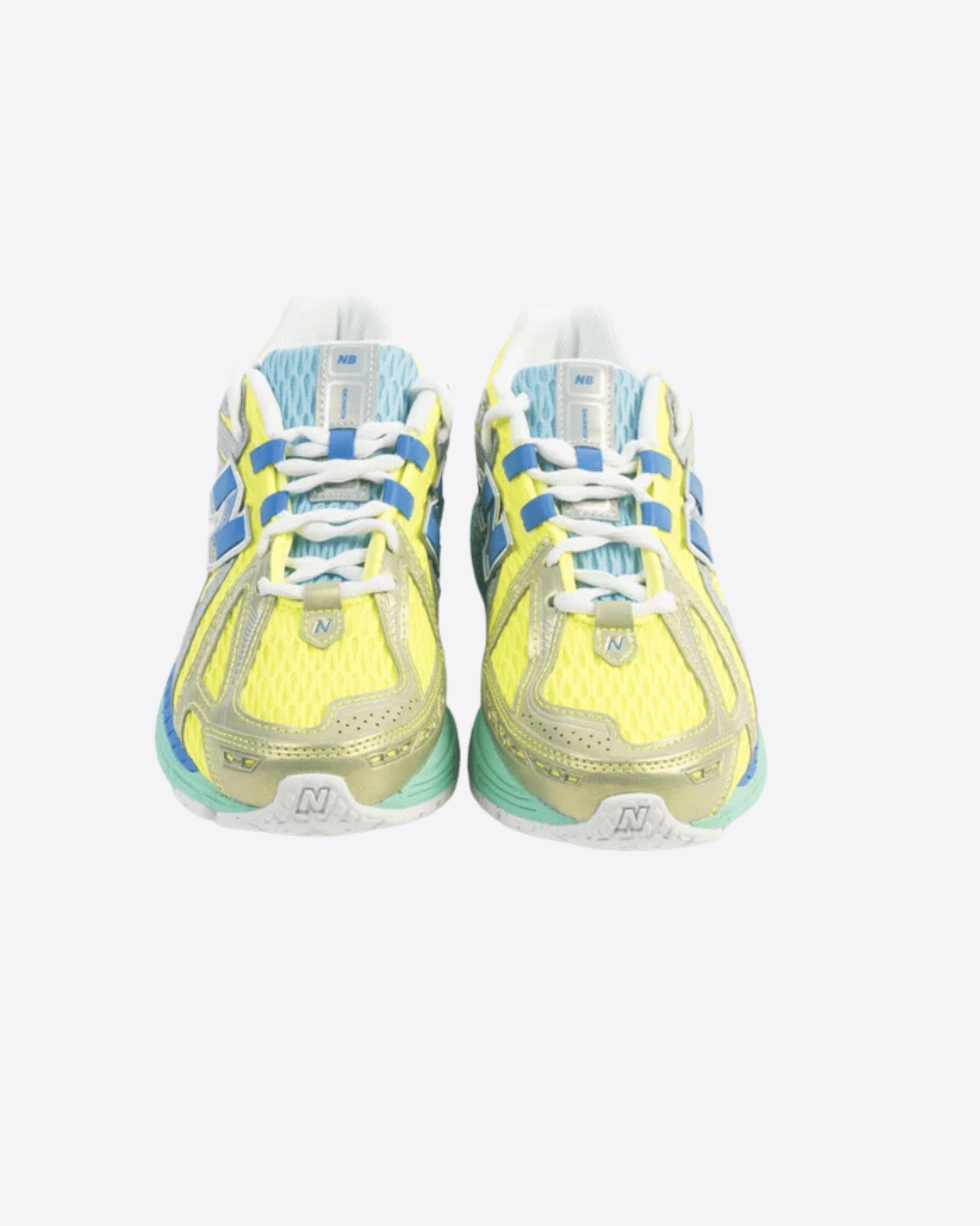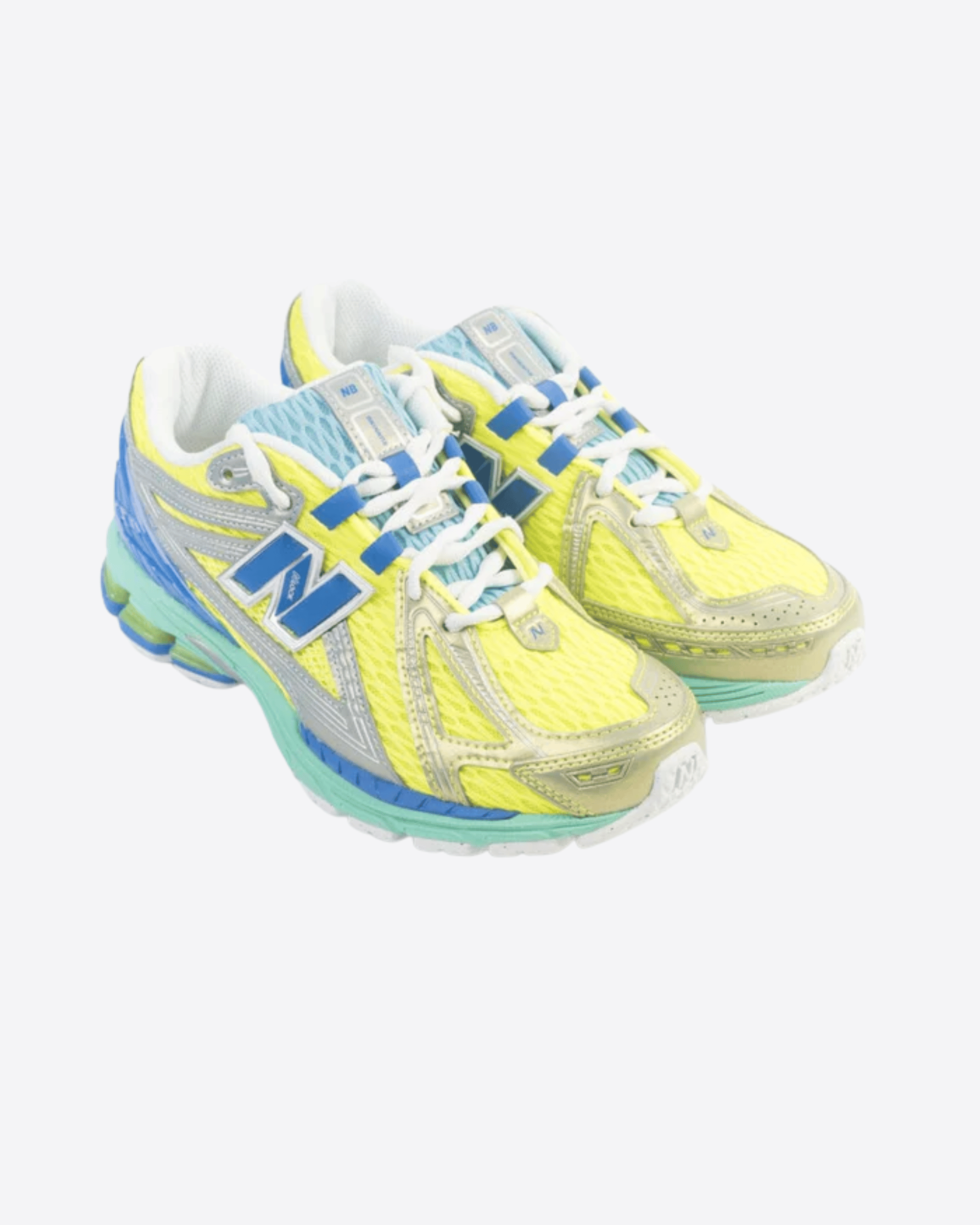Le New Balance 1906 prendono il nome dall’anno di fondazione di New Balance e combinano design autentico e prestazioni moderne. La tomaia in mesh giallo fluo e azzurro dona un forte impatto visivo, arricchita da dettagli in materiale tecnico gommato cangiante nei toni del grigio e platino. L’iconica “N” laterale in tessuto azzurro e il tallone rinforzato in gomma dello stesso colore aggiungono carattere e struttura, mentre i lacci bianchi completano il look con un tocco pulito. Il nuovo fondo in gomma nei colori verde acqua e blu assicura comfort e stabilità nella calzata, supportato dall’intersuola ABZORB che garantisce un’ammortizzazione efficace e duratura.