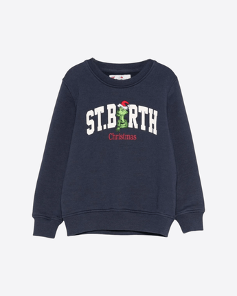 Felpa per bambino MC2 Saint Barth Kids di colore blu con stampa grafica ispirata a Il Grinch. Presenta scollo rotondo, maniche lunghe, orlo a coste e polsini a coste. Un capo comodo e divertente, perfetto per aggiungere un tocco giocoso al guardaroba invernale dei più piccoli.