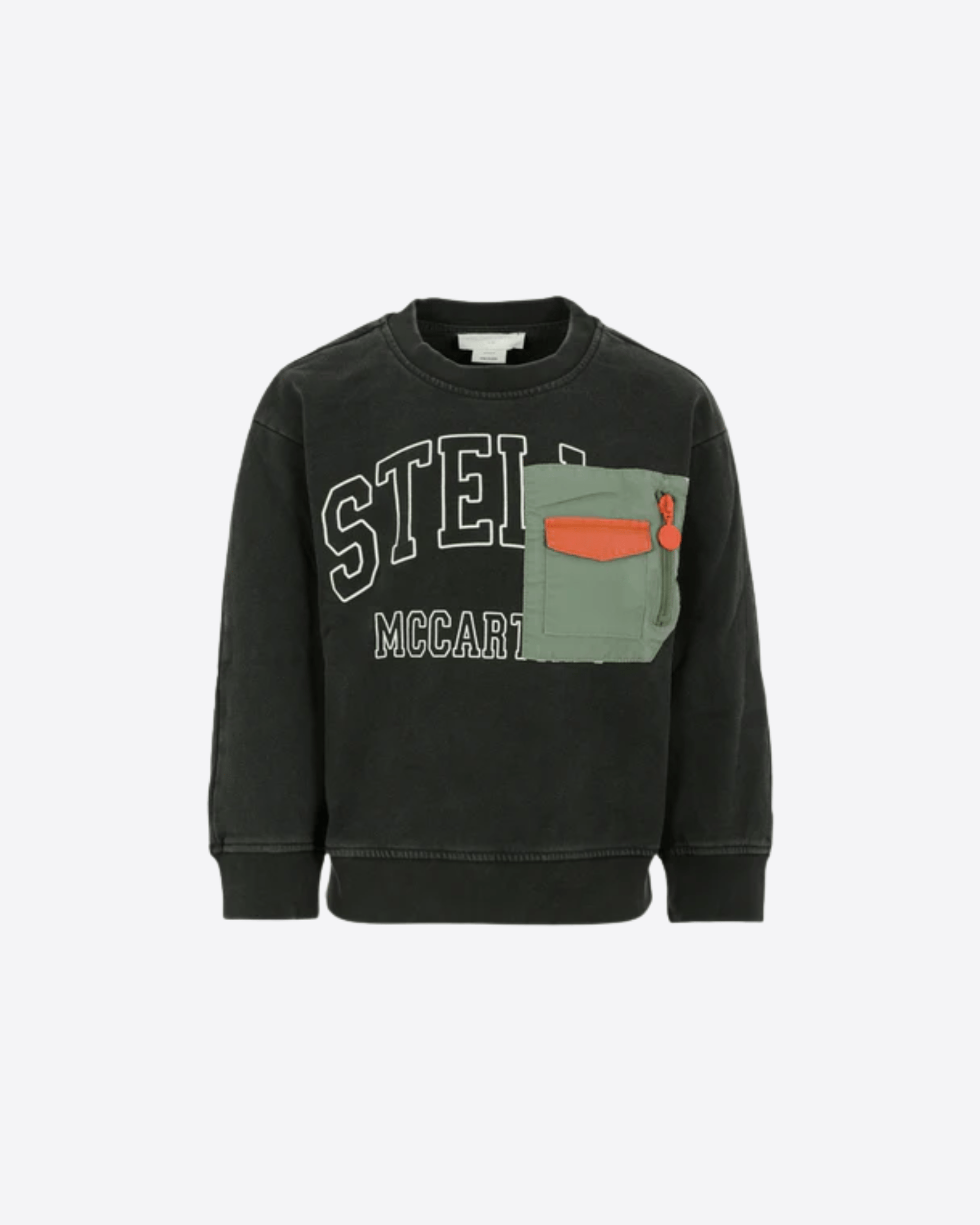 Felpa nera Stella McCartney Kids realizzata in cotone felpato organico con effetto délavé. Il modello presenta maniche lunghe, girocollo e finiture a costine su polsini e orlo. È arricchita da una tasca verde con zip laterale e da un taschino con patta sul petto. La stampa del logo sulla parte anteriore completa il design con un tocco moderno e funzionale.