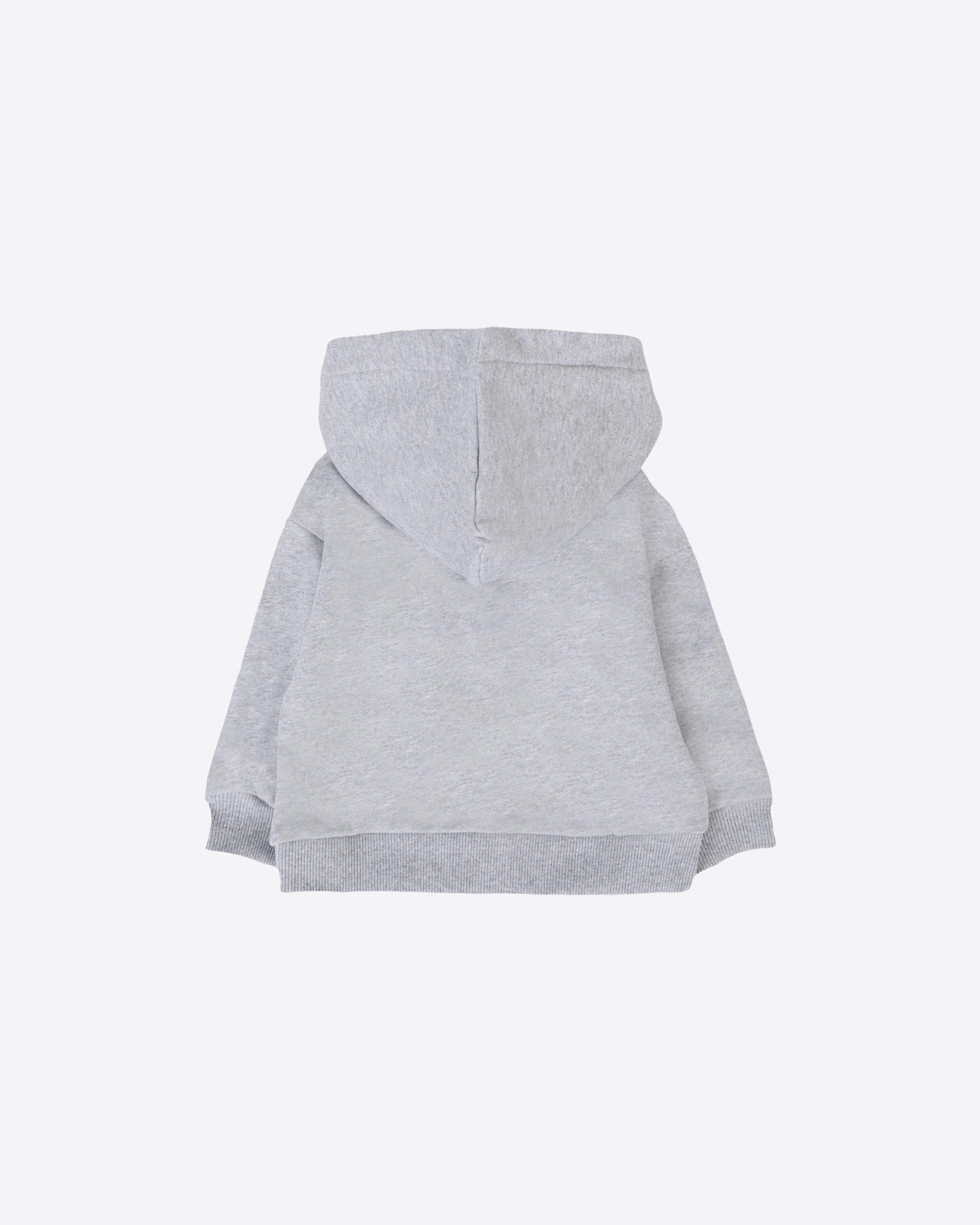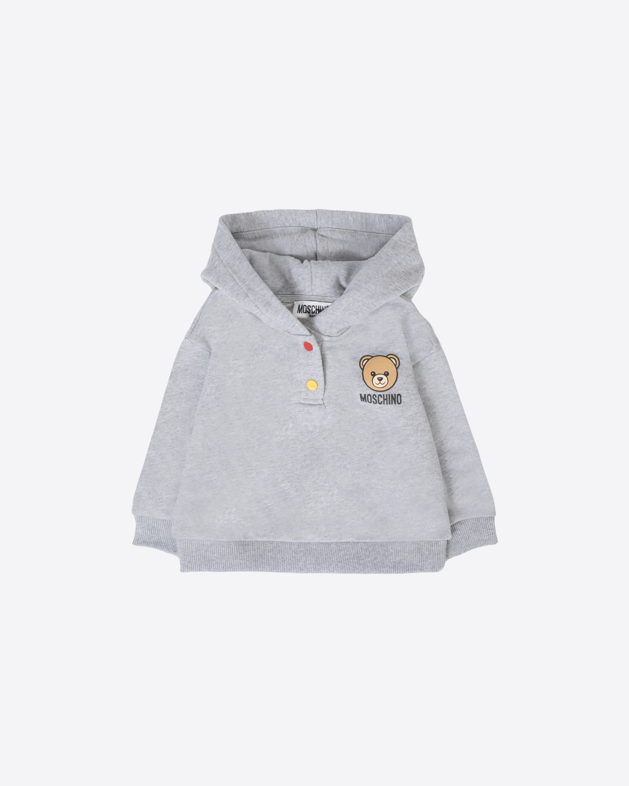 Felpa grigia del brand Moschino Kids, realizzata in cotone garzato, con cappuccio, maniche lughe, orlo e polsini a costine e chiusura con bottoni automatici colorati sulla parte anteriore. È decorata con Teddy Bear e logo nero sul petto.