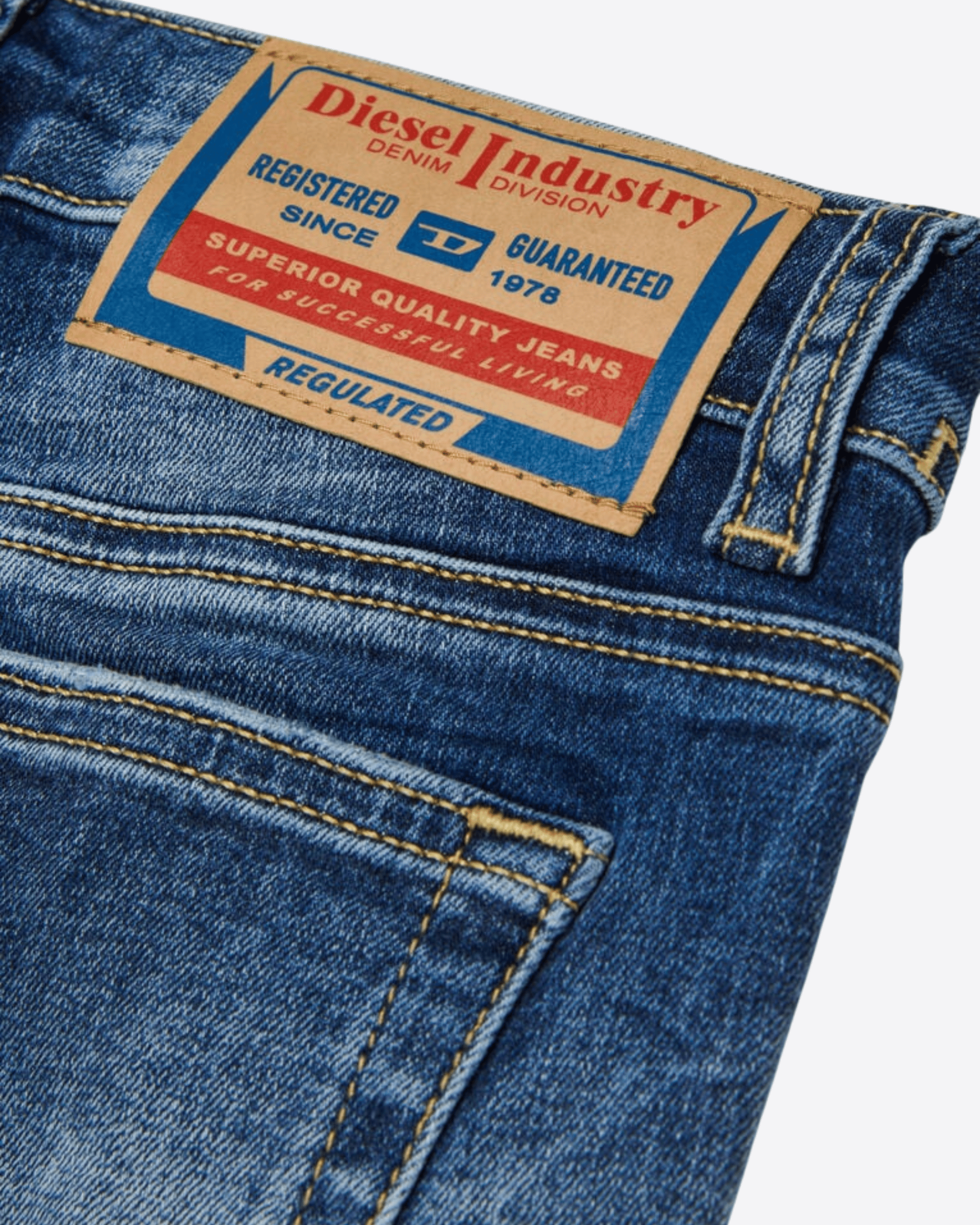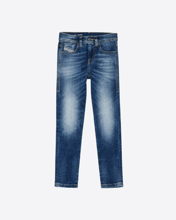 Denim junior con l'iconico design a cinque tasche e dalla vestibilità regular. Realizzati in comodo cotone elasticizzato che garantisce una grande libertà di movimento. Sono stati lavorati per ottenere un effetto used e hanno la classica patch sulla tasca posteriore.