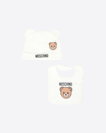 Set accessori avorio del brand Moschino kids, in cotone composto da cappello e bavaglino. Cappello con orecchie, decorato con stampa Teddy Bear e logo nero. Bavaglino con bottone automatico, decorato con stampa Teddy Bear e logo nero.
