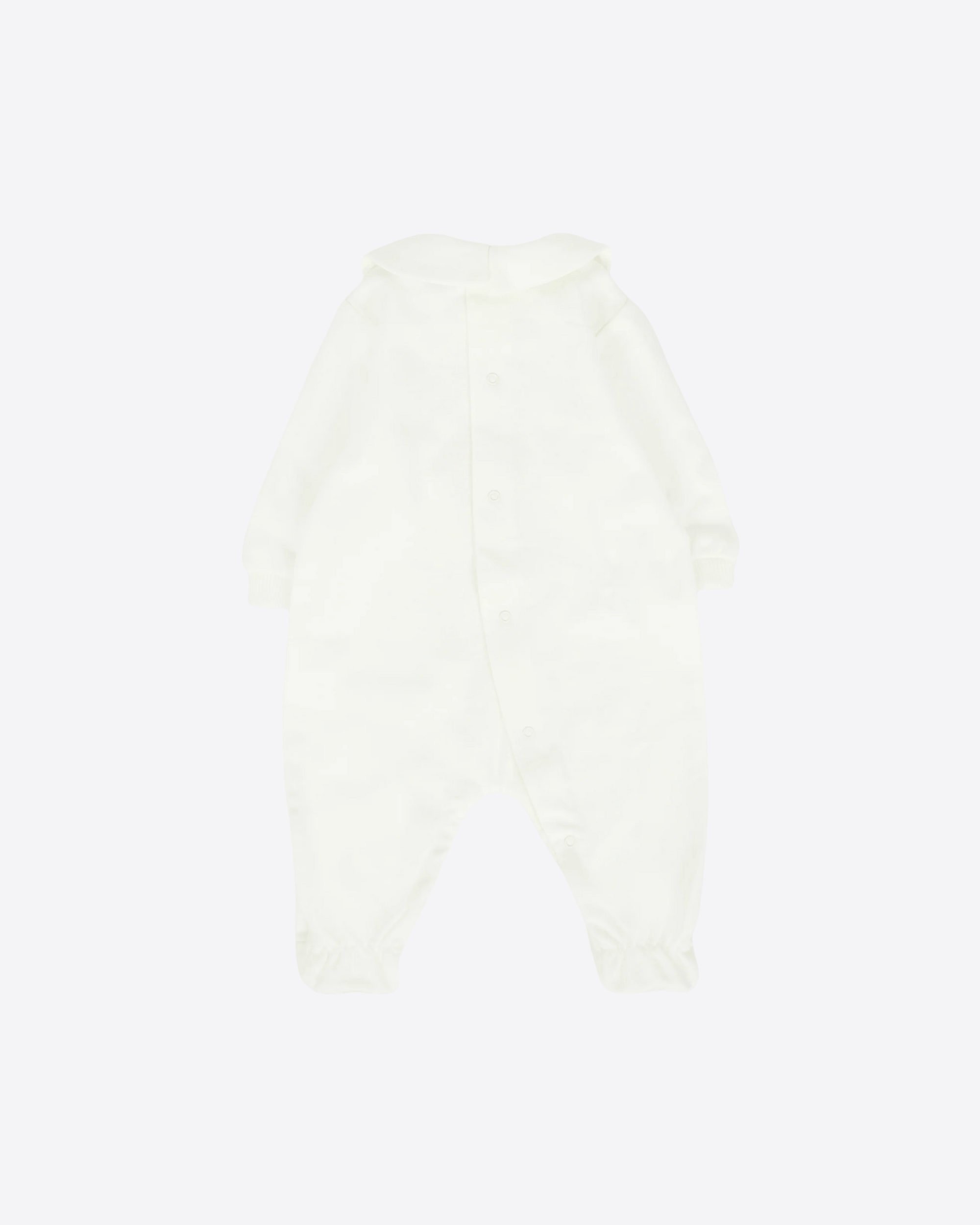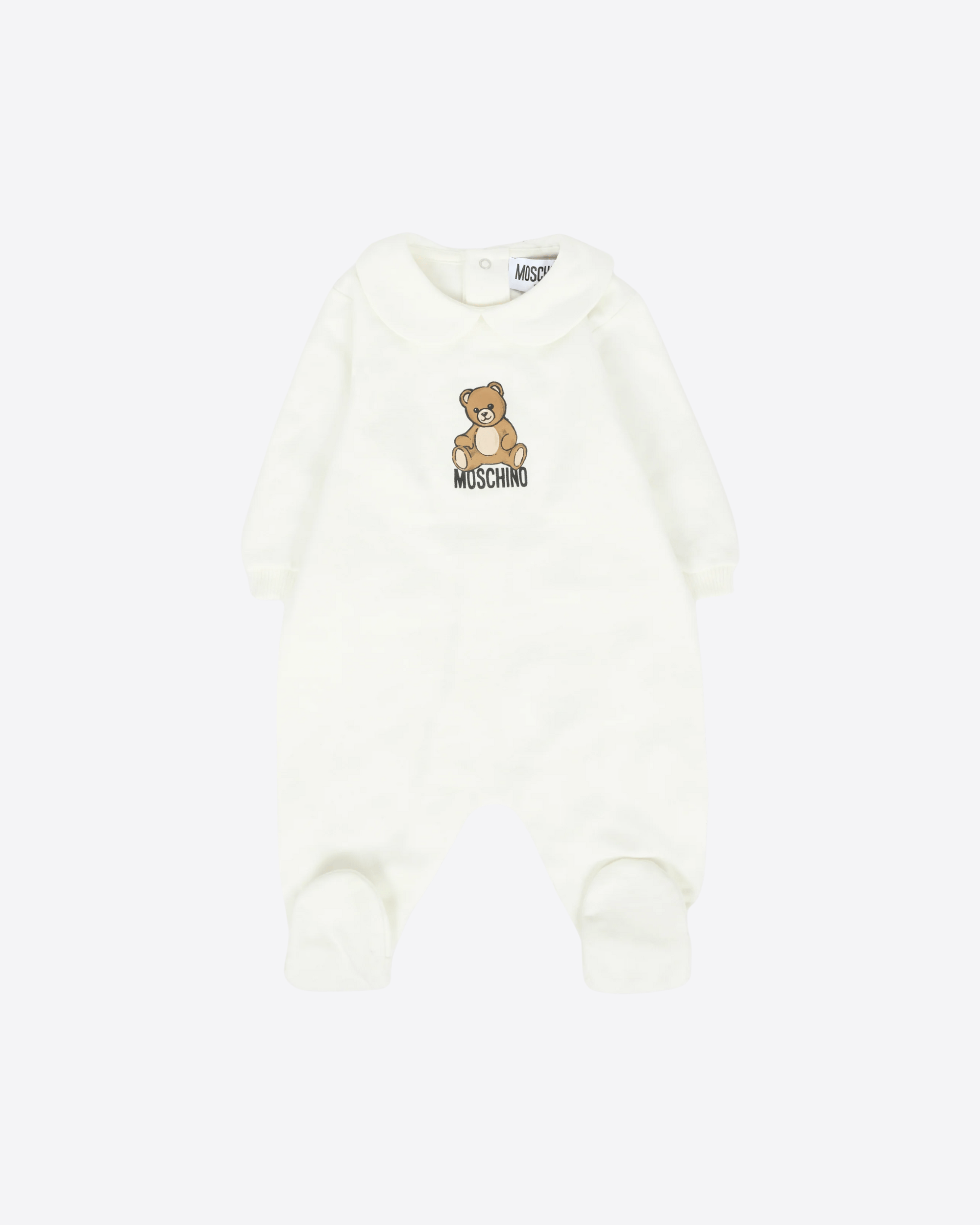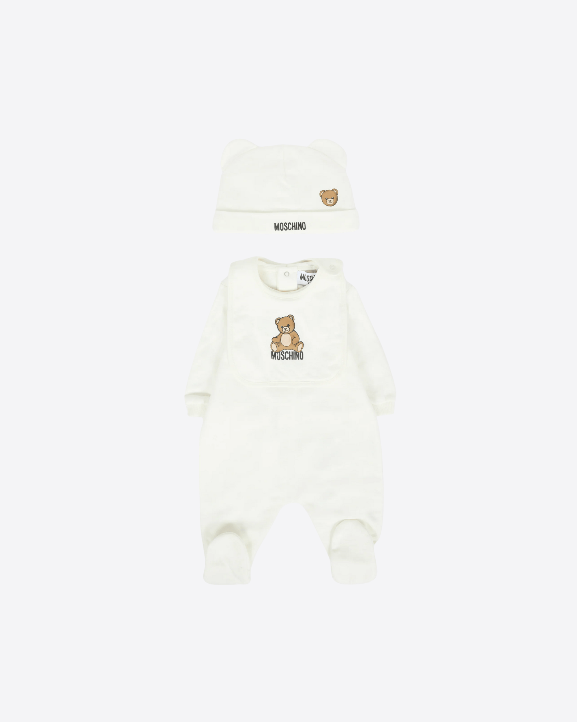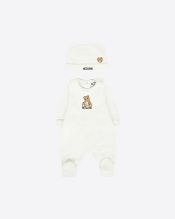 Set tutine avorio del brand Moschino Kids, composto da tutina, bavaglino e berretto. Tutina in cotone felpato, a maniche lunghe, on colletto peter pan bianco, bottoni automatici sul retro, polsini a costine e piedini; berretto con risvolto e orecchie applicate sui lati; bavaglino con bottone automatico laterale. È decorato con stampa Teddy Bear e logo, sulla parte anteriore.