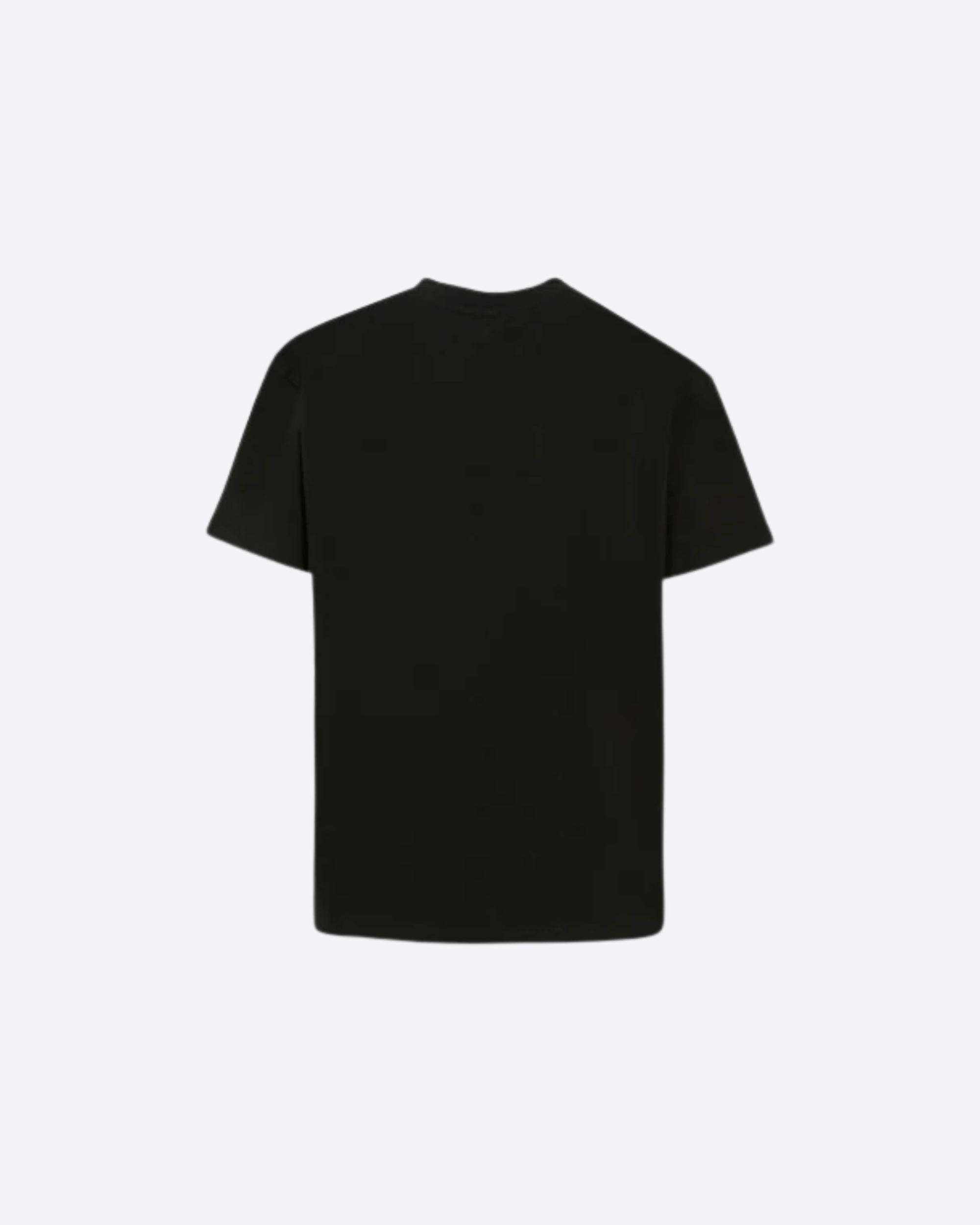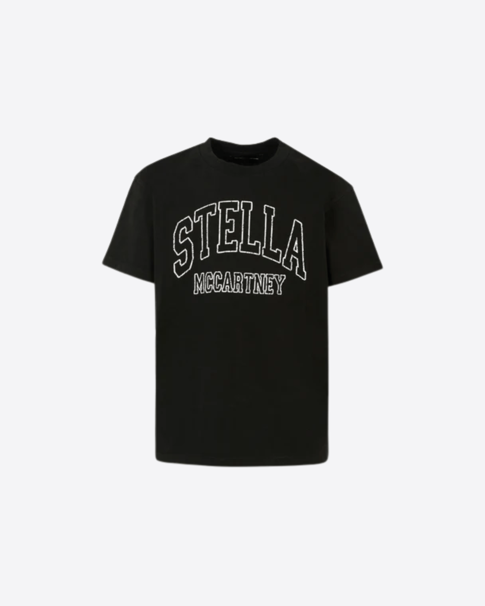T-shirt nera Stella McCartney Kids in cotone organico, con maniche corte e girocollo a costine. La parte anteriore è decorata con una stampa logo effetto vintage, per un look casual e distintivo.