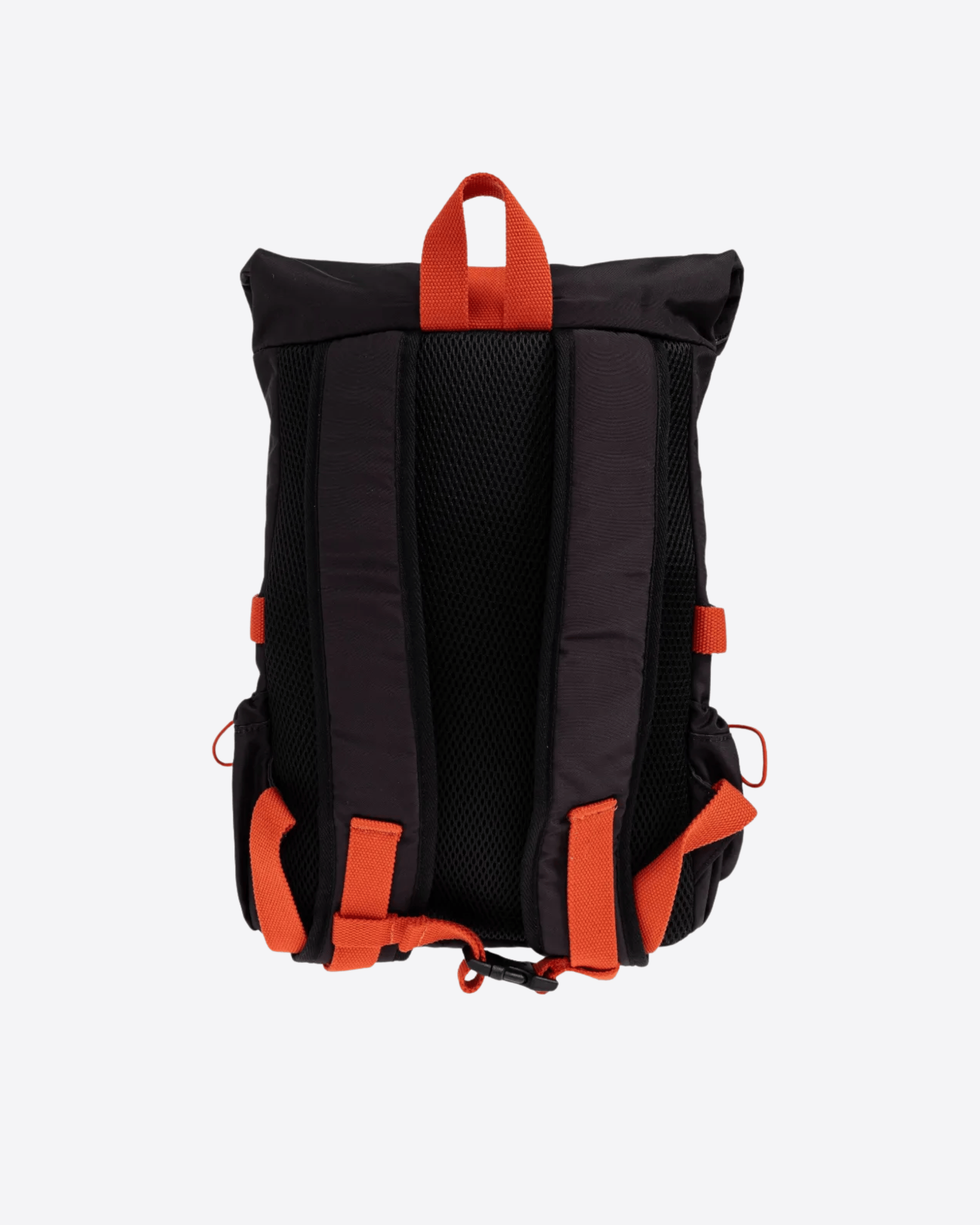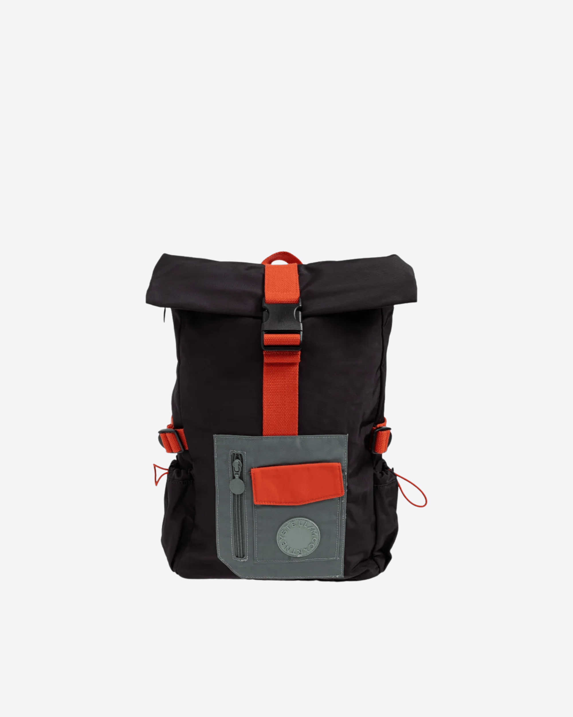Zaino Stella McCartney Kids nero con chiusura arrotolabile e fibbia. Presenta spalline arancioni regolabili e una tasca frontale con zip, unendo praticità e stile contemporaneo.