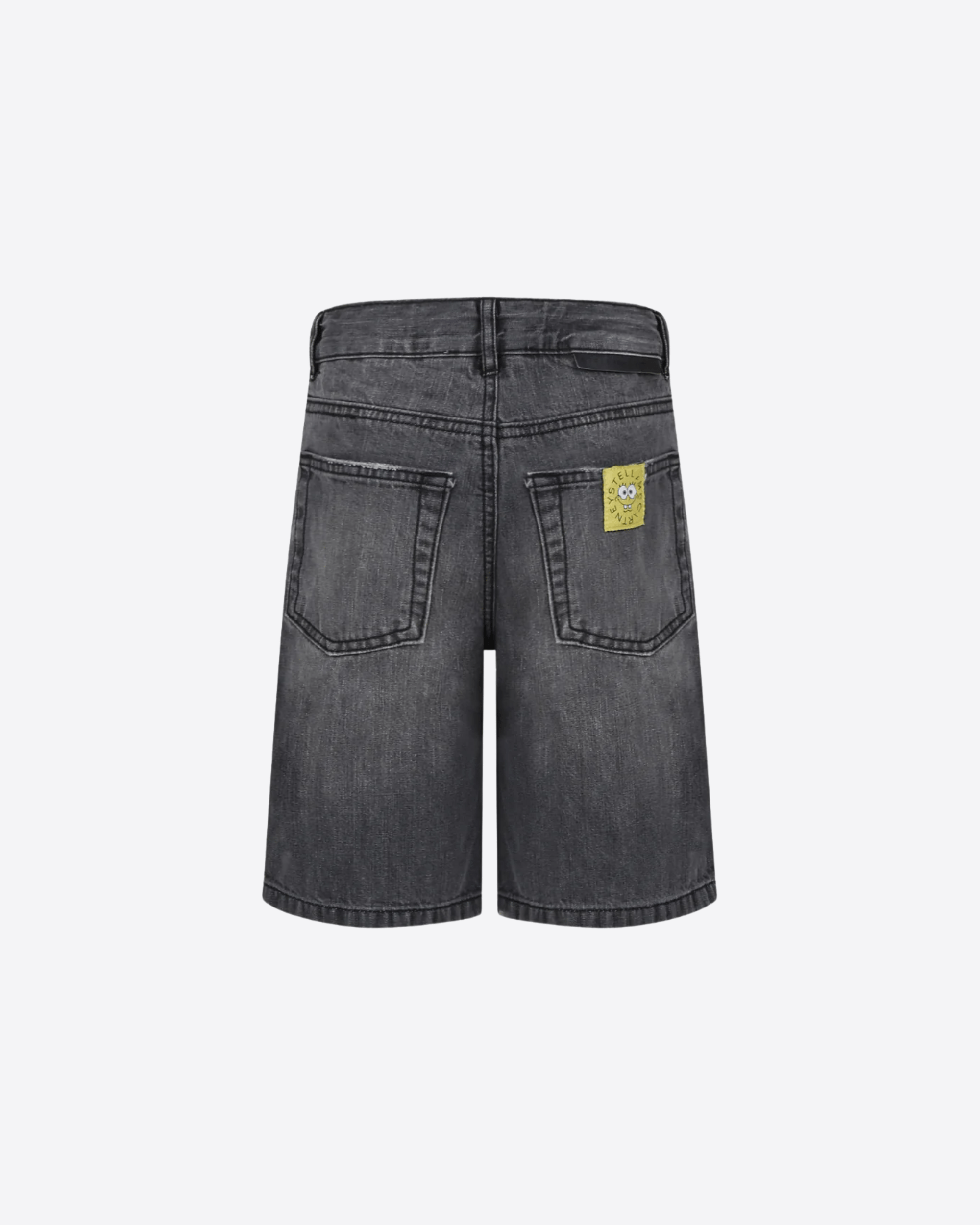 Shorts grigi in cotone organico certificato GOTS, cinque tasche, con passanti per cintura, chiusura frontale con zip e gancio e vita regolabile grazie ad elastico interno con bottoni. Sono decorati con stampa SpongeBob e l'amico Patrick, sulla parte anteriore e con patch logata sul retro. Questo capo fa parte di una capsule esclusiva SpongeBob x Stella Mccartney.