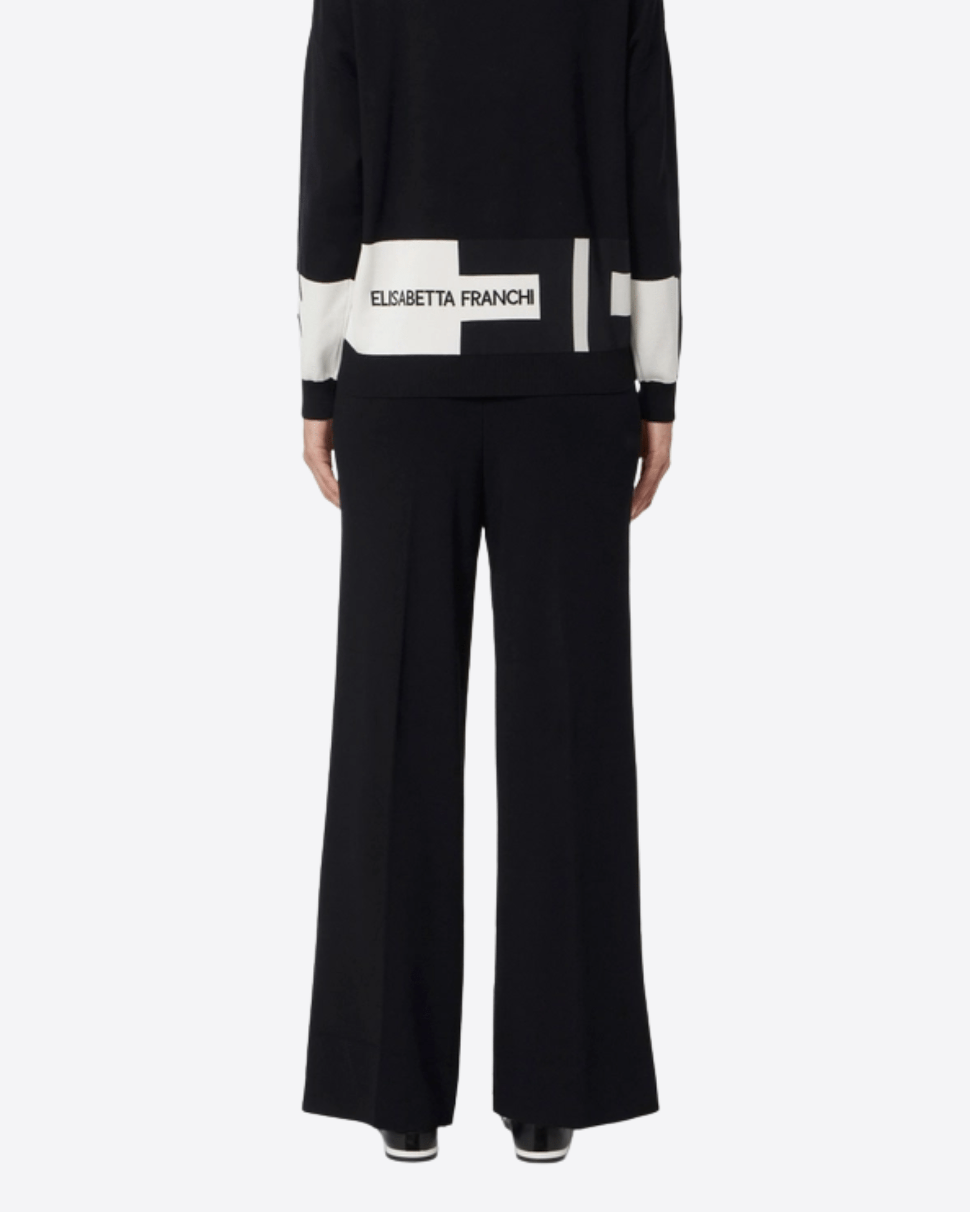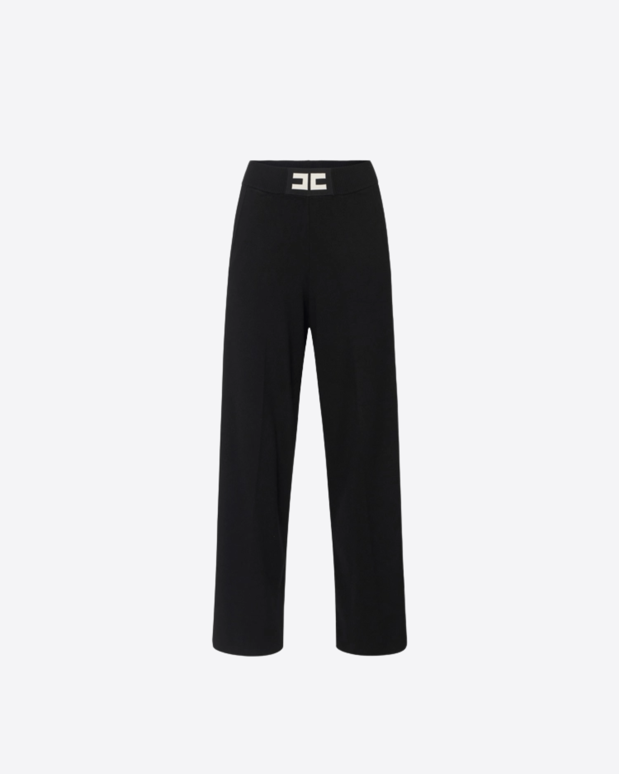 Pantaloni in viscosa dalla vestibilità regular. Si distinguono per il logo centrale in vita e per le bande laterali rifinite in viscosa lucida che creano eleganti contrasti di texture e colore coi loghi laterali. La linea a palazzo è esaltata dagli spacchi al fondo gamba che rivelano un ultimo dettaglio logo.