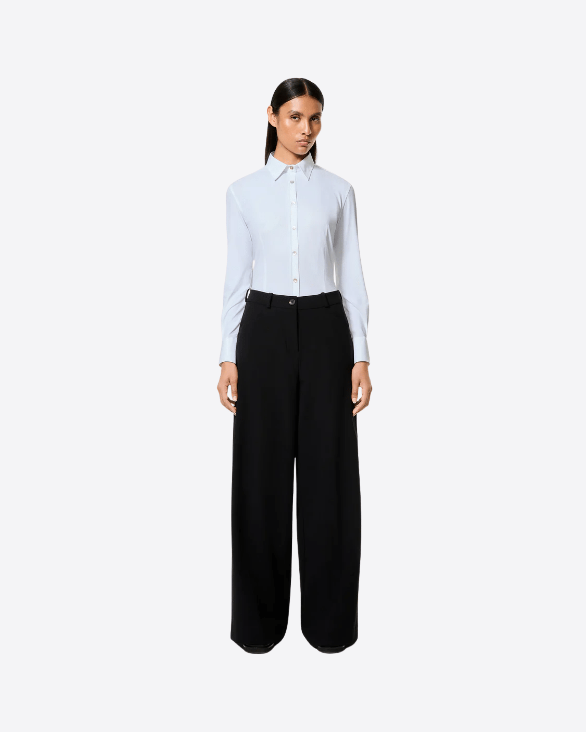 Espressione di un'eleganza moderna e consapevole, questi pantaloni si distinguono per la silhouette a palazzo che valorizza con naturalezza la linea femminile. Realizzati nell'esclusivo tessuto Surflex® stretch invernale, combinano un'elegante finitura opaca con la mano sorprendentemente morbida. Le proprietà antipiega ed easy care ne fanno un capo dal carattere pratico e distintivo, pensato per accompagnare con stile il ritmo dinamico della quotidianità. Le tasche alla carrettera e la chiusura con bottone in vero corno aggiungono una nota di sofisticata essenzialità. Ideali in abbinamento al blazer monopetto coordinato per un look urban chic, rappresentano la scelta perfetta per chi ricerca un equilibrio armonioso tra funzionalità, comfort e raffinatezza.