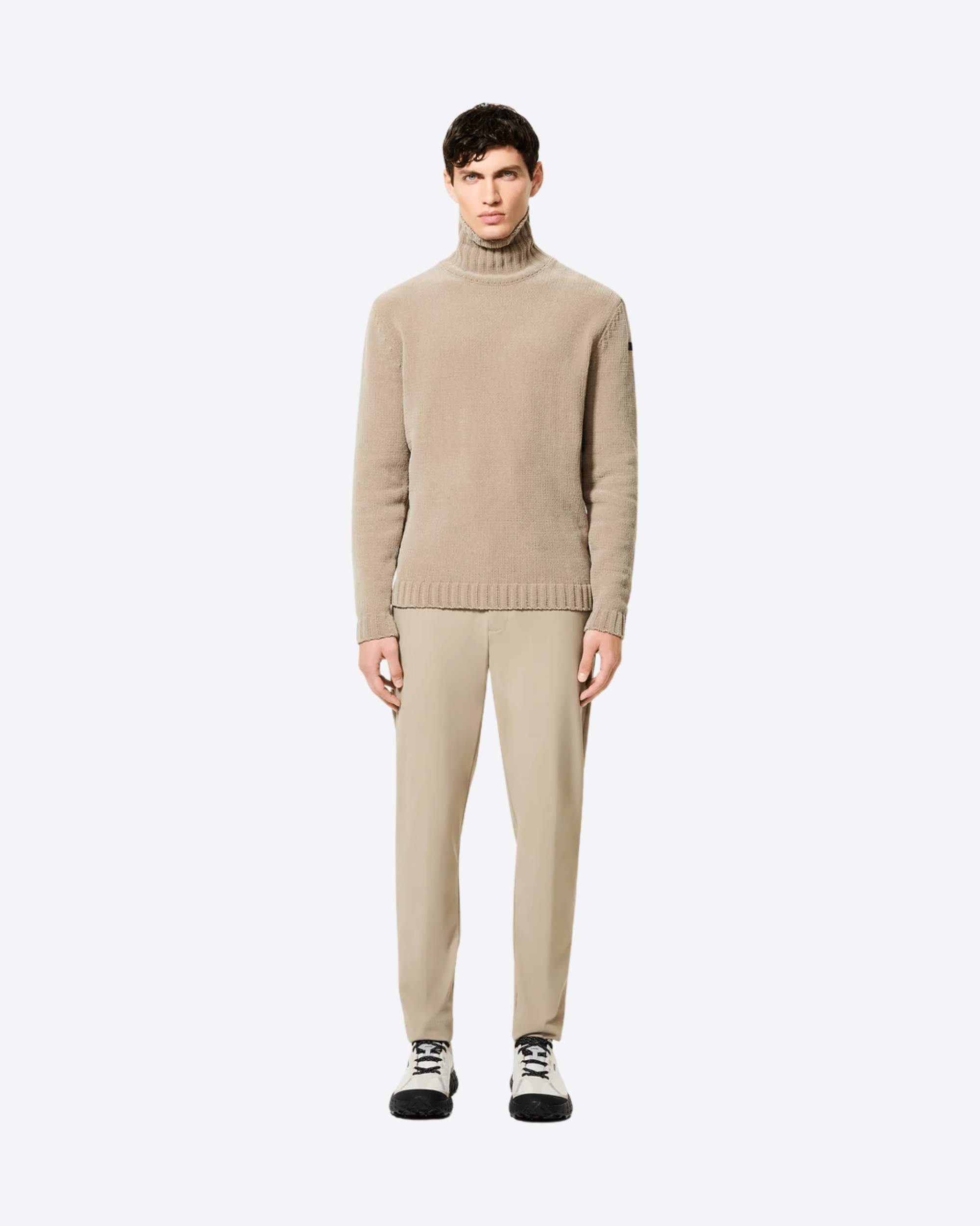 Sintesi perfetta di eleganza disinvolta e funzionalità quotidiana, il chino invernale dal fit regolare è realizzato in esclusivo tessuto stretch SURFLEX® antipiega, no stiro e caratterizzato da una mano straordinariamente liscia. La finitura super opaca esalta la palette di tonalità sobrie e raffinate, perfette per accompagnare con stile la stagione fredda. Il modello a vita media è arricchito da dettagli sartoriali come la cintura con passanti, chiusa da un bottone in corno naturale. È dotata di coulisse interna ed elastico per un comfort personalizzato. L'interno svela la stampa dell'iconico Monogram Razzle Dazzle in nero. La zip frontale è nascosta dalla pattina, mentre le tasche alla francese - con pratico tiretto elastico sul lato destro - si affiancano alle posteriori a filo. Il logo nero a microiniezione firma il capo con una nota di stile distintivo. Versatile e raffinato, questo chino continuativo si presta perfettamente a un abbinamento con blazer coordinato e camicia Oxford per un outfit adatto all'occasione professionale, o a una maglia della Collezione per un look smart casual ricercato.