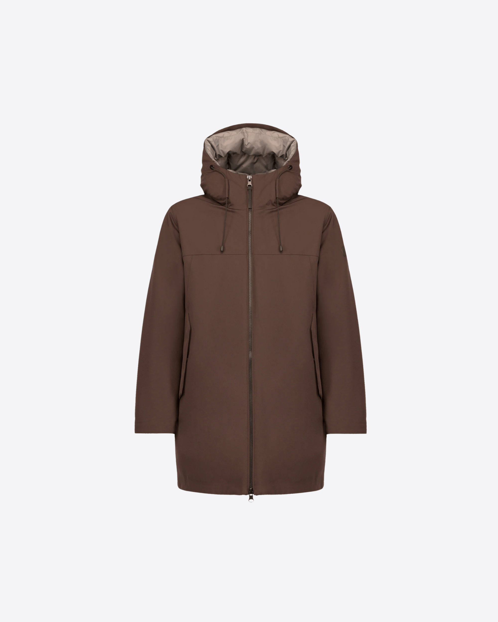 Giaccone in tessuto tecnico tre strati con membrana, progettato per garantire protezione, comfort e calore nelle giornate fredde. Il cappuccio con coulisse e l’interno collo in costina anti-peeling assicurano comfort e protezione aggiuntiva.