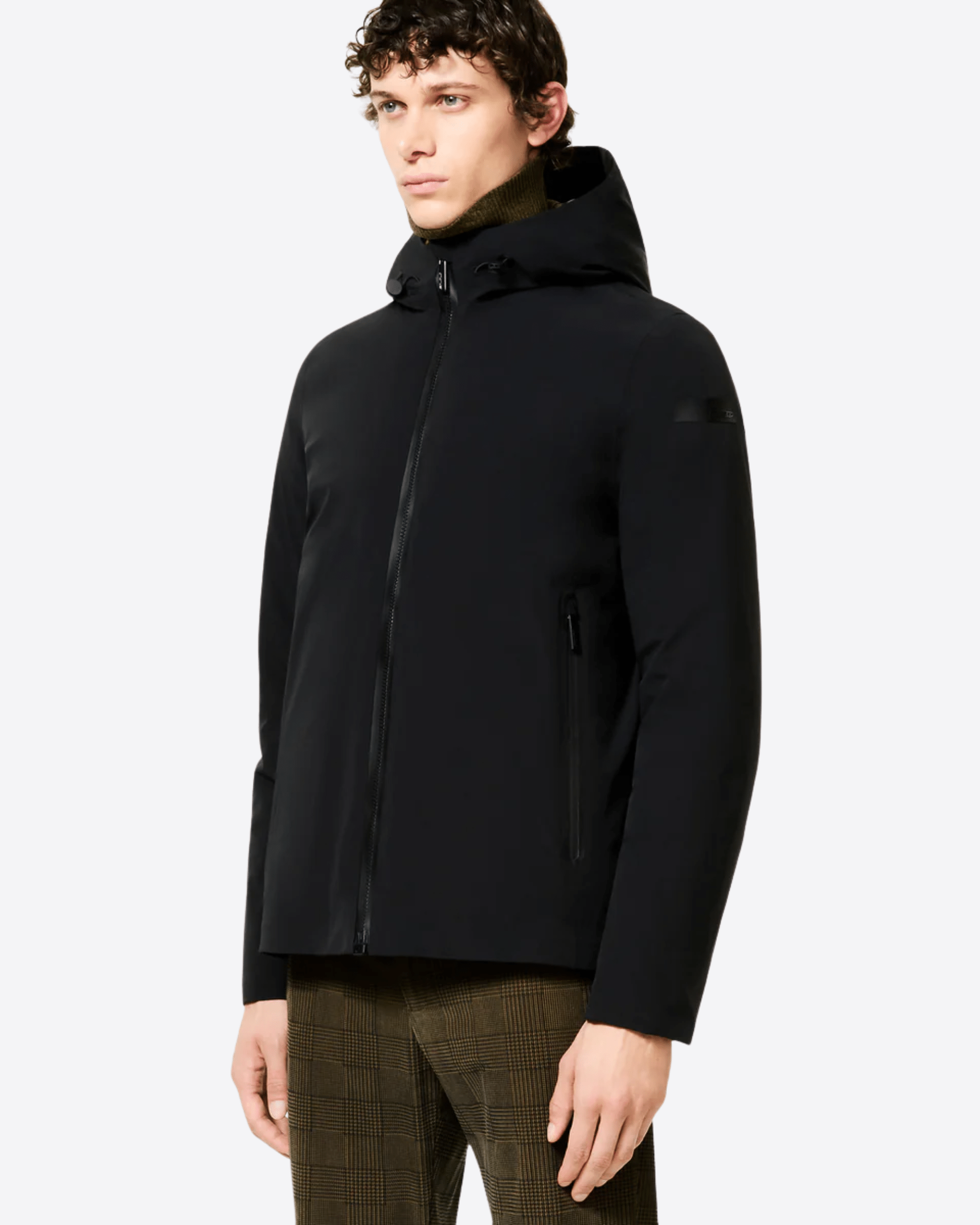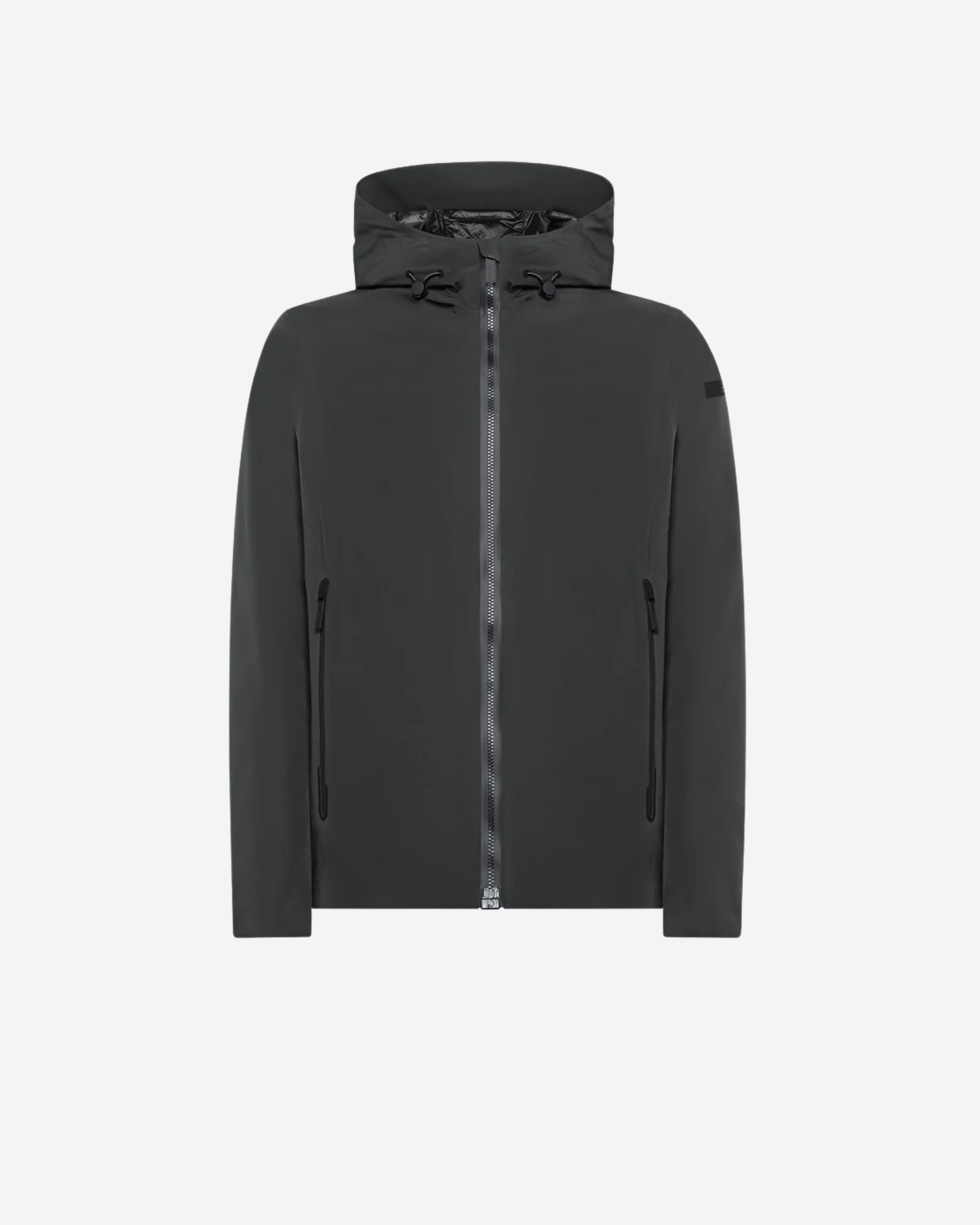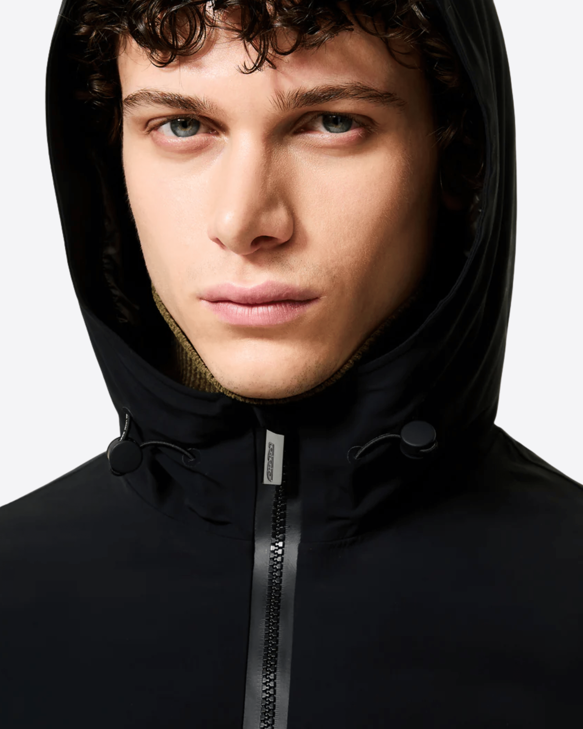 La tradizionale giacca cerata fisherman si evolve in una giacca invernale agile e contemporanea, grazie al design minimalista e alla ricerca dei materiali hi-tech. Caldo e leggero da indossare, il capospalla dal fit asciutto si distingue per l'essenzialità dello stile e la raffinatezza della costruzione interamente termonastrata, che la rende a prova di pioggia e di vento. ll tessuto a membrana Stratofabric#3, elasticizzato e traspirante, presenta il look super opaco dell'esterno in Montecristo, che enfatizza la pulizia delle linee. Il davanti è slanciato dalla zip a chiusura magnetica, che sale a chiudere il colletto verticale e il cappuccio avvolgente imbottito, dotato di frontino e regolabile a cordini elastici. Le ampie tasche laterali sono chiuse dalle zip termonastrate. Il calore è assicurato dalla soffice imbottitura in piuma d'anatra 90/10, contenuta nei canali tubici dell'esclusivo sistema Floating Shield, che assicura elevato comfort e una vestibilità perfetta. L'interno presenta un taschino con zip invisibile, impreziosito dal doppio filetto arancione fluo e dall'iconica tag a cuore "Made with love, designed in Tuscany". Il logo a microiniezione nero sulla manica sinistra completa il capospalla versatile e performante.