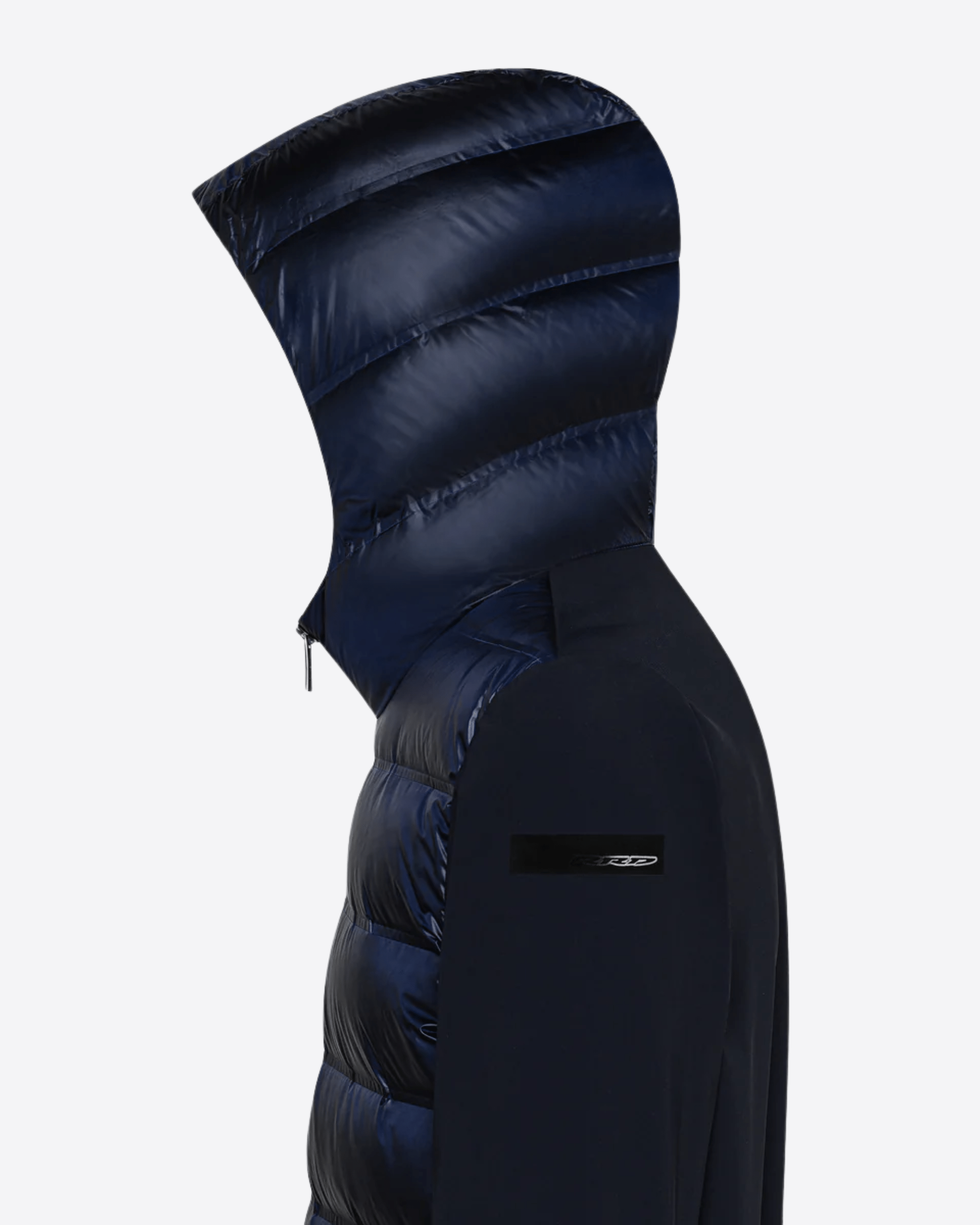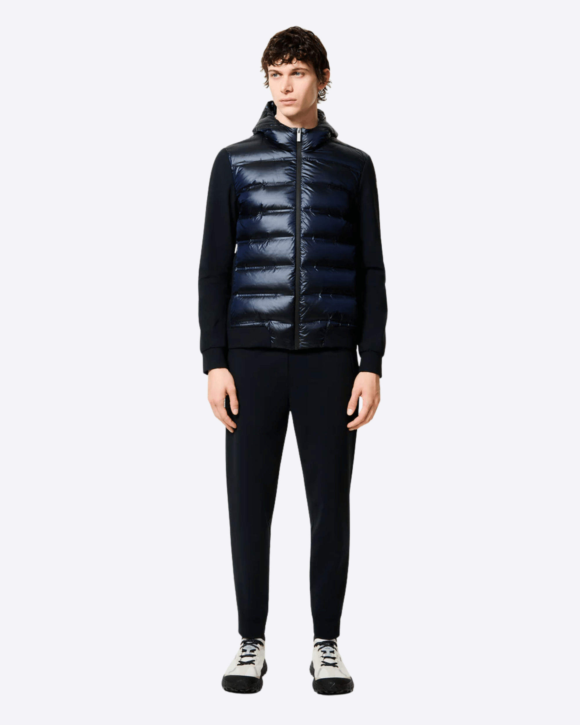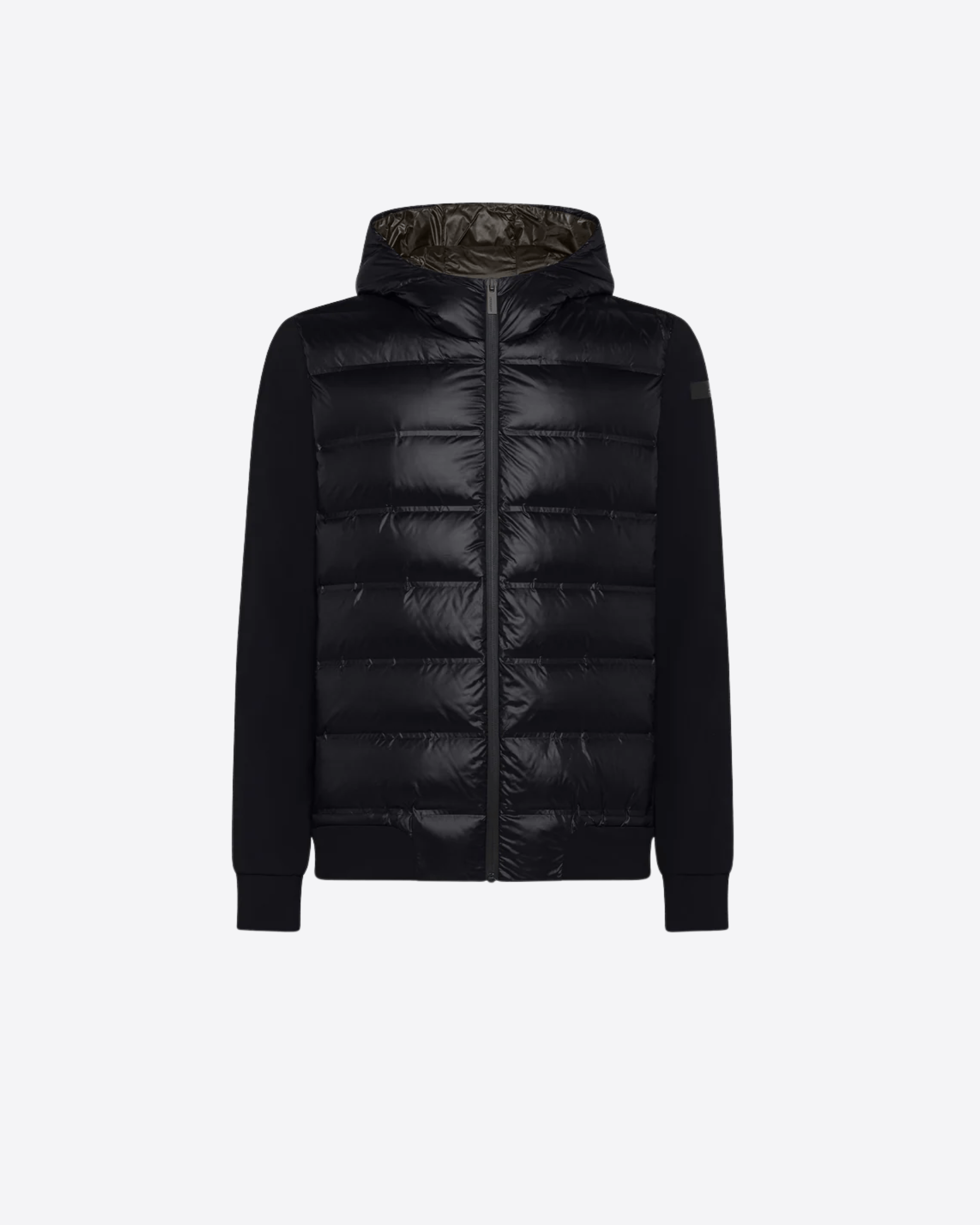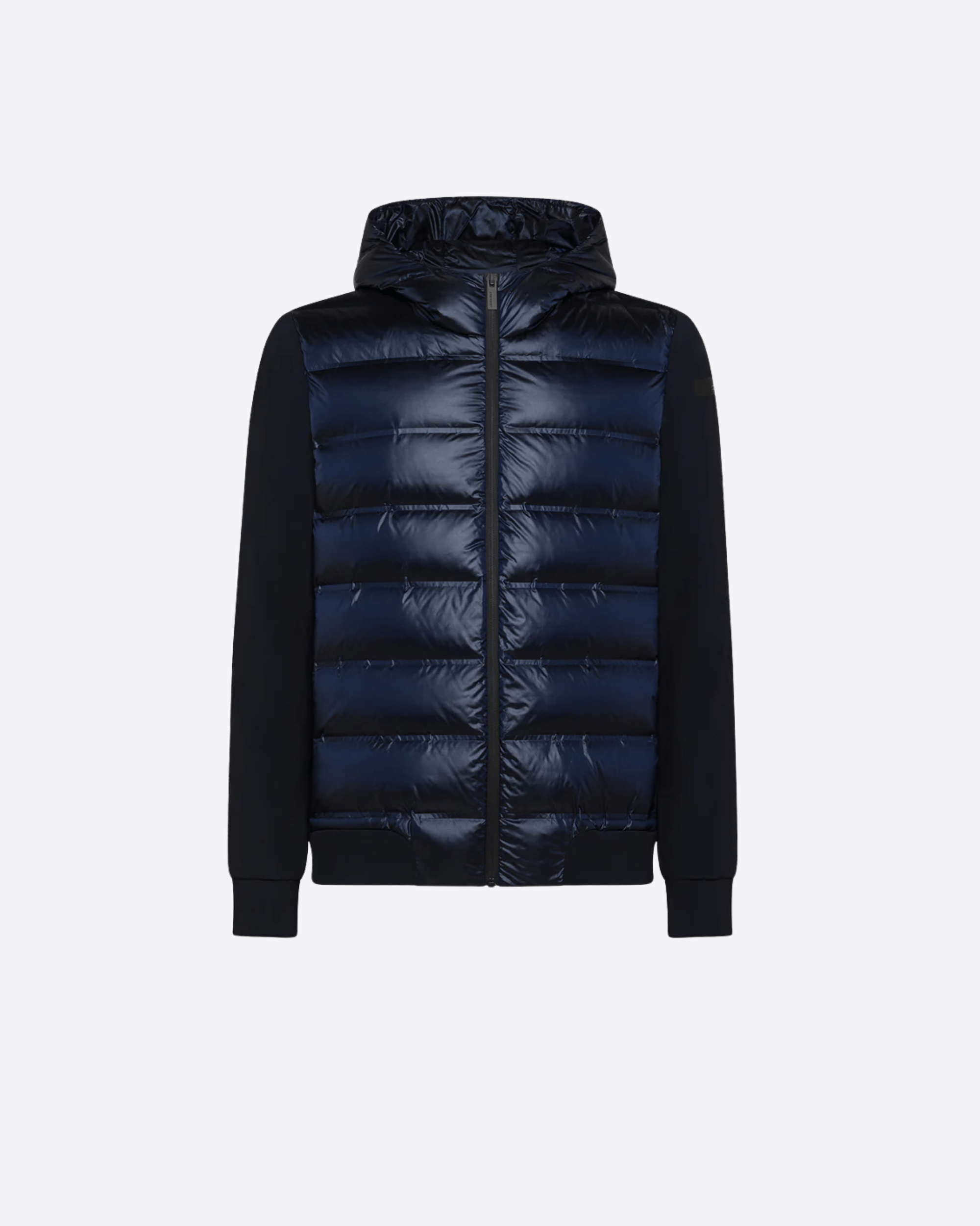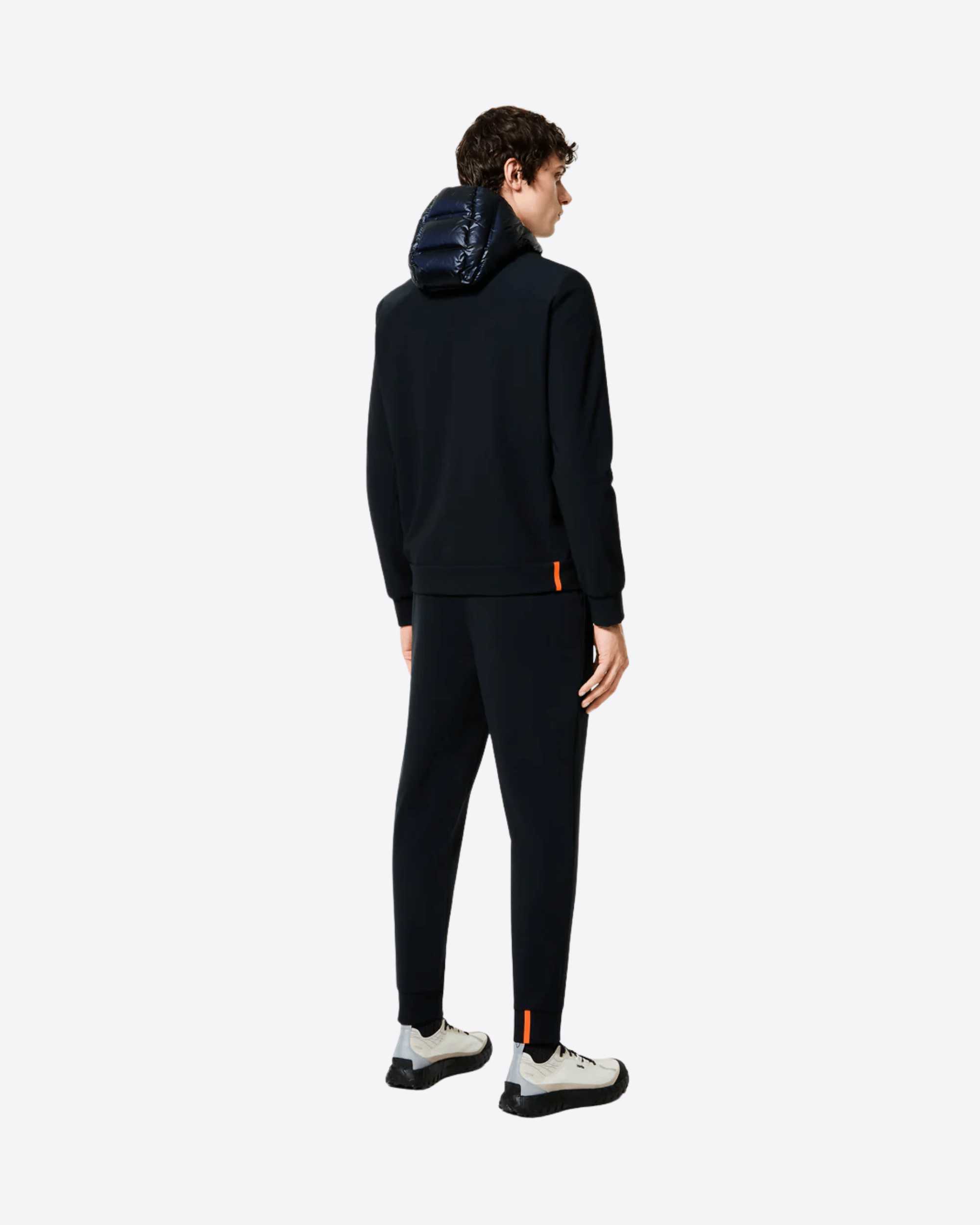 Questa soft jacket con cappuccio imbottito interpreta con stile originale il concetto di versatilità contemporanea attraverso una costruzione ibrida e funzionale. Il davanti presenta la texture priva di impunture dei canali tubici, resistenti a vento e pioggia, che contengono la calda e leggera imbottitura in piuma d'anatra 90/10. Il dorso, le maniche, i polsi e il fondo sono realizzati in esclusivo SURFLEX® elasticizzato, dal look super opaco e antipiega. La silhouette è slanciata dalla zip, affiancata dalle tasche laterali con chiusura invisibile, che completano il design dinamico ed essenziale. All'interno, il taschino con zip invisibile è impreziosito dai dettagli distintivi della doppia nastratura arancio fluo e la tag a cuore "Made with love, designed in Tuscany". Il filetto arancione sul retro e il logo a microiniezione nero sulla manica sinistra completano con una nota emblematica la creazione, ideale per vivere la città e il tempo libero con attitudine sportiva e sofisticata.