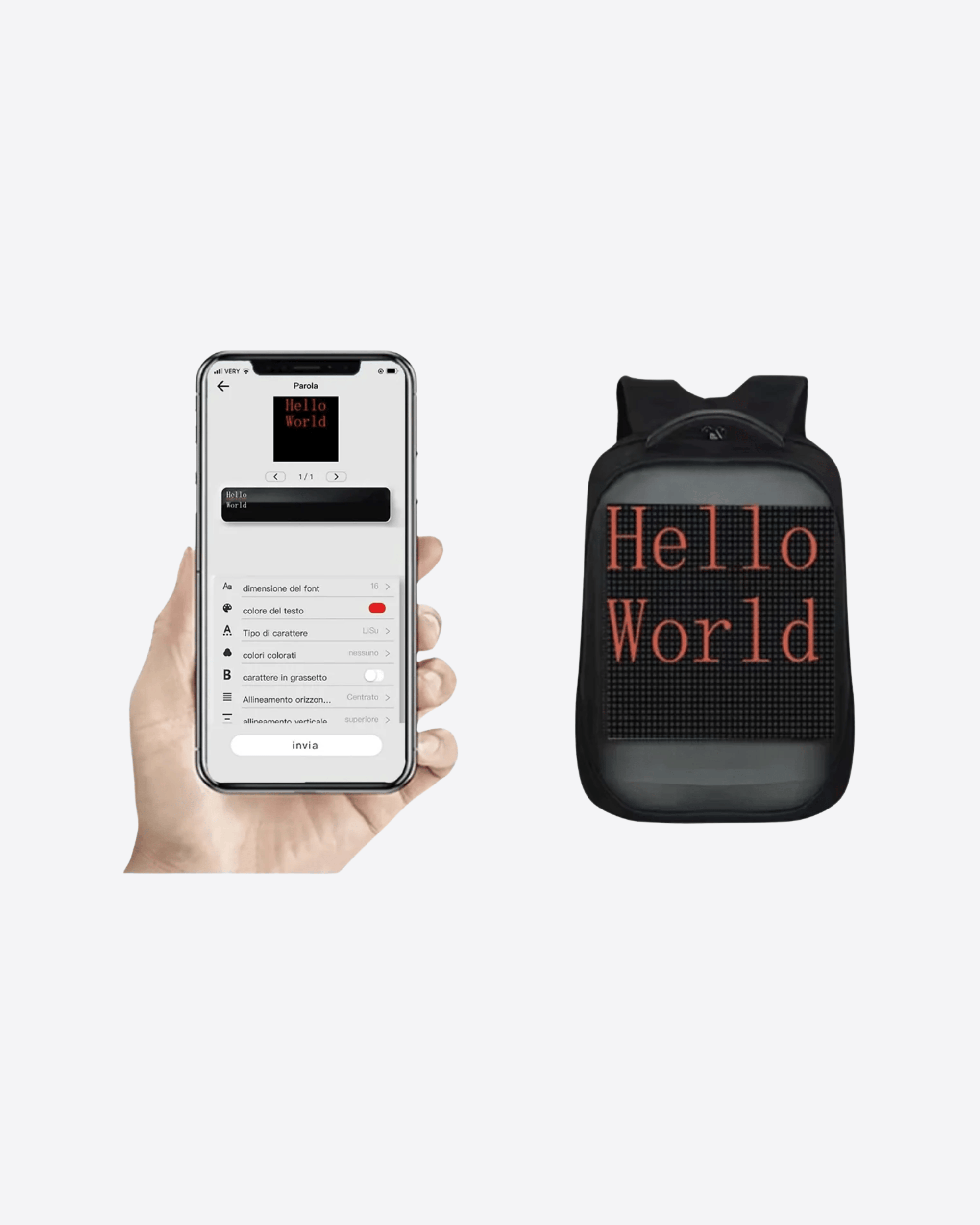 Collega un power bank alla presa USB che trovi all’interno del tuo zaino, scarica l’app LoySpace e connettiti tramite bluetooth al tuo e-bacpack! Ha uno schermo LED ad alta risoluzione 96x128pixel dove puoi proiettare: immagini, gif, foto, testi, emoticon.