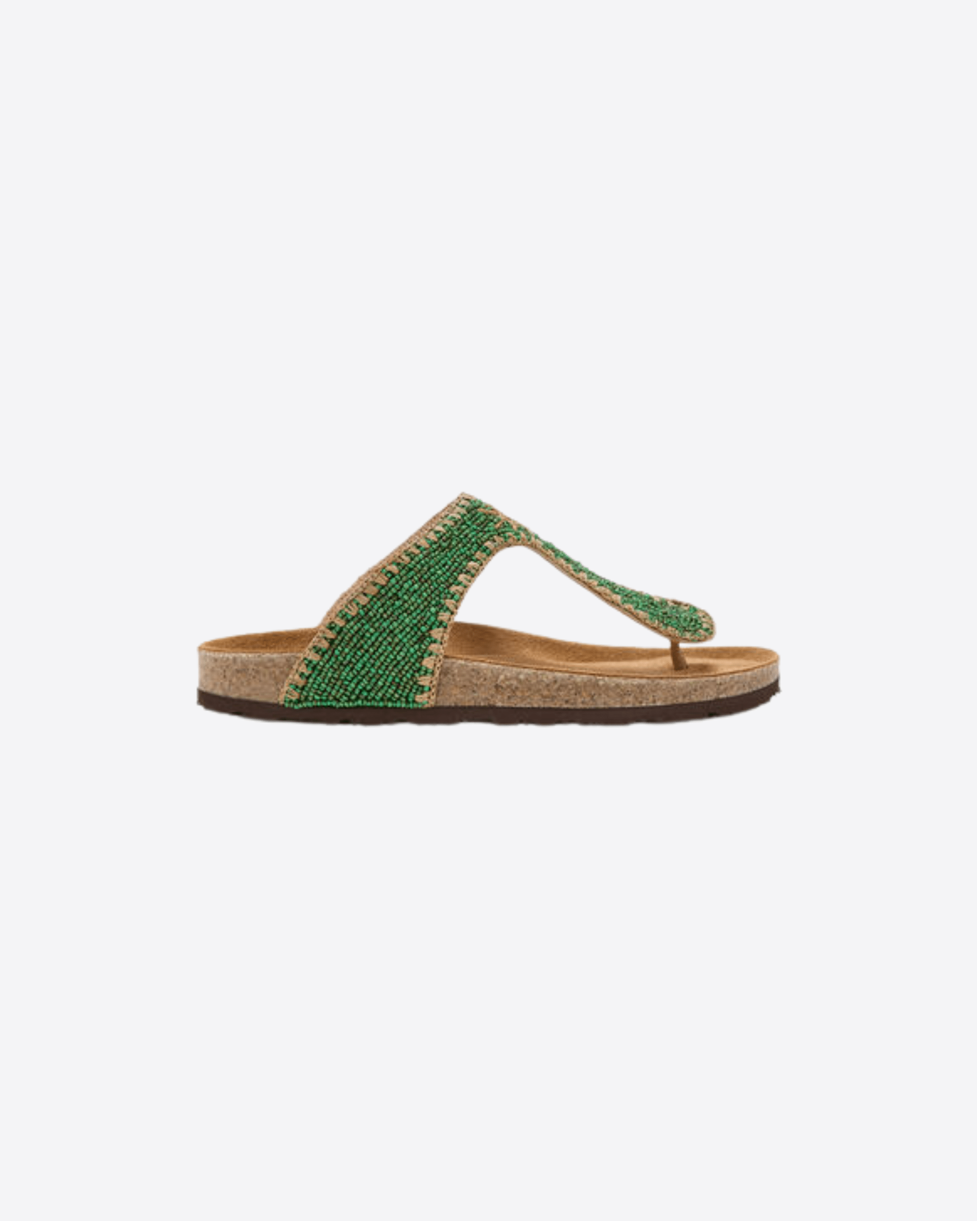 Sandalo Infrabijoux® completamente lavorato a mano con ricamo di perline all over e infilature di rafia fatte a mano, per un look naturale e sofisticato.