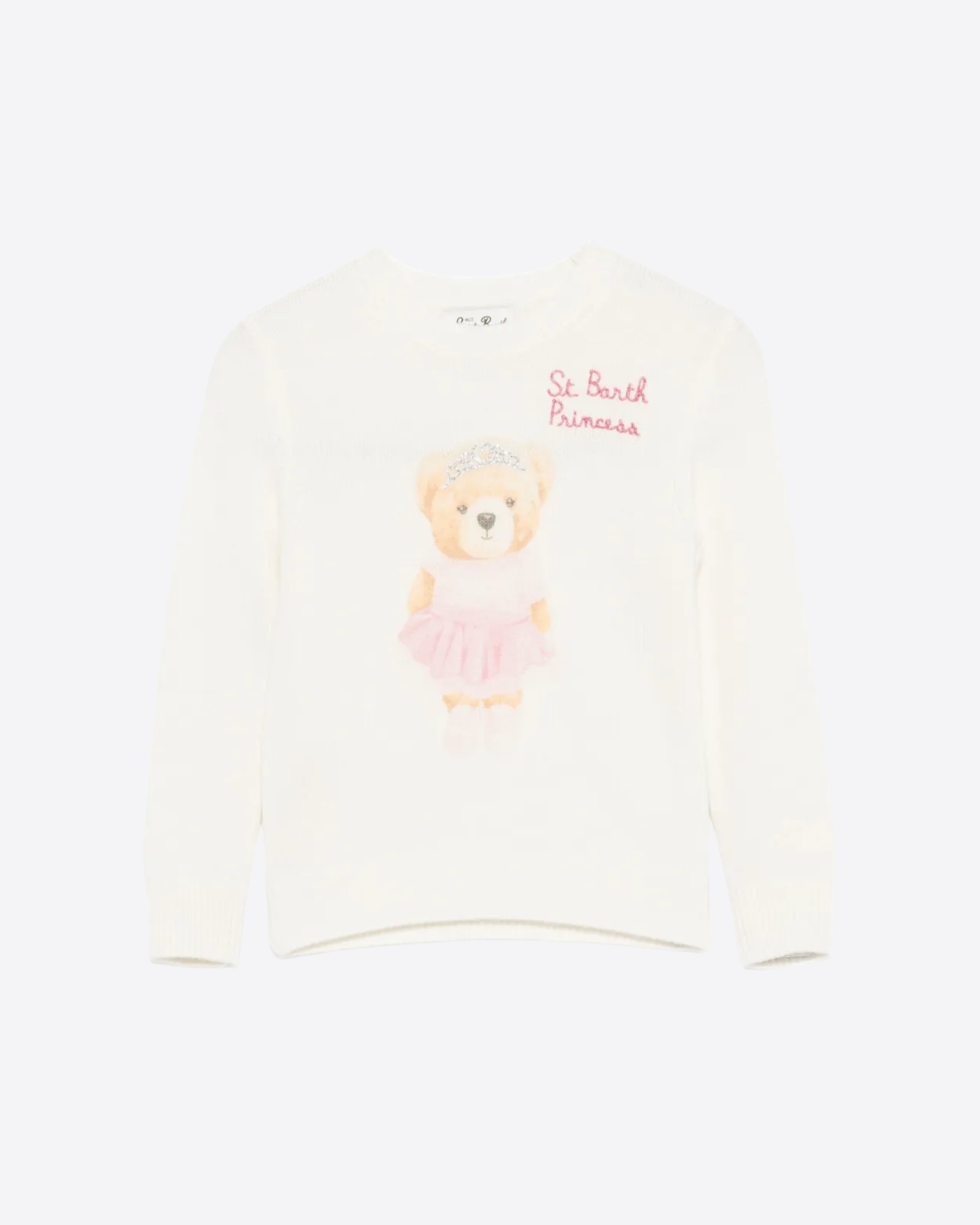 Maglia bianco opaco della collezione bimba di Saint Barth, caratterizzata da girocollo e maniche lunghe. Sul davanti è presente la stampa “Ballerina Bear”, che aggiunge un tocco giocoso e delicato al design. Un capo morbido e versatile, ideale per i look quotidiani delle più piccole.