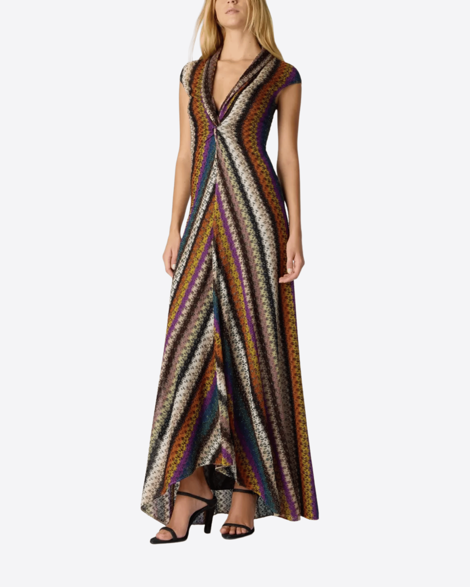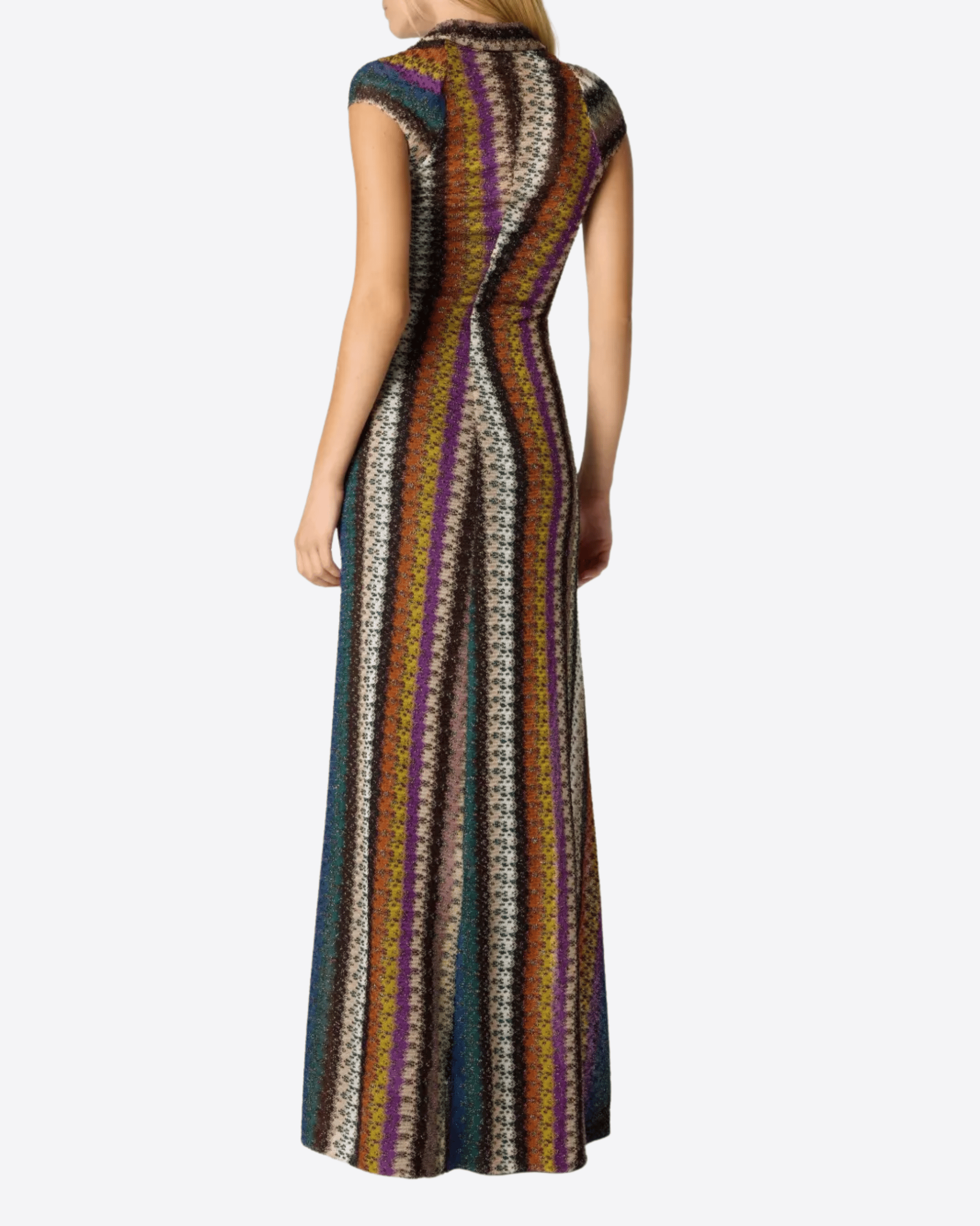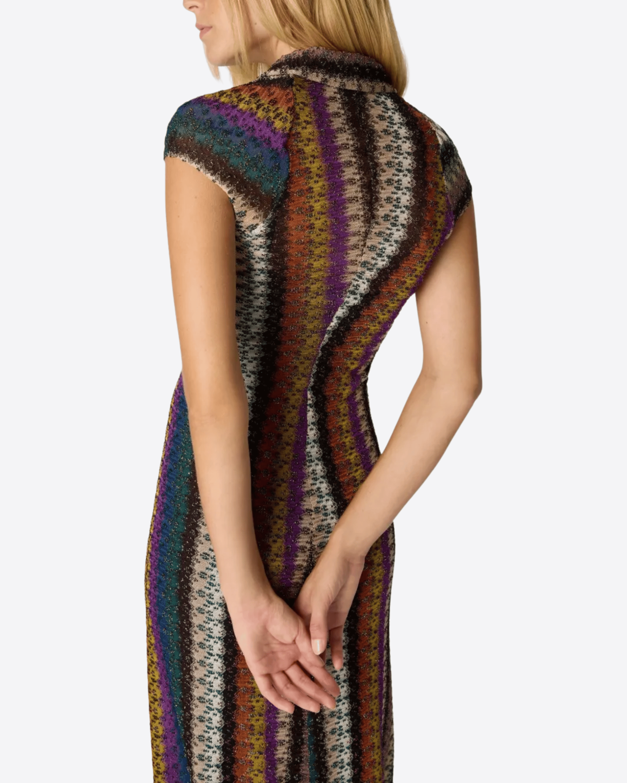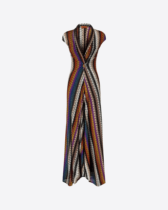 Abito elegante multicolore caratterizzato da un raffinato motivo a righe, maniche corte e scollo a V; un modello sofisticato che unisce armonia cromatica e silhouette femminile, ideale per occasioni speciali o per aggiungere un tocco di classe al guardaroba.