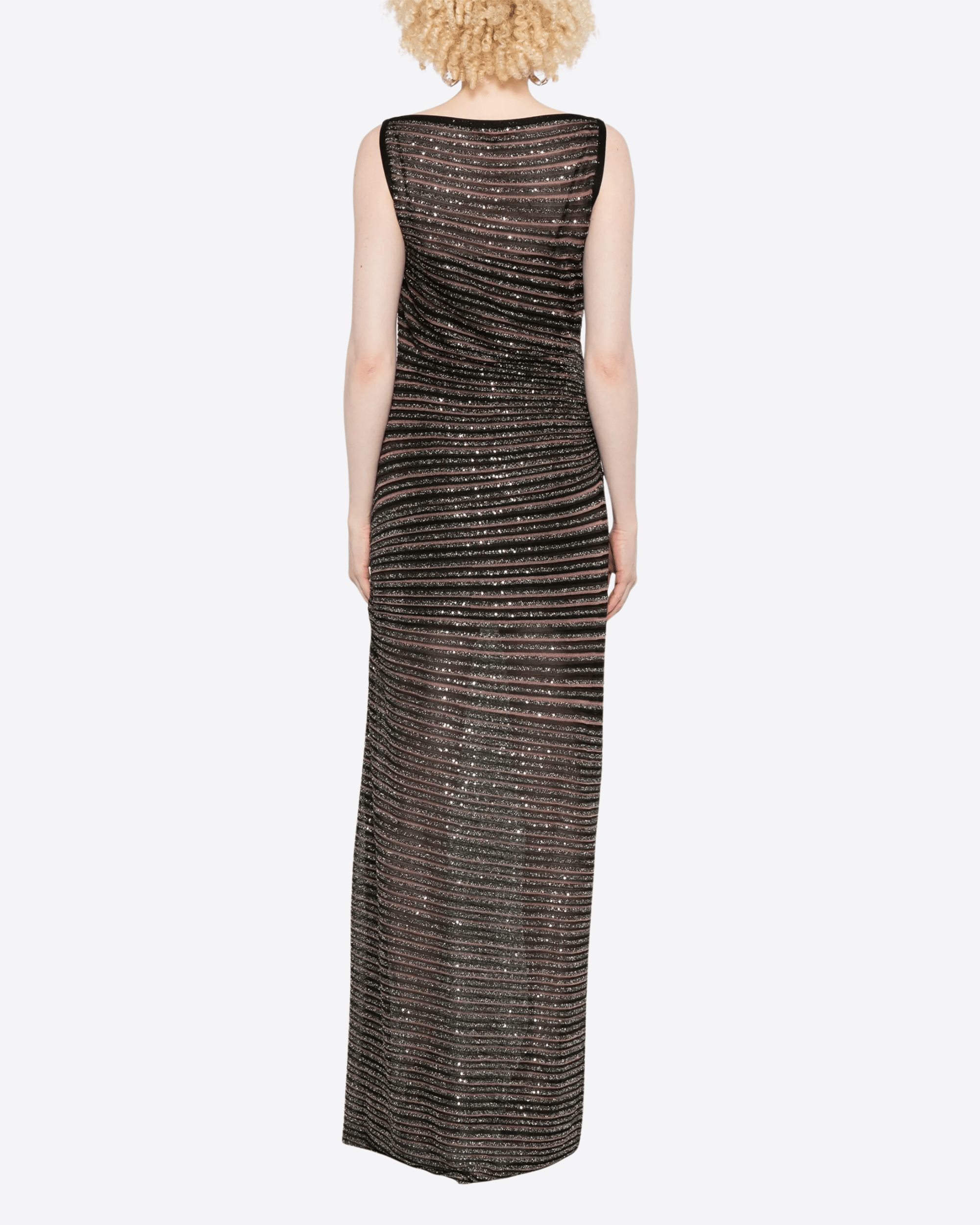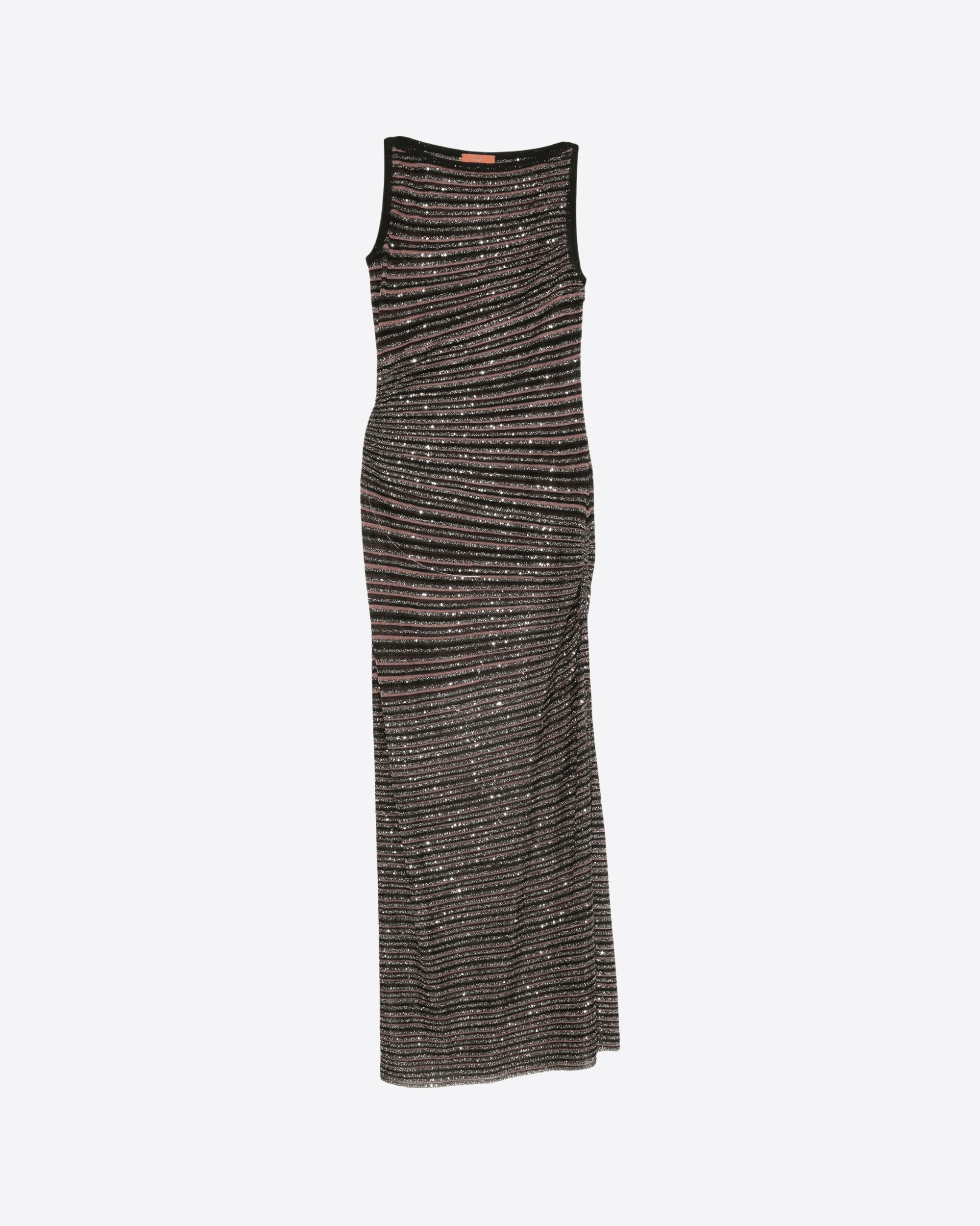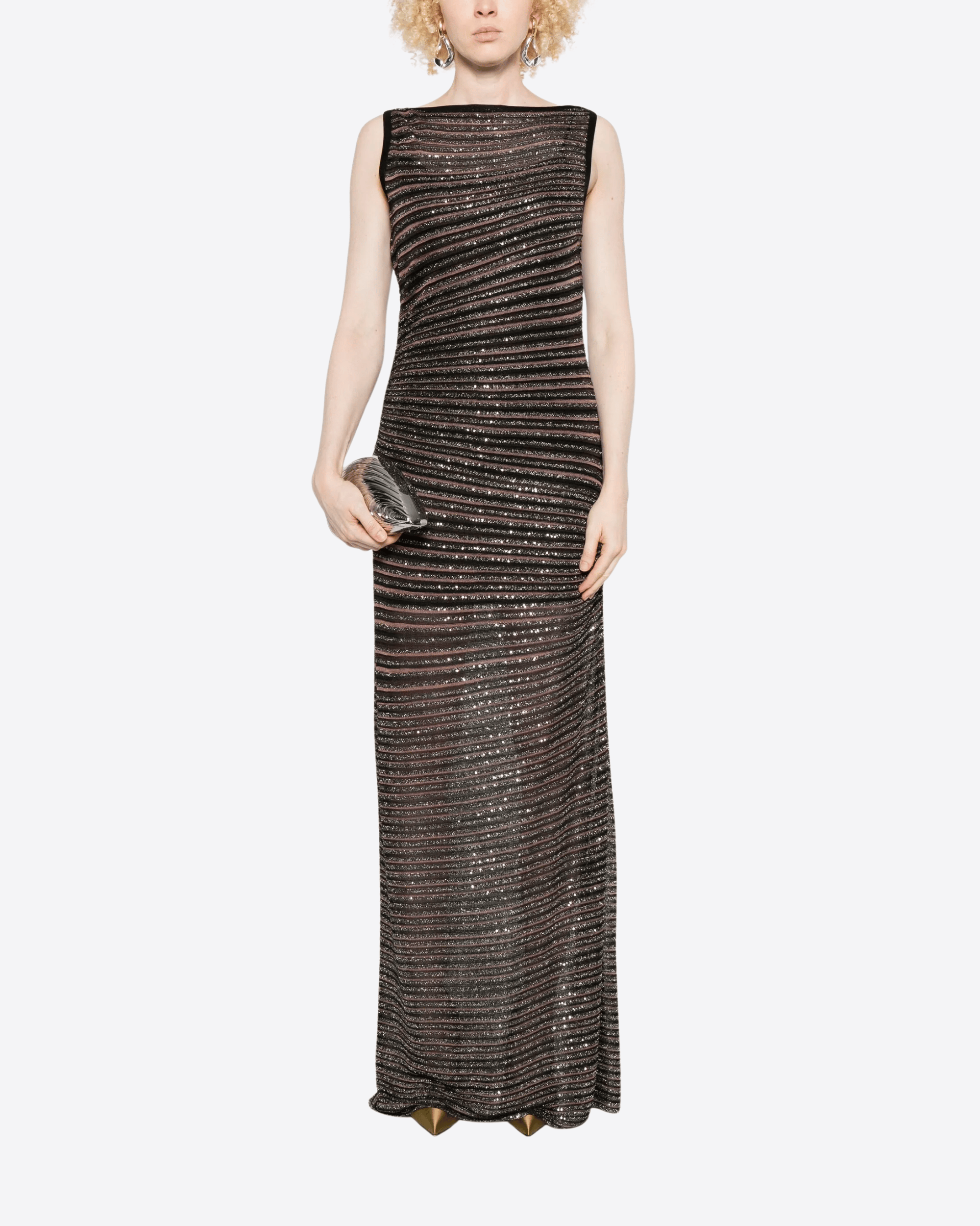 Abito lungo marrone impreziosito da una sofisticata decorazione di paillettes e valorizzato da un elegante dettaglio a righe; un modello senza maniche dalla linea raffinata e fluida, ideale per occasioni serali e momenti speciali che richiedono un look scenografico e luminoso.