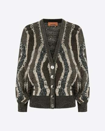 Cardigan multicolour Missoni realizzato nell’iconico mix di tonalità vivaci della Maison, con lavorazione ricercata che esalta il motivo multicolore e dona movimento al capo; un modello versatile e dall’allure sofisticata, perfetto per aggiungere un tocco distintivo e contemporaneo a qualsiasi look quotidiano o serale.