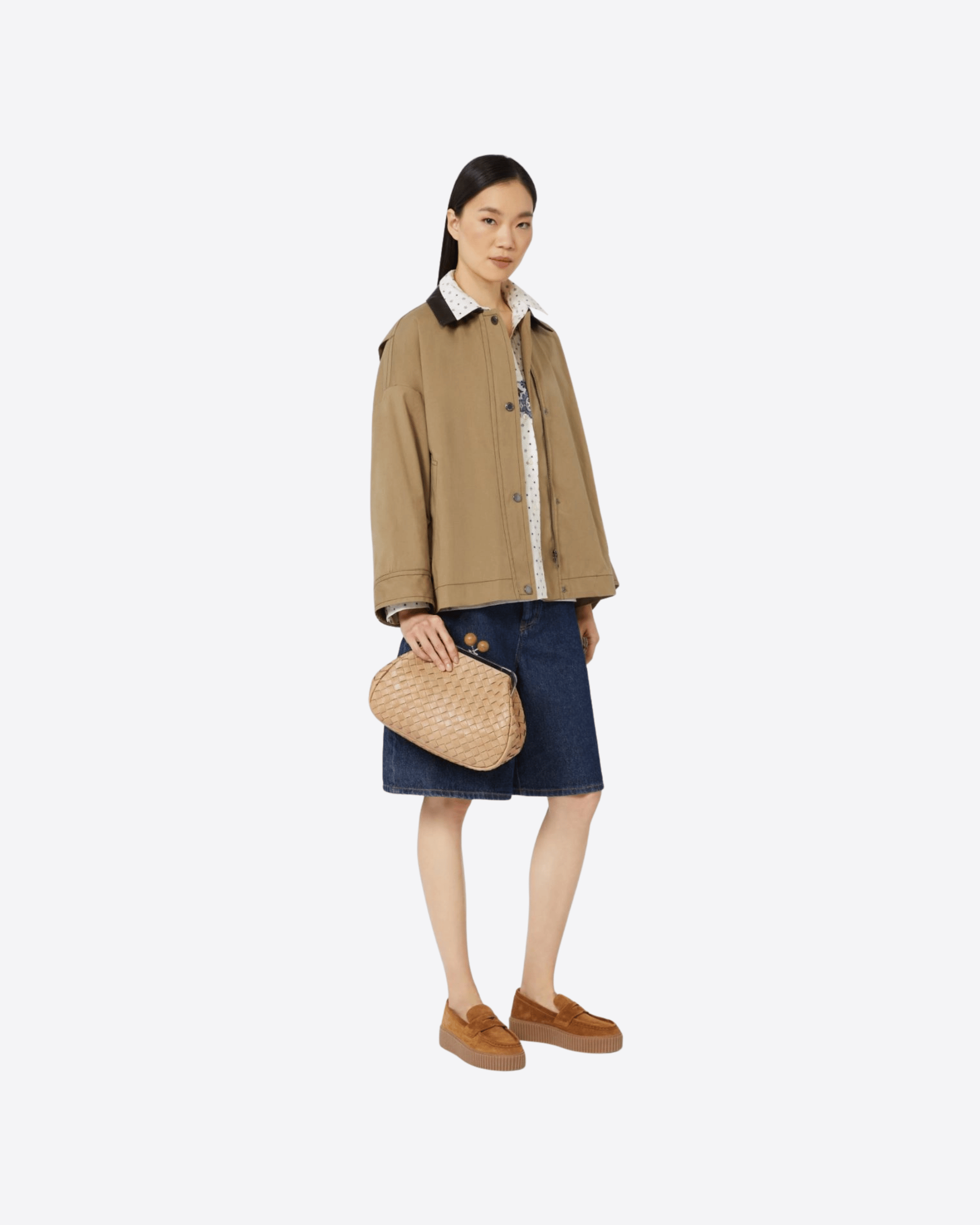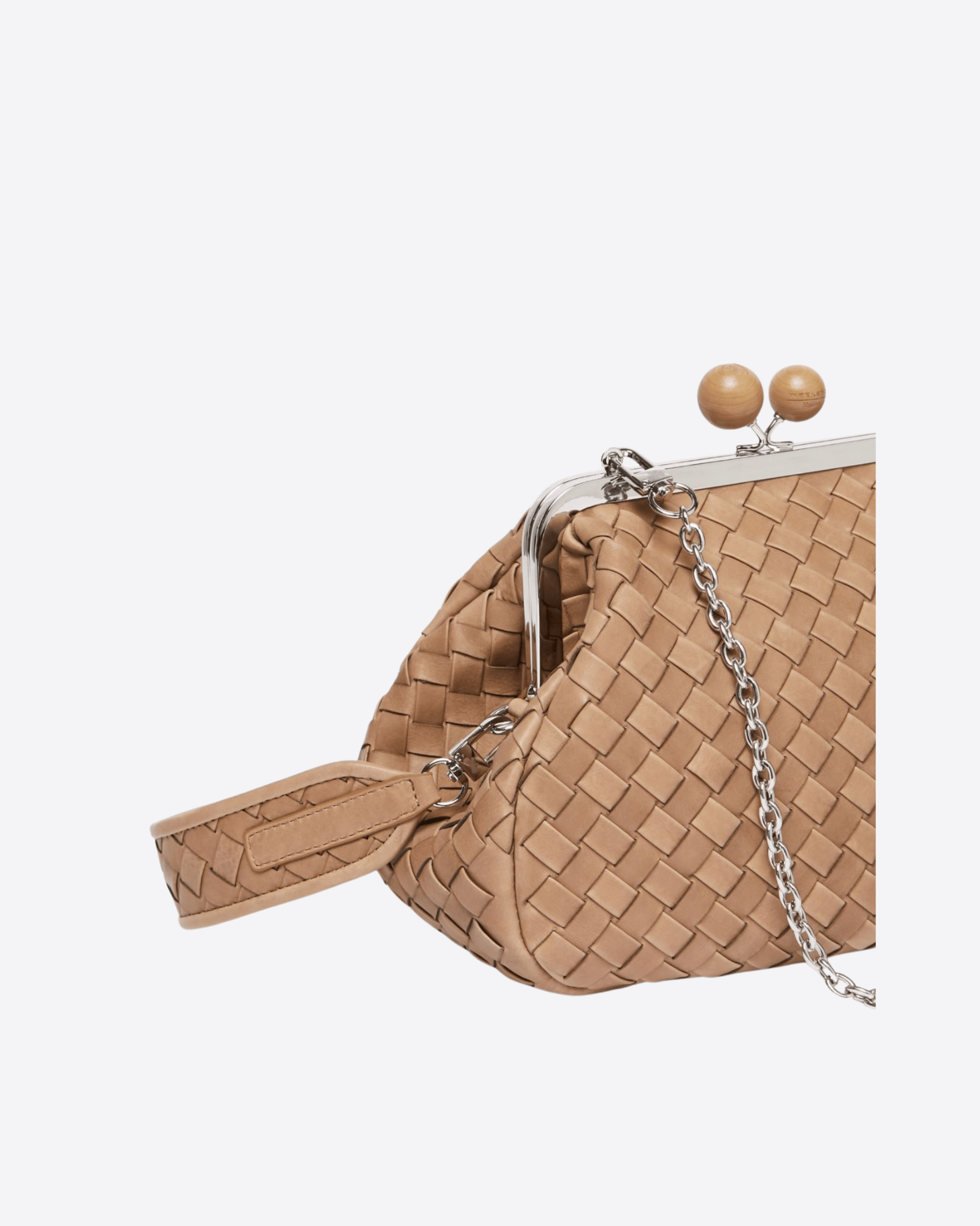 Dotata di doppia tracolla rimovibile: una corta in pelle intrecciata e una lunga a catena con spallaccio, entrambe applicabili sia ai lati sia in testa. La chiusura metallica con iconiche sfere personalizzate effetto legno aggiunge un elemento distintivo.