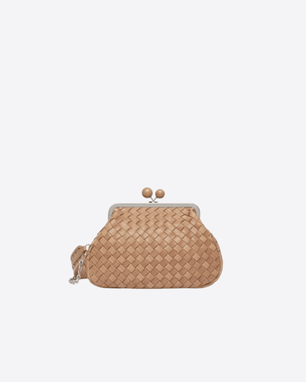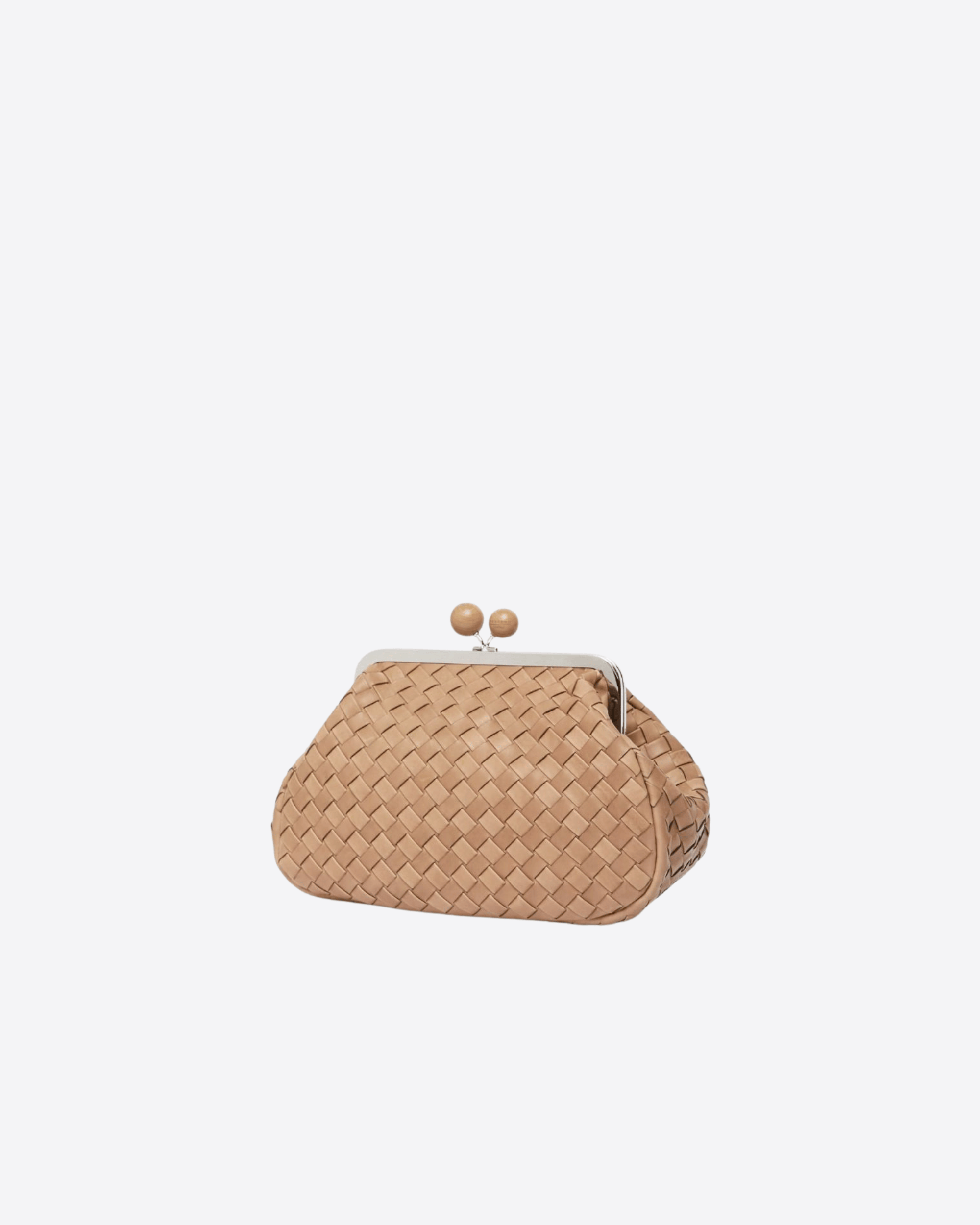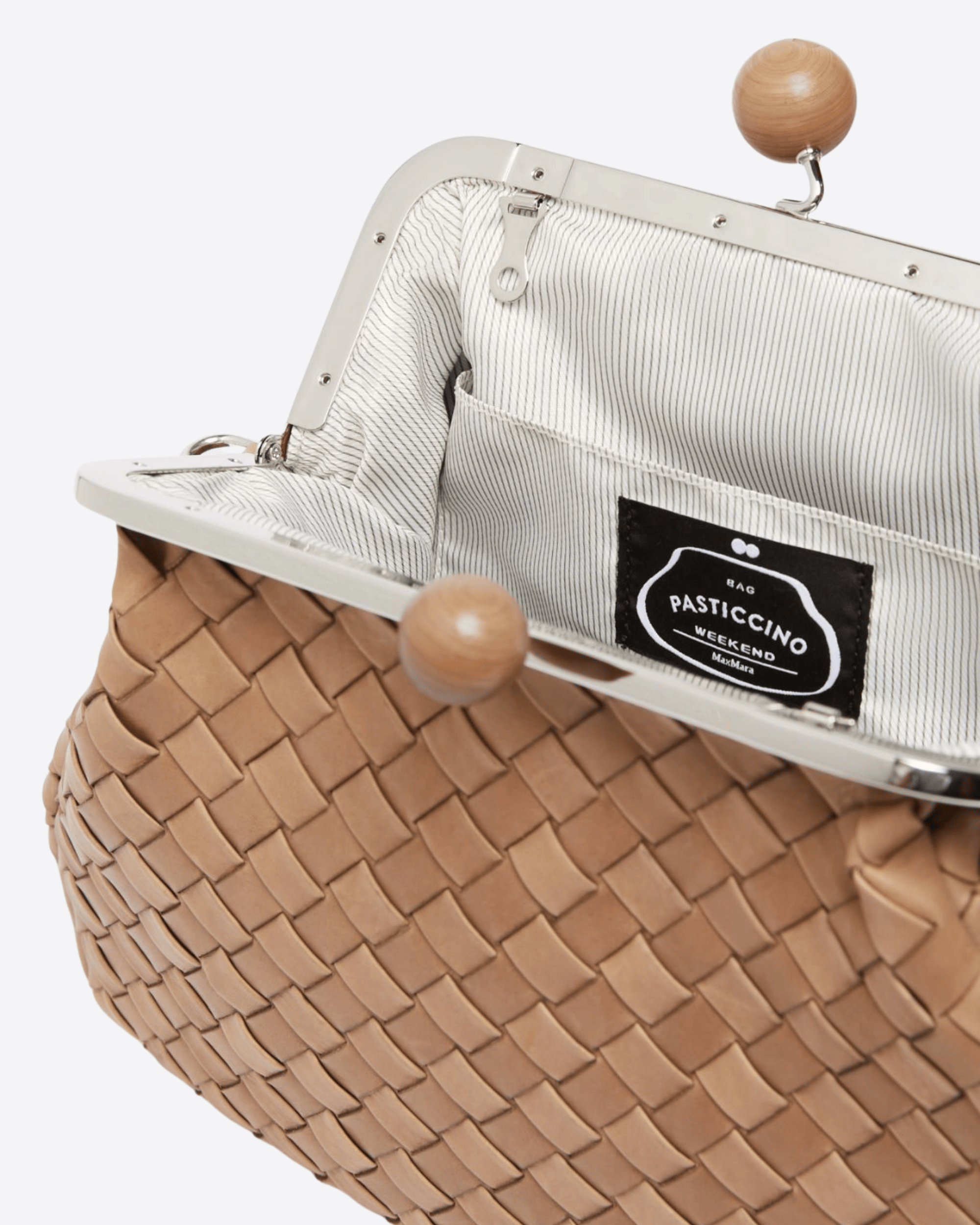Pasticcino Bag Medium, la super clutch che aggiunge un tocco personale e affascinante allo stile quotidiano. Realizzata in pelle intrecciata con design strutturato, è completata da fodera interna a righe e da una tasca a toppa con label personalizzata.