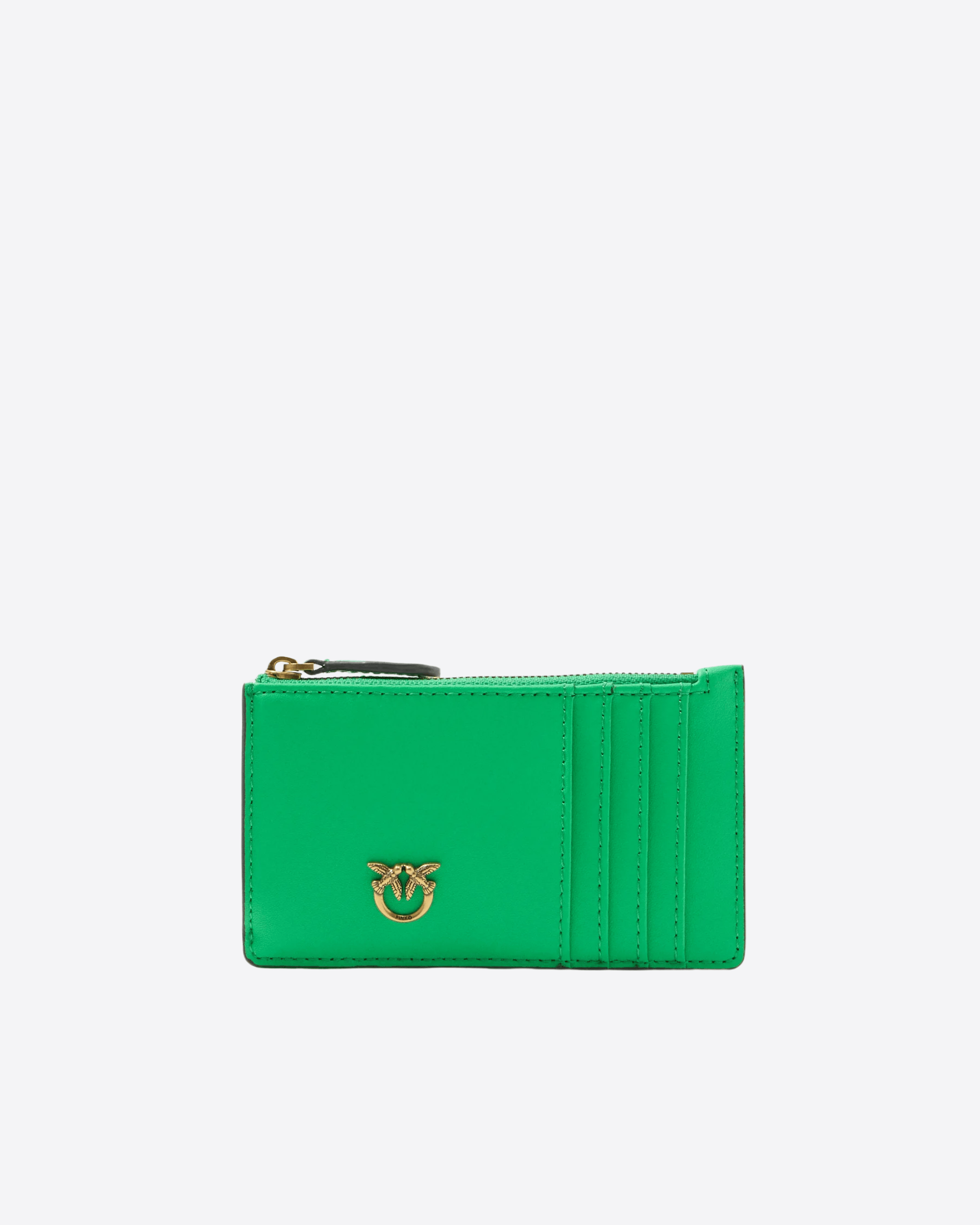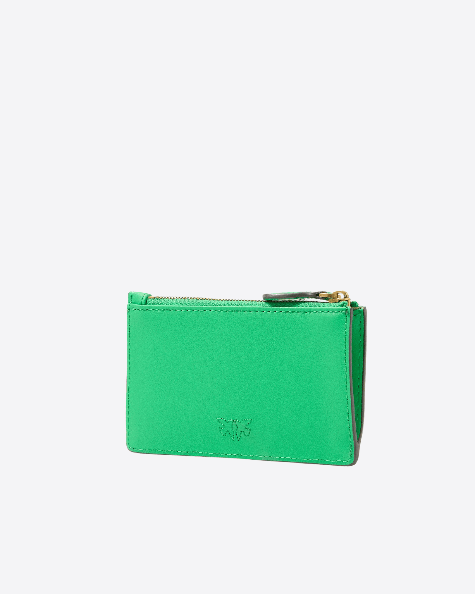 Porta carte di credito in morbida pelle mano seta. Personalizzato con placchetta in metallo logo Love Birds Diamond Cut. L'interno è foderato in polycotton. Chiusura con zip.