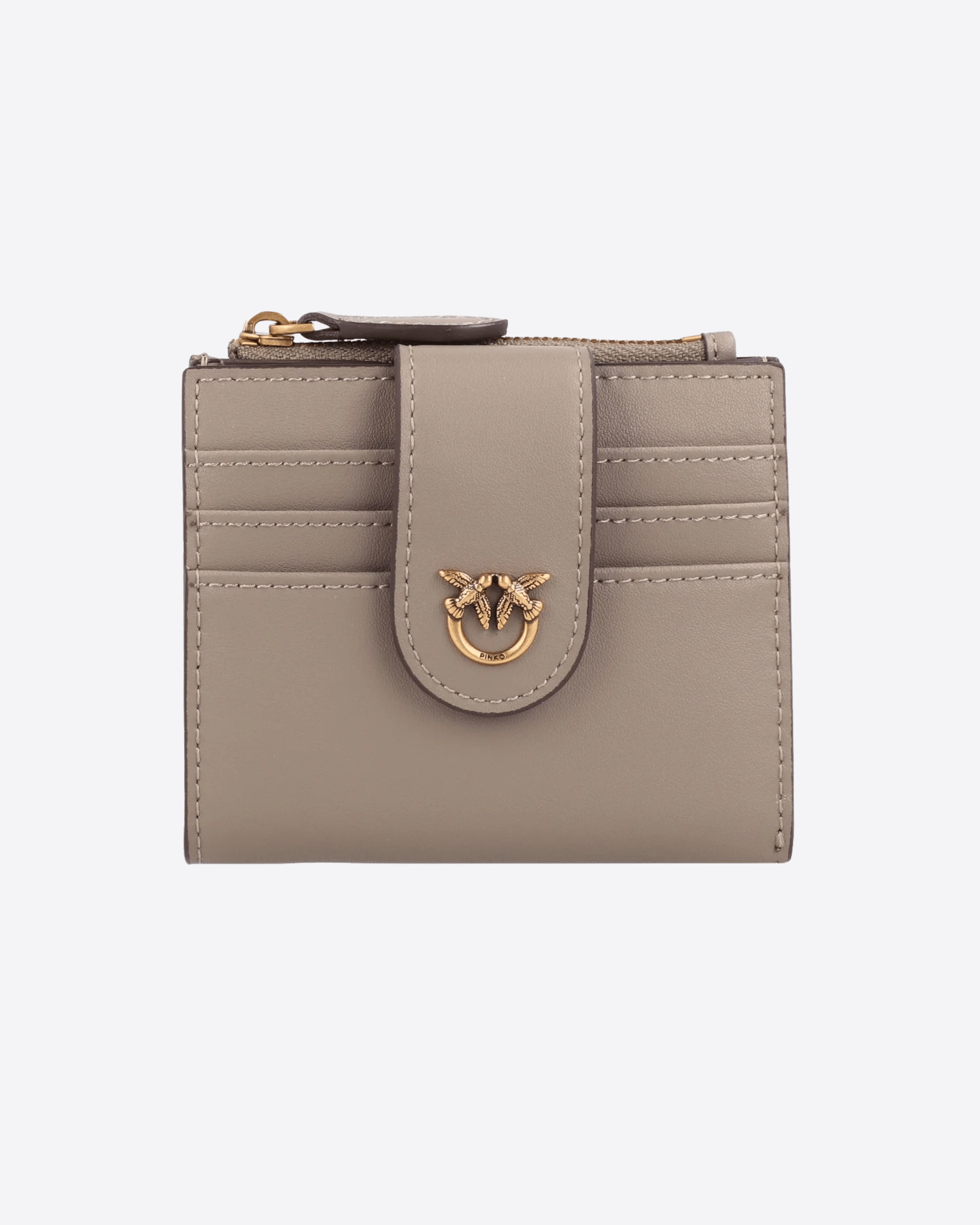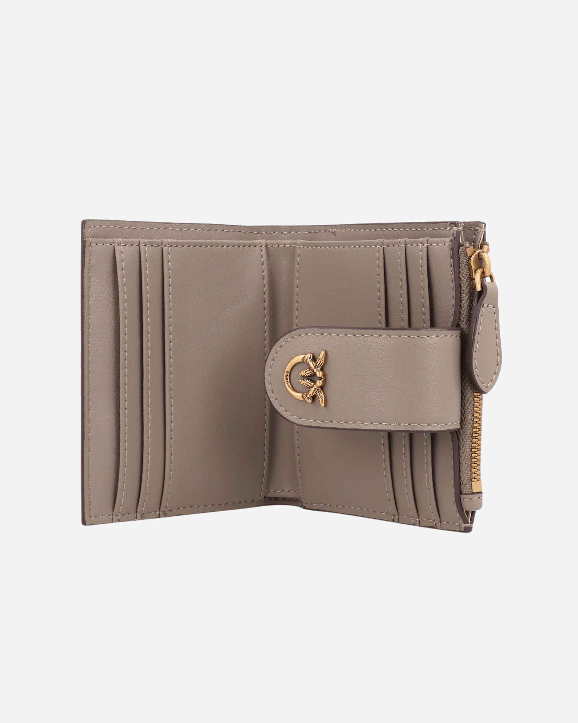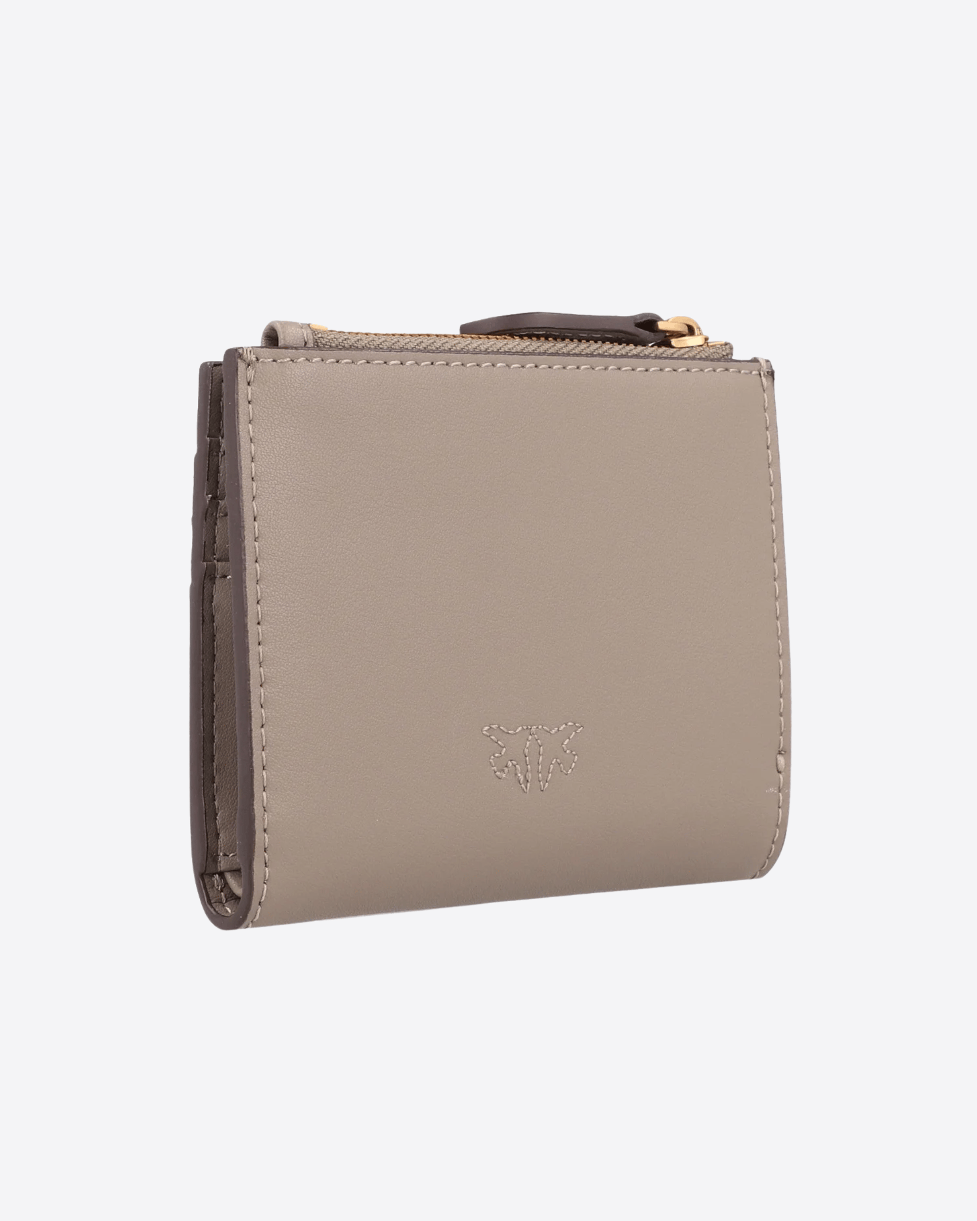 Portafoglio zip-around in nappa con trapuntatura pattern chevron personalizzato con placchetta Love Birds Diamond Cut su base in pelle. L'interno è foderato in microfibra ed è diviso in quattro scomparti, di cui uno chiuso con zip e due con spazi per carte di credito.