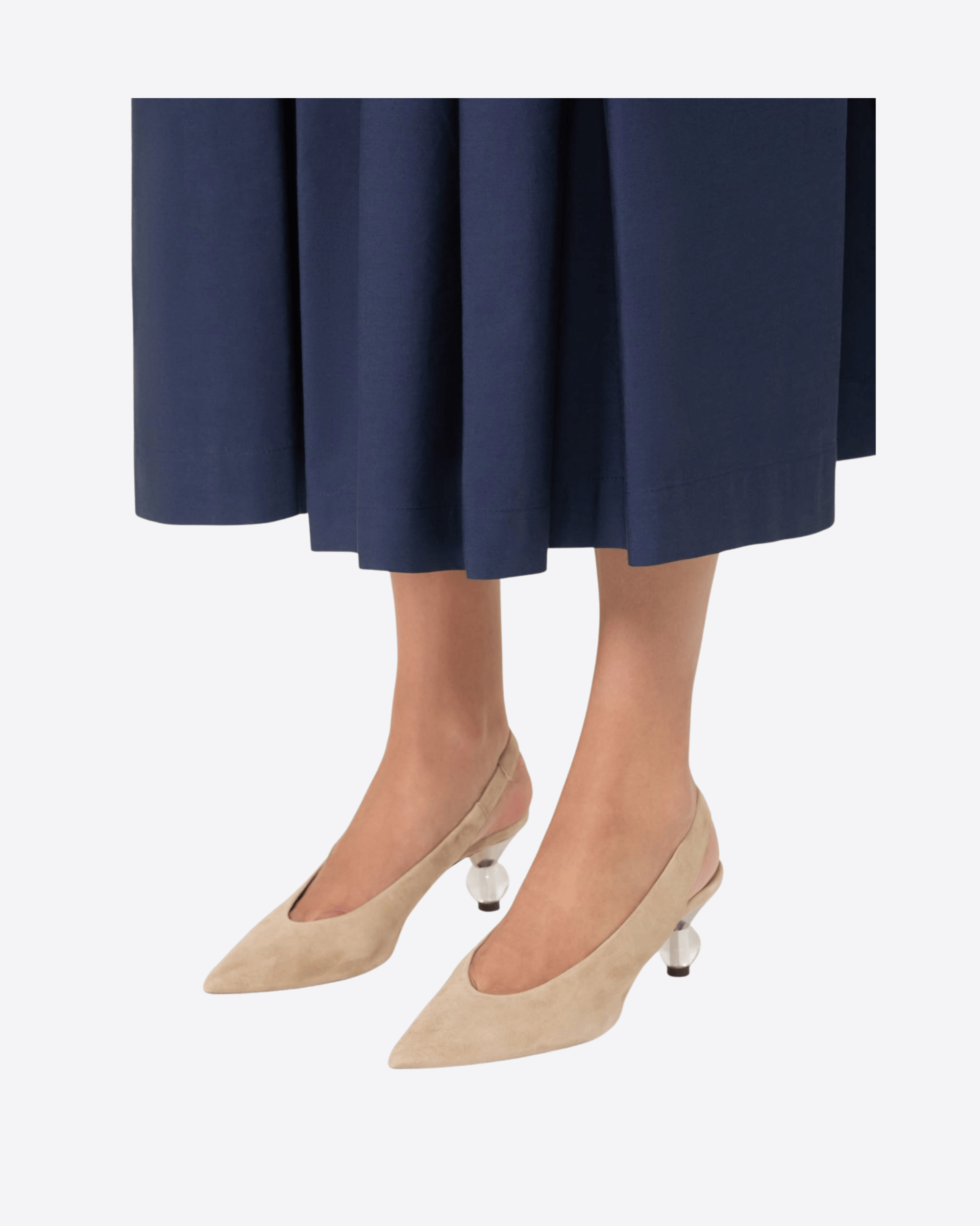 Décolleté slingback in pelle scamosciata, caratterizzata dal distintivo tacco boule ispirato all’iconica linea di borse Pasticcino Bag, logato e in tono con la scarpa. La fodera in morbida nappa di agnello assicura comfort elevato, mentre la suola in cuoio garantisce una calzata stabile e raffinata. Altezza tacco 5,5 cm.